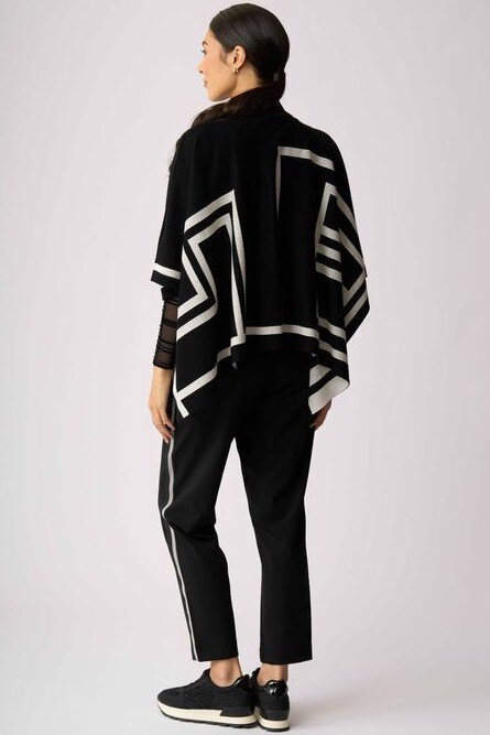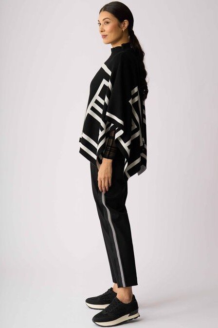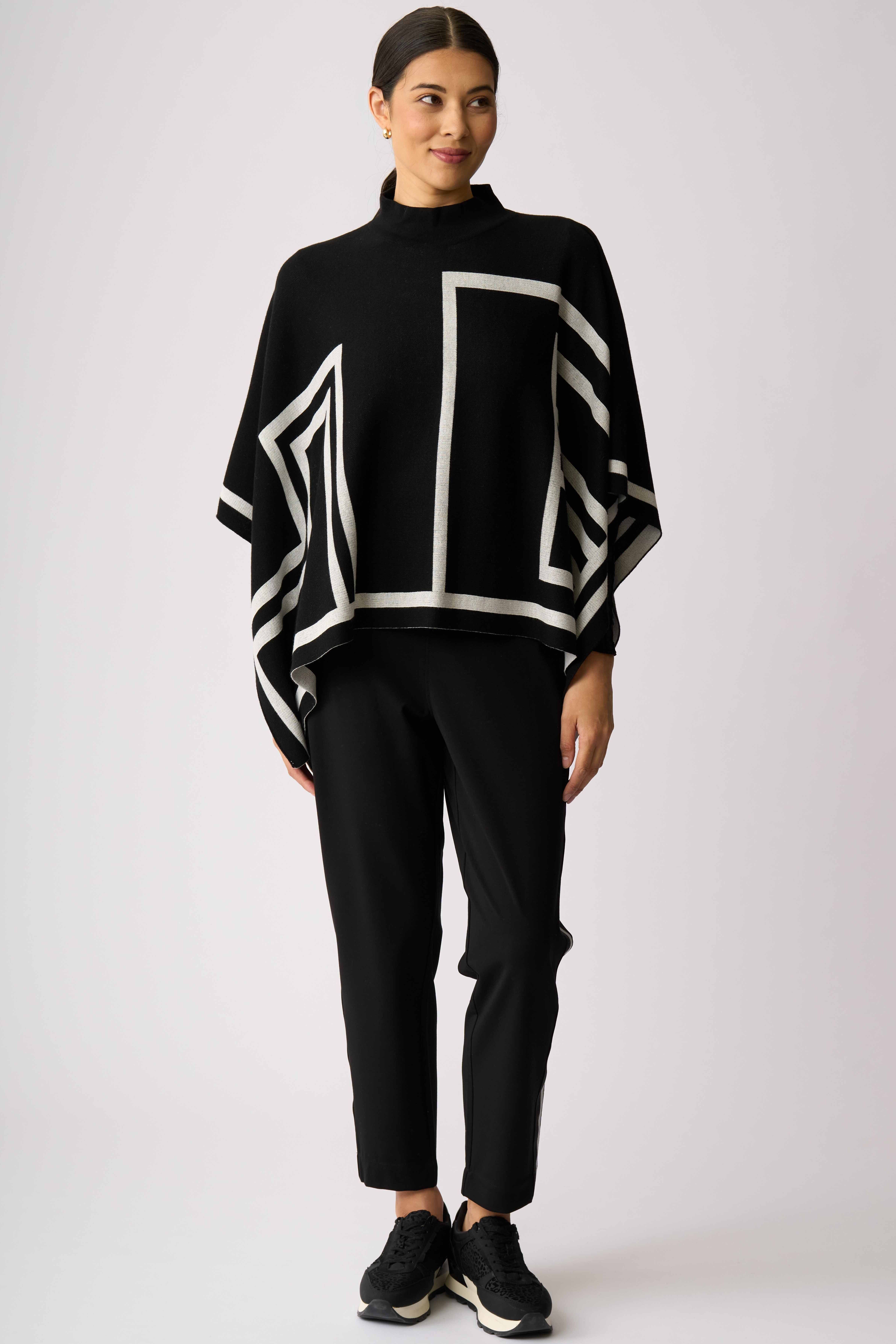 Ready to go poncho with a high neck and monochrome abstract design.Composition: 60% Viscose, 40% Cotton