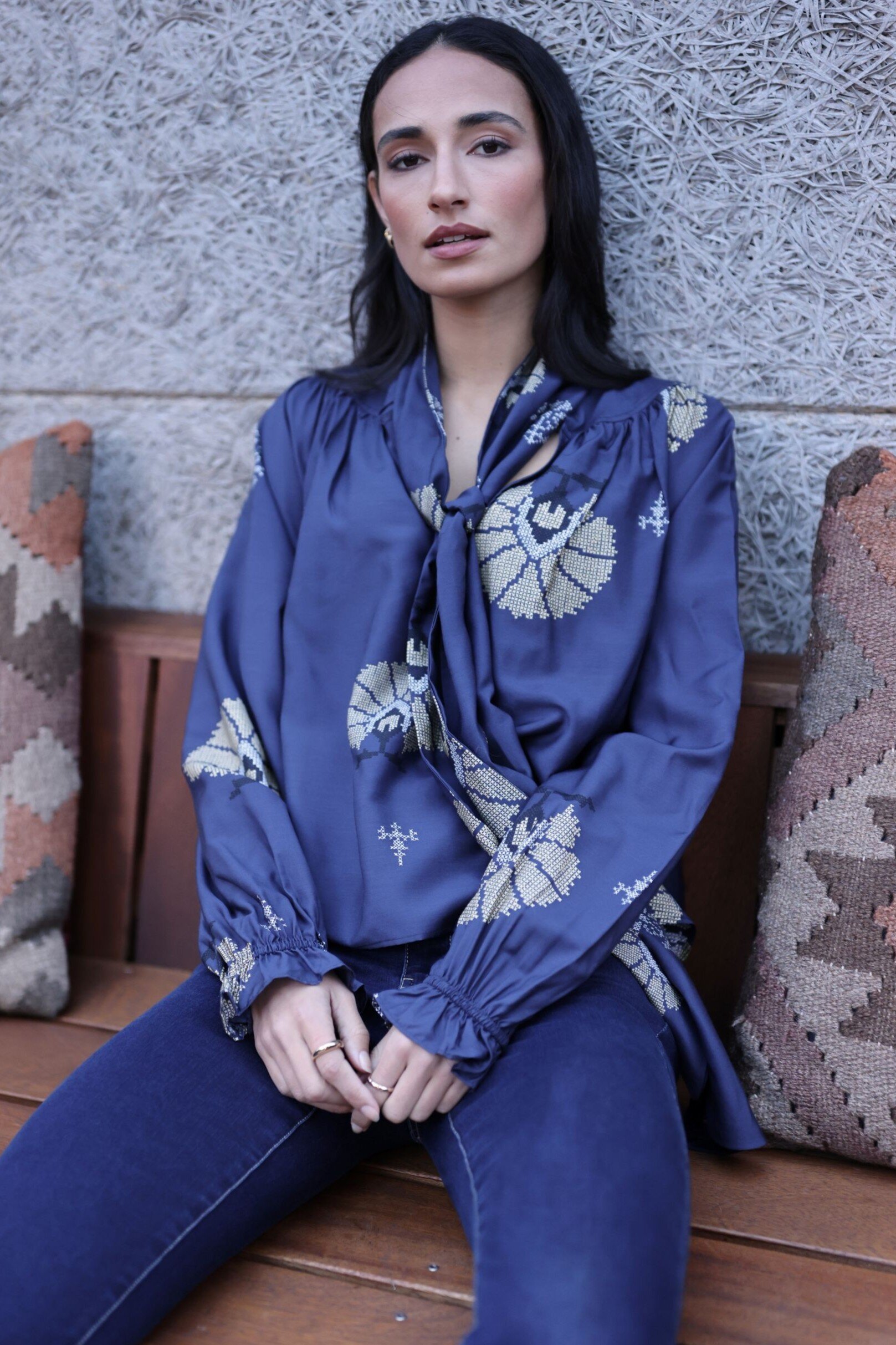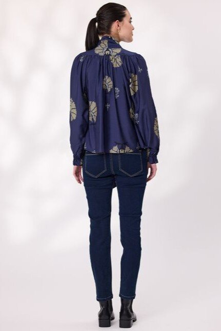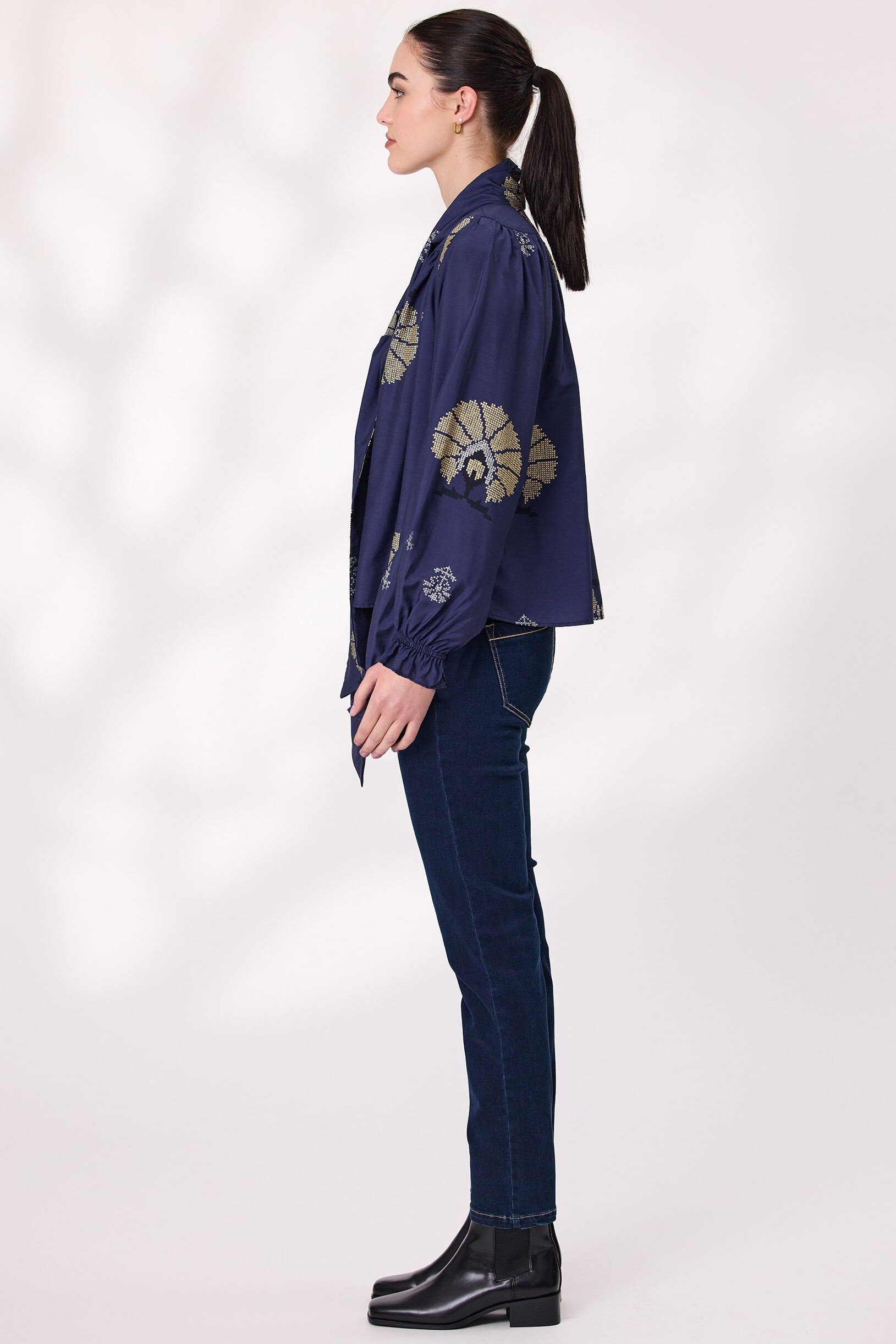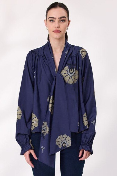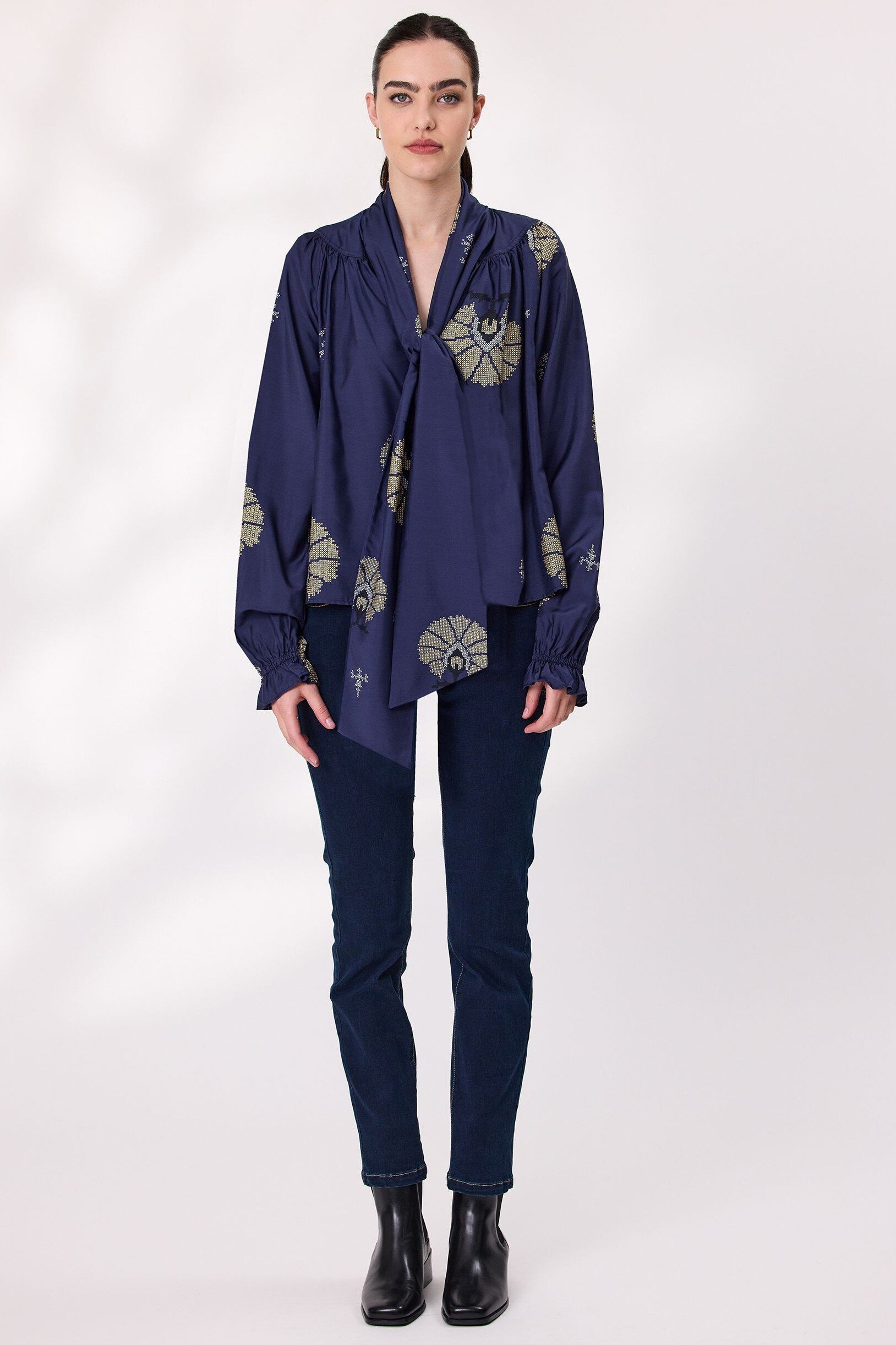 Add a touch of whimsy to your wardrobe with this ace-printed top, crafted from soft viscose for a lightweight, breathable feel. Featuring long sleeves with elasticated cuffs and delicate front ties, this piece blends comfort with charm.