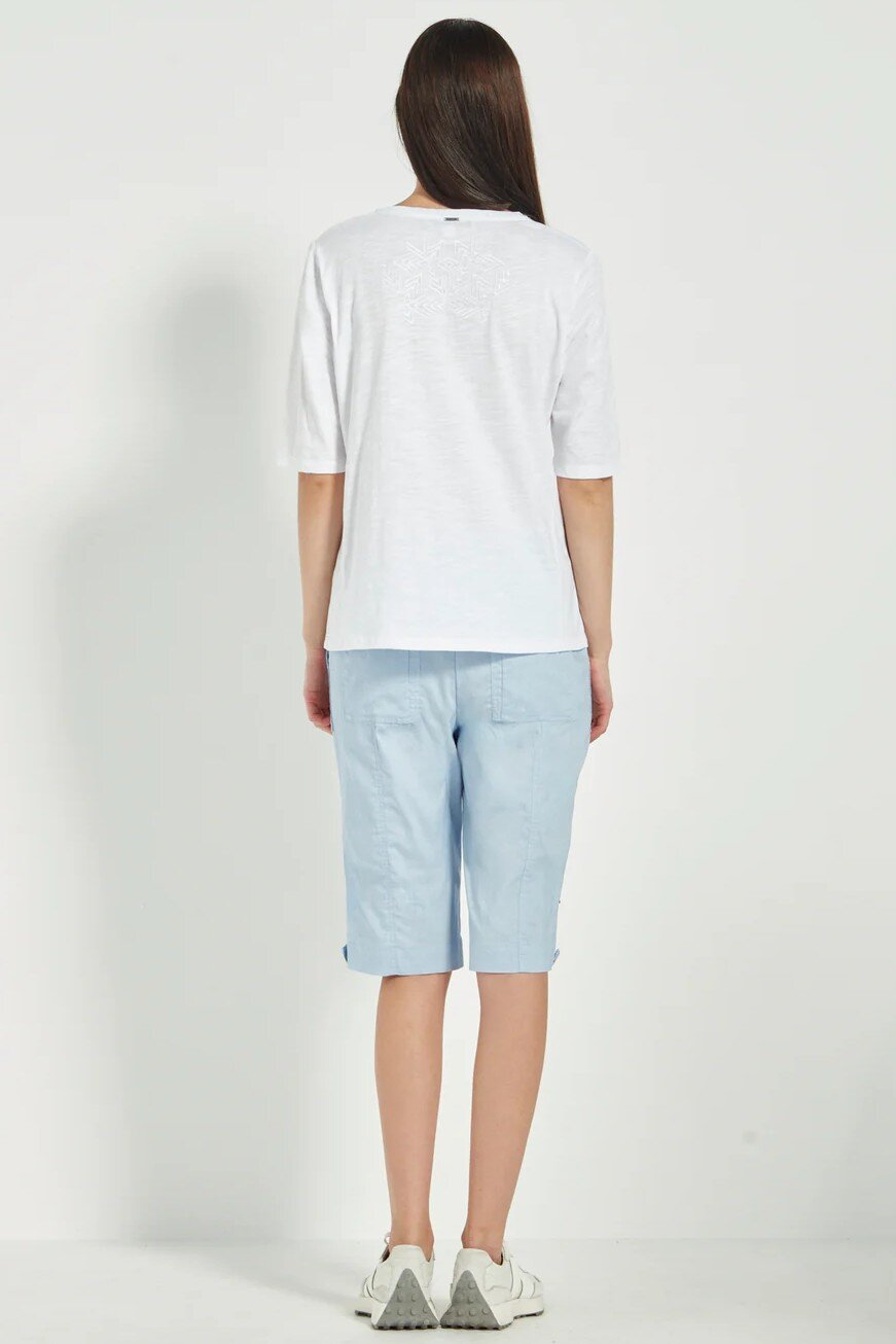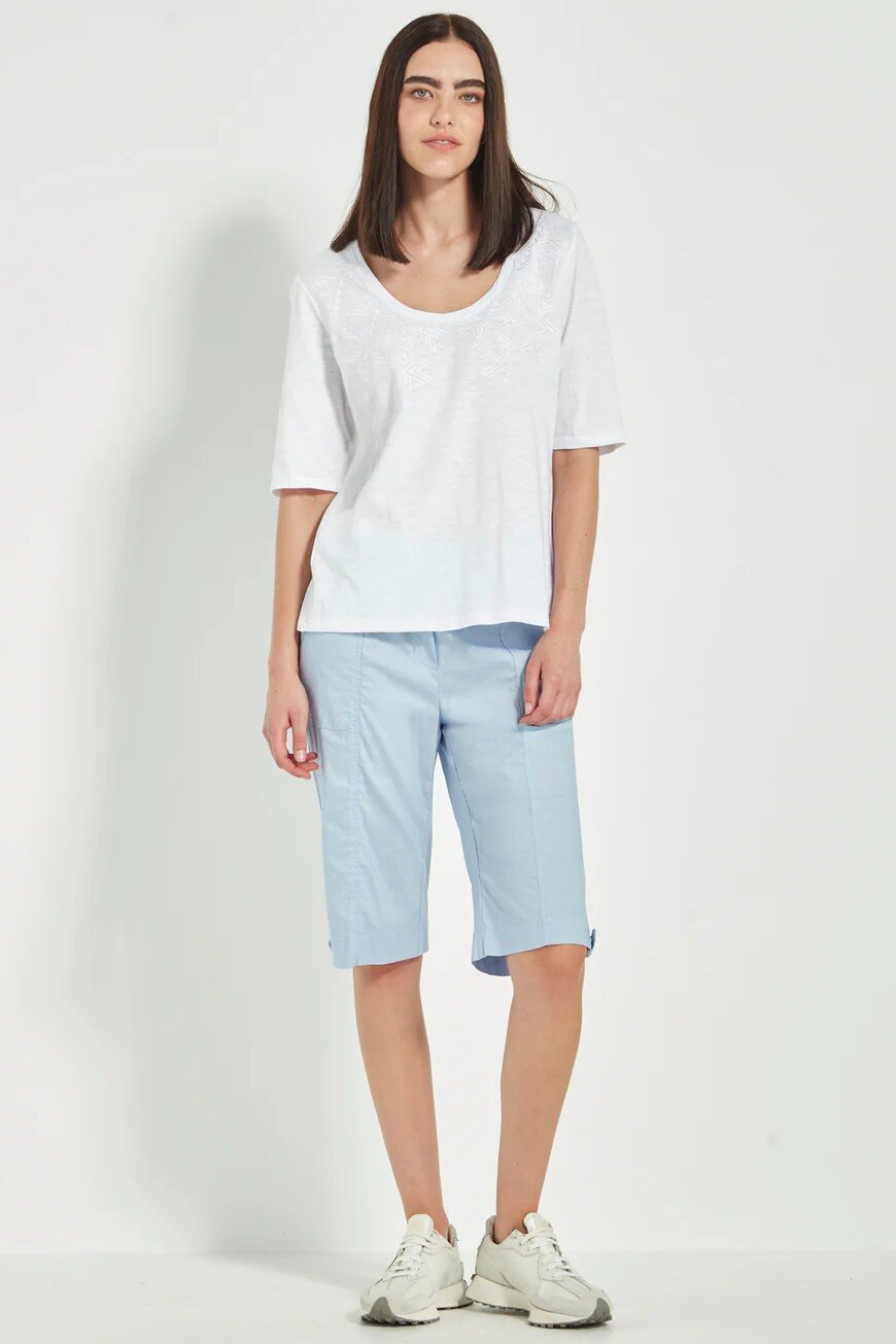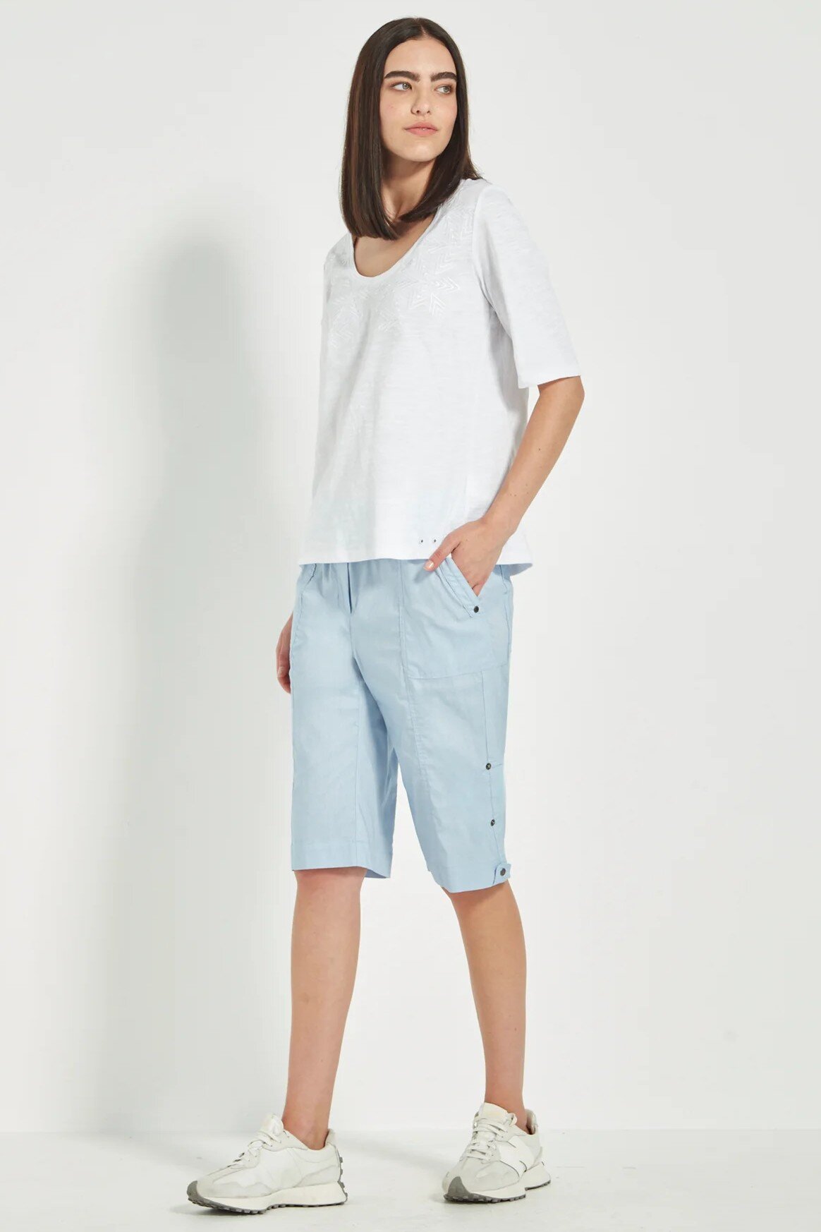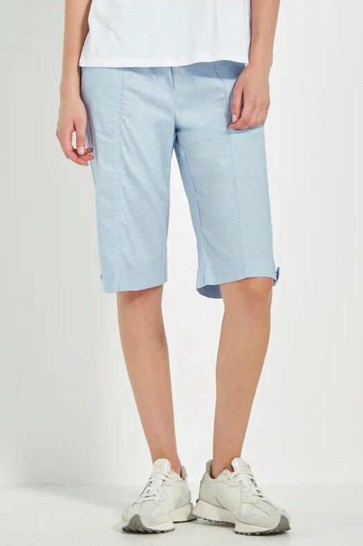 Straight leg shorts with side tabs to change the length. Features side pockets, panel detail through the leg, and elasticated waist.