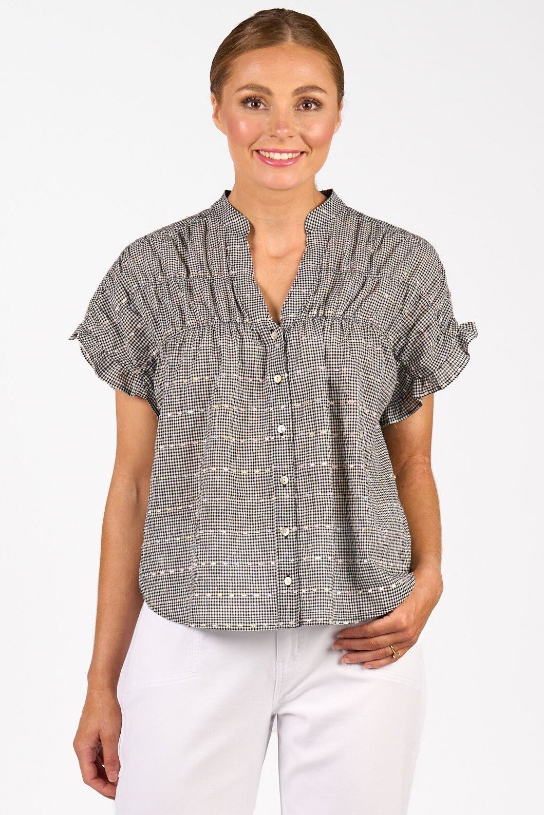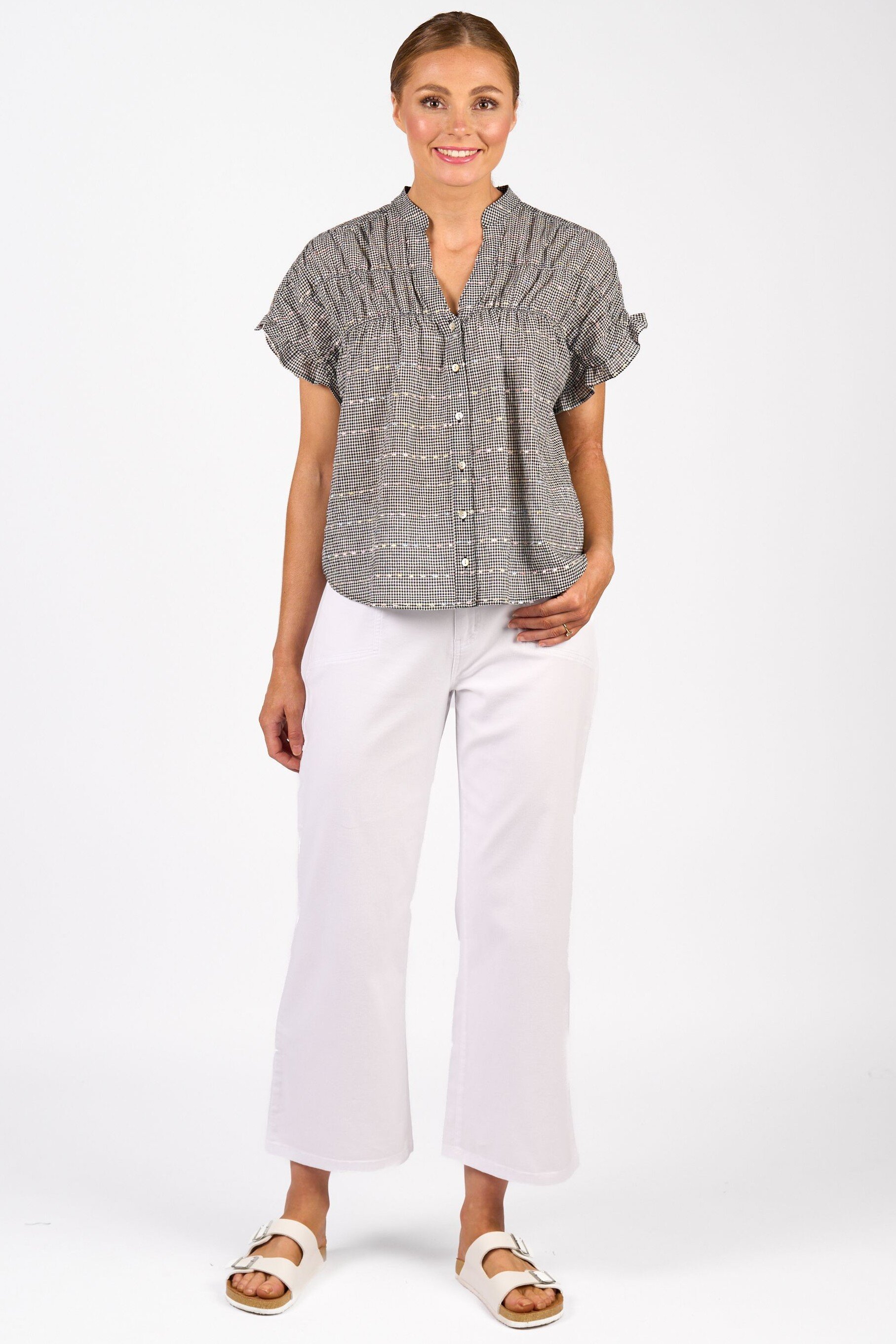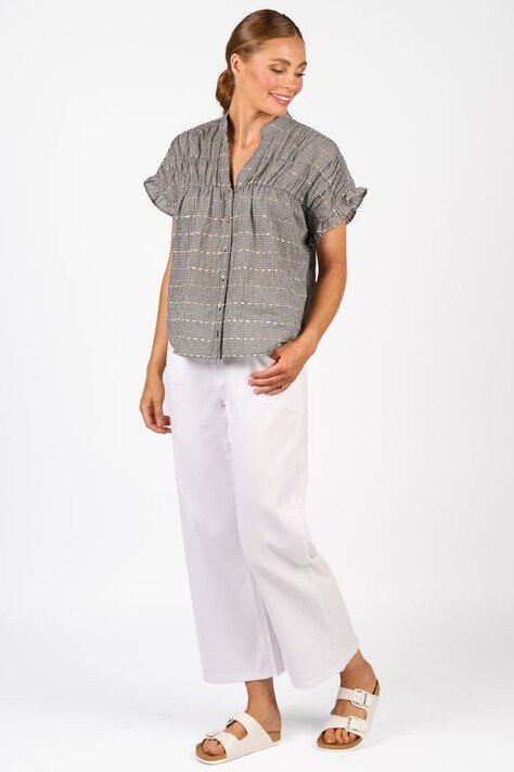 The Addison Top is a lightweight summer favourite with a relaxed fit and feminine frill cuffs. Its V-neck and shirred detailing add subtle charm, making it perfect to wear on its own for effortless style.
