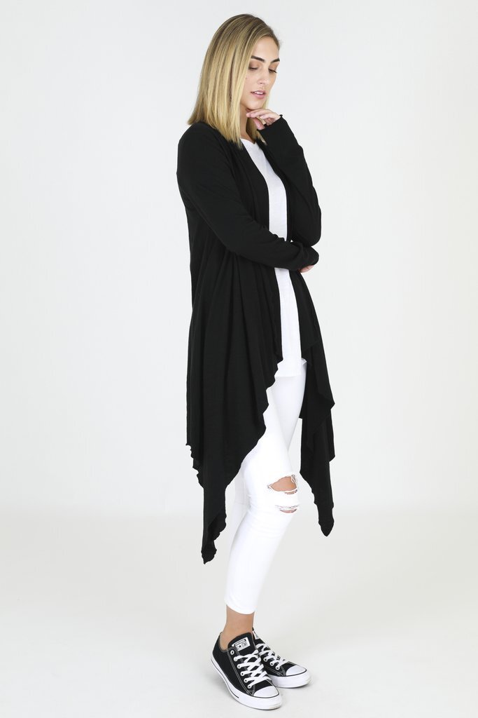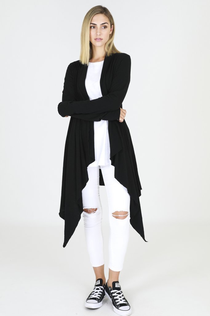 Alexandria Long Cardigan by 3RD STORY is a relaxed, drape cardigan with full length sleeves. This cardigan features draping at the front, no closures and a hi-lo hemline. The front hemline falls approximately to mid-calf length and the back sits at mid-thigh length.