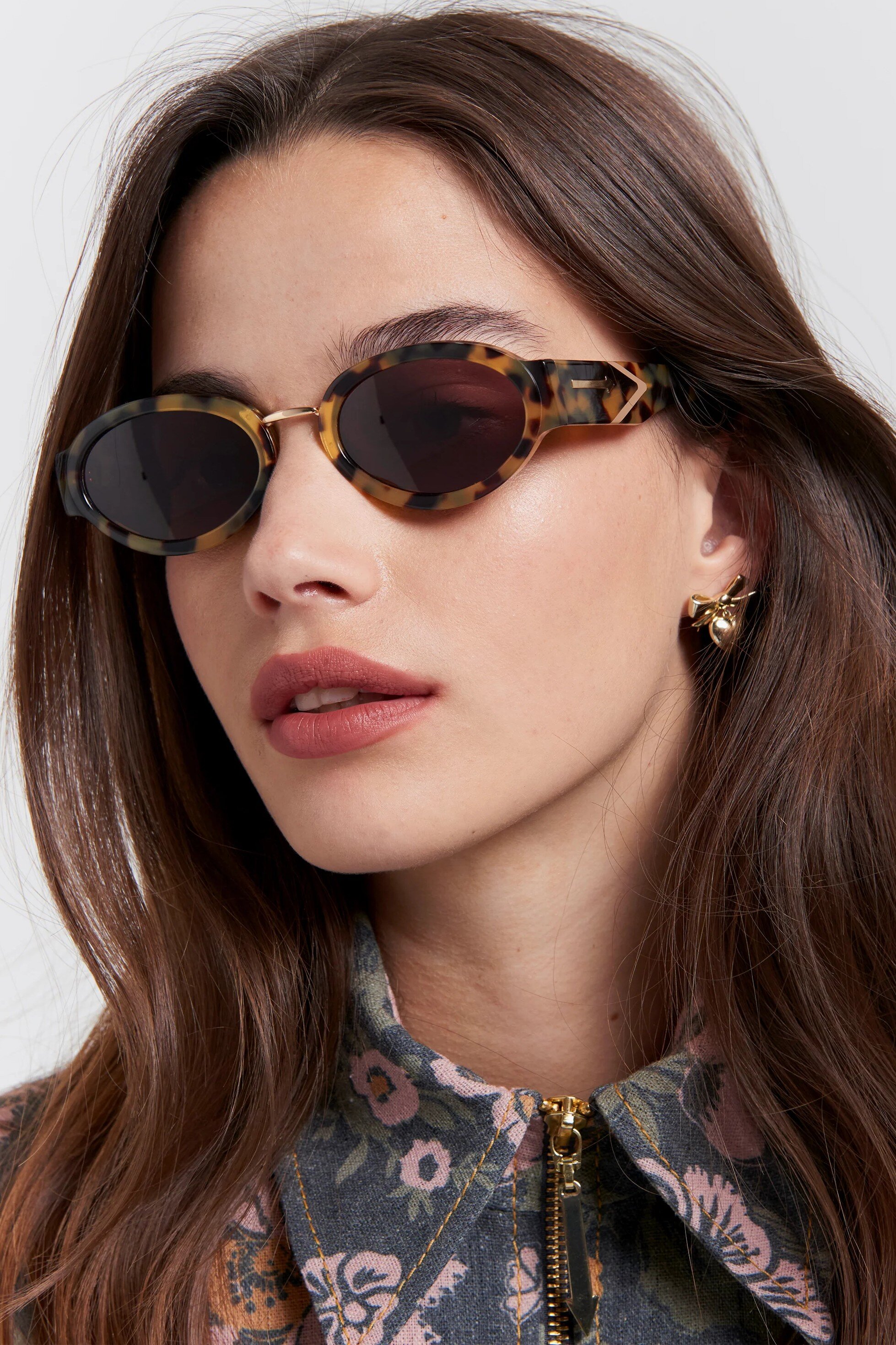 The All Out sunglasses, handcrafted in Crazy Tort bio-acetate pairs a warm tortoiseshell pattern with brown mono lenses for a classic yet distinctive look. A light tan KW arrowhead sits at the temple, while the gold metal nose bridge adds contrast and definition to the soft oval shape.