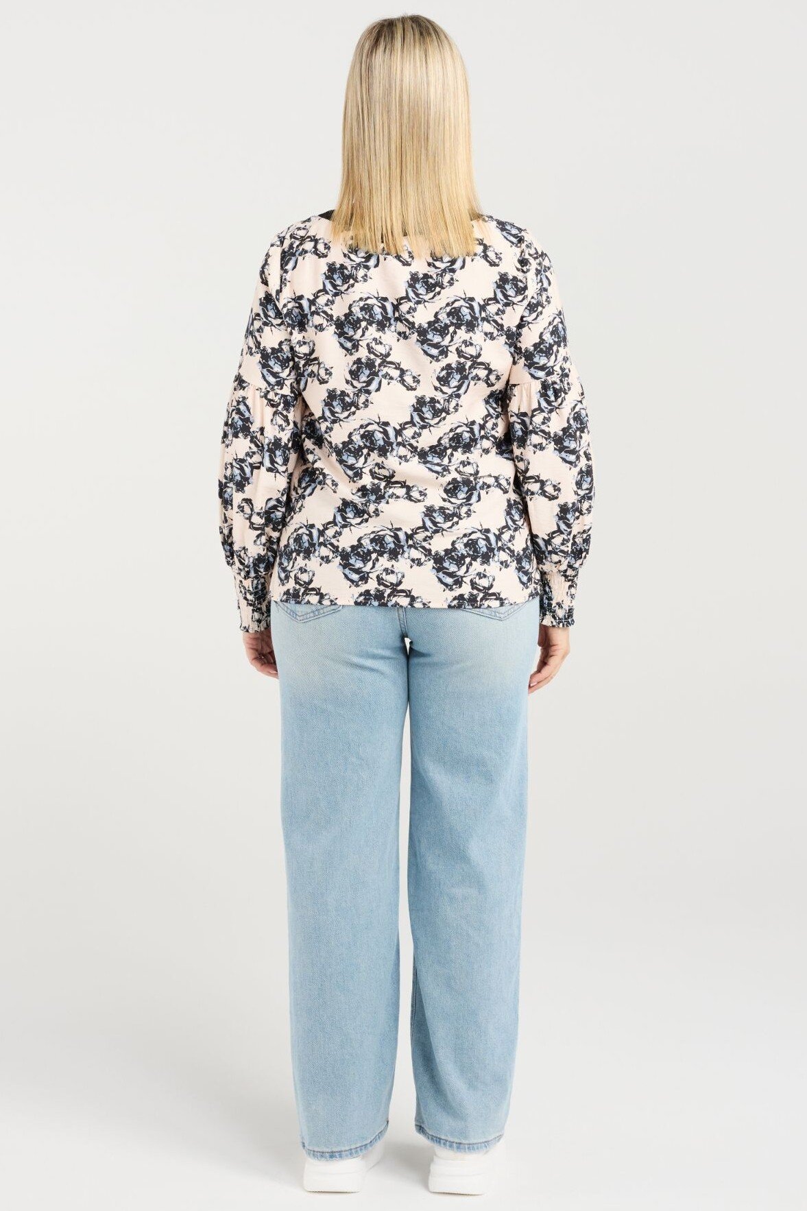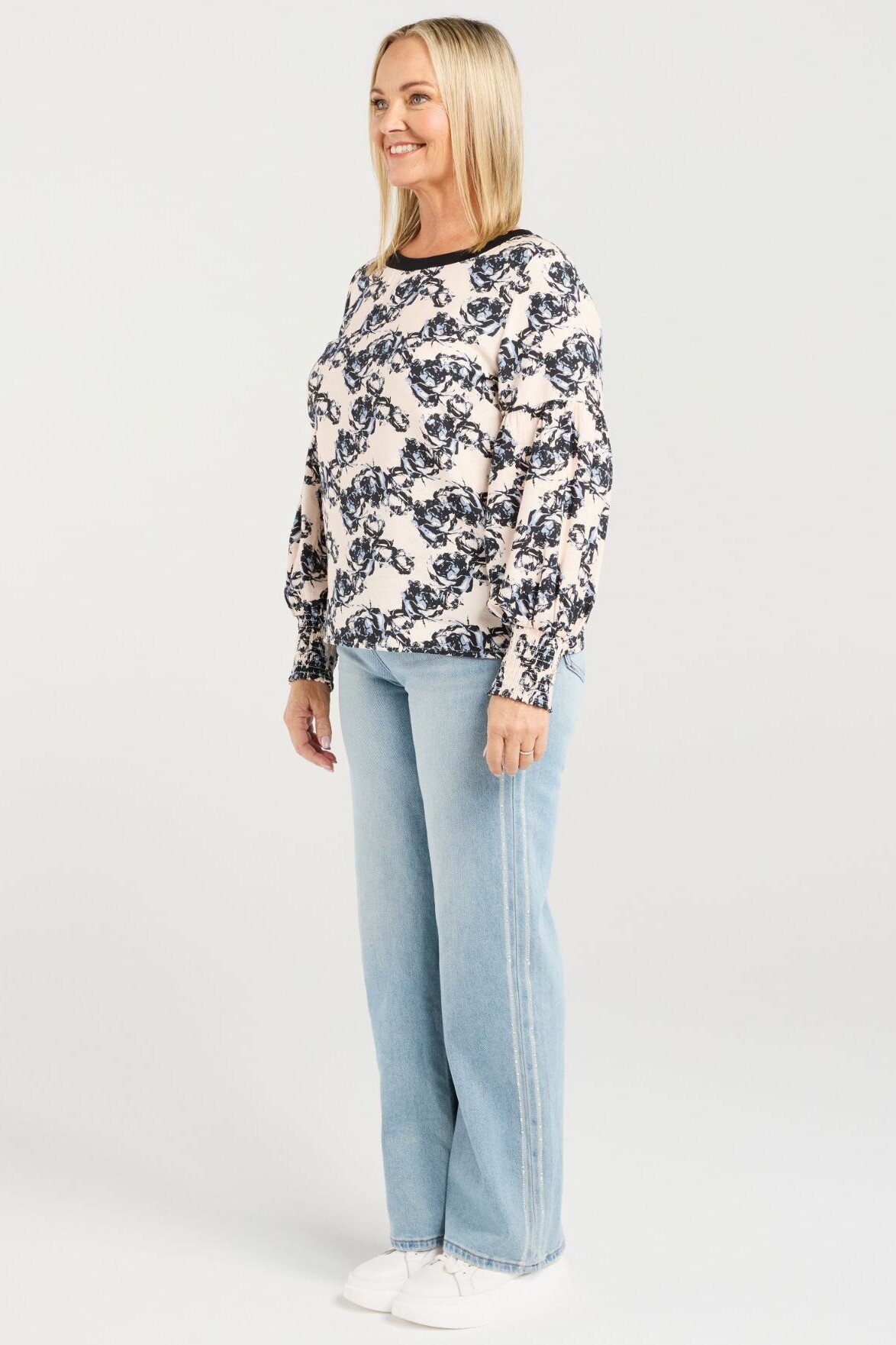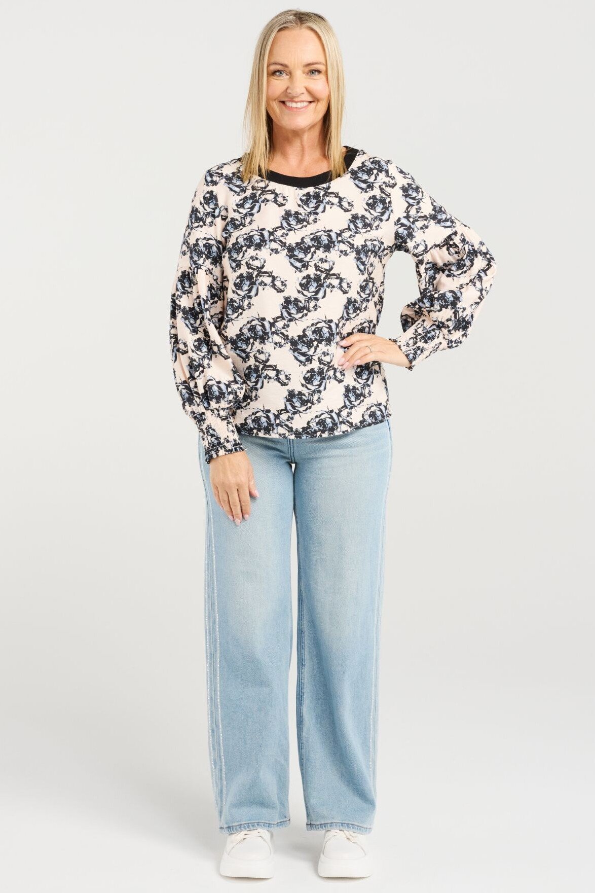 A relaxed-fit long sleeve top with a round neckline and shirred cuffs for a soft, comfortable finish. The modern floral print adds a cheerful, fresh touch to your outfit.