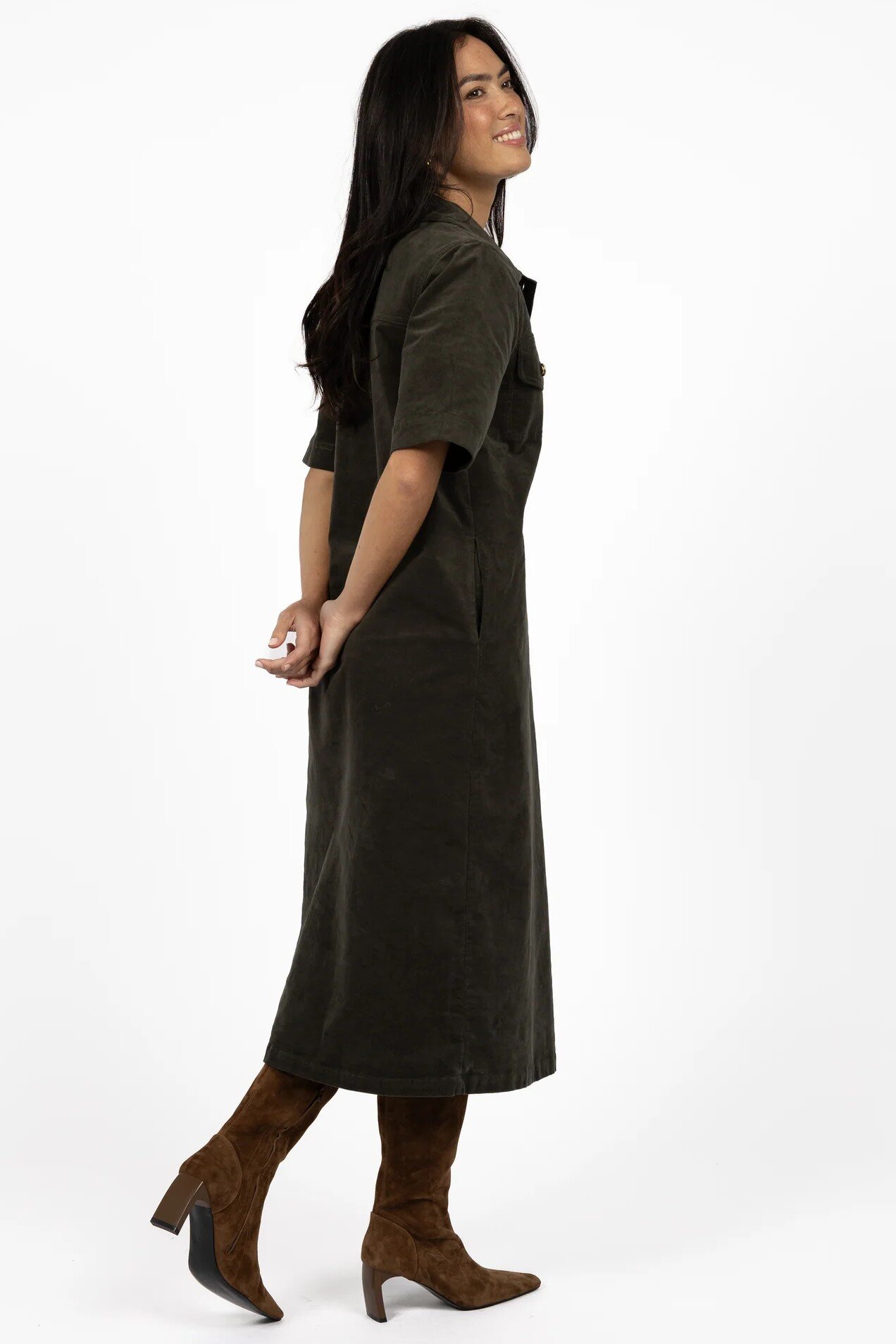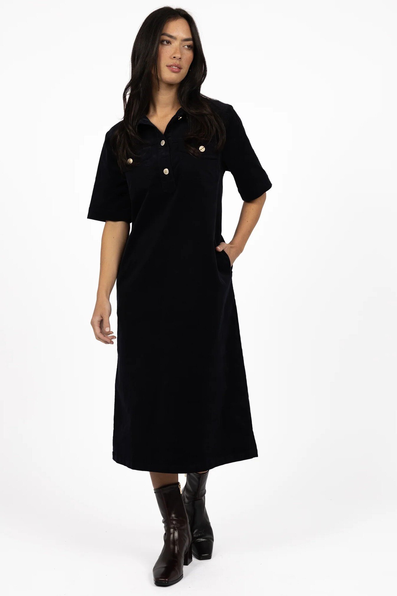 The Amici Cord Dress is one of those easy, throw-on-and-go styles that still looks effortlessly put together. Crafted from soft stretch corduroy with a beautiful drape, this midi-length dress feels comfy enough for everyday wear while still giving a polished look. The collared neckline, button placket and pocket detailing add a subtle utility vibe, making it the perfect transeasonal piece you’ll reach for again and again.
