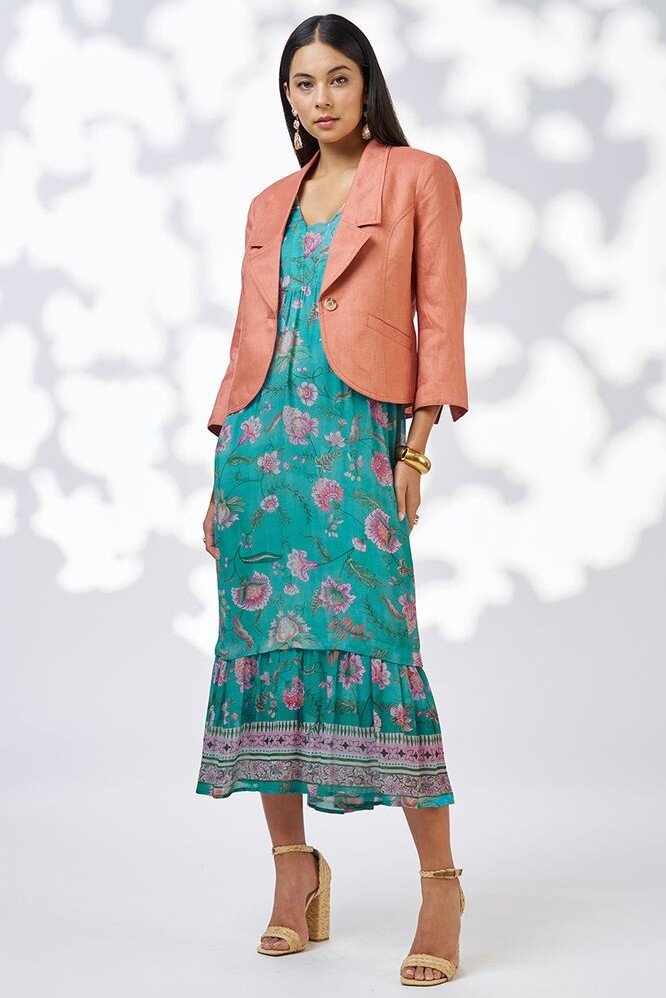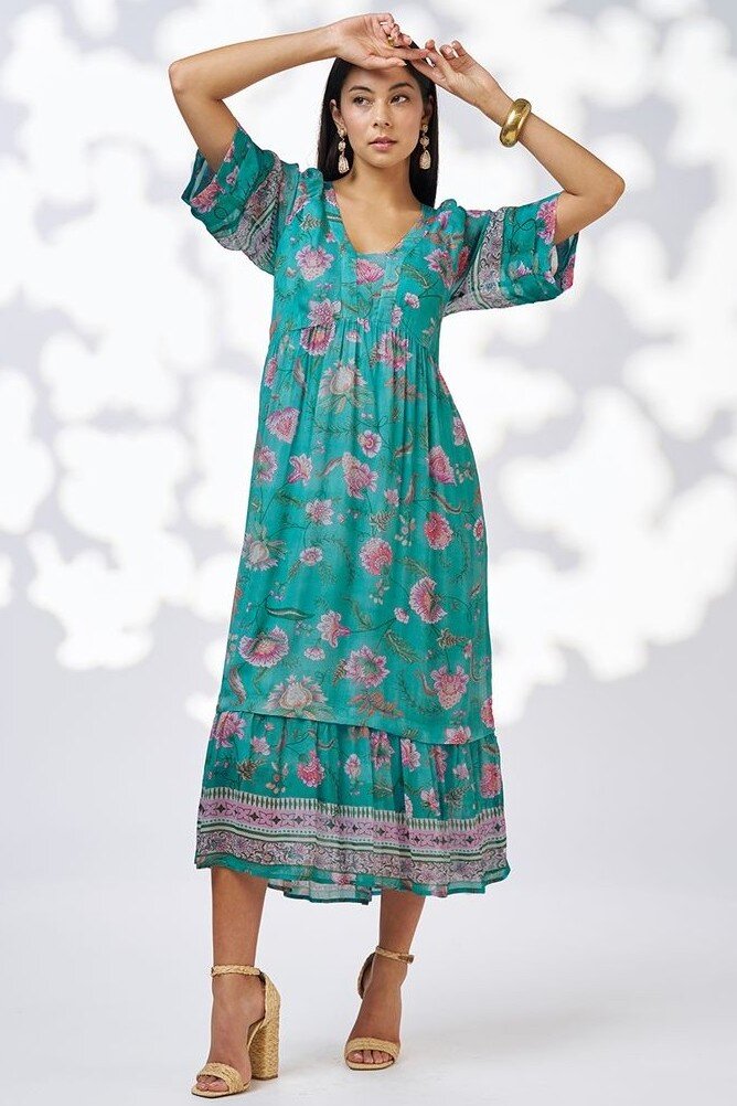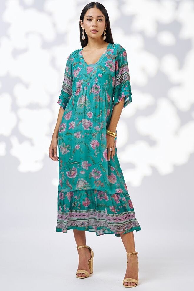 Printed dress with a panelled front to give the impression of a V neckline, with a gathered skirt. Sleeves and hem panel feature tucks to add detail. Lined through body.