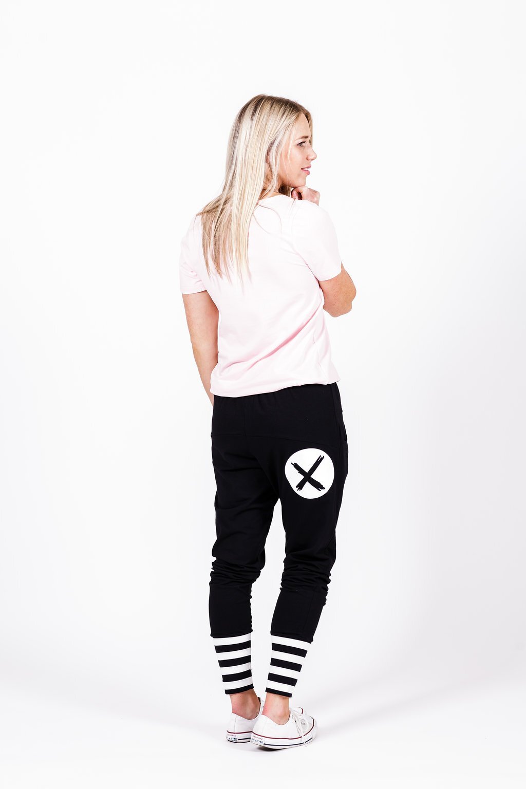 The "Super Popular" Homelee Apartment Pants are back.Choose between:1) X Spot Print in White on Black with Striped Cuffs2) X Print in White on Black