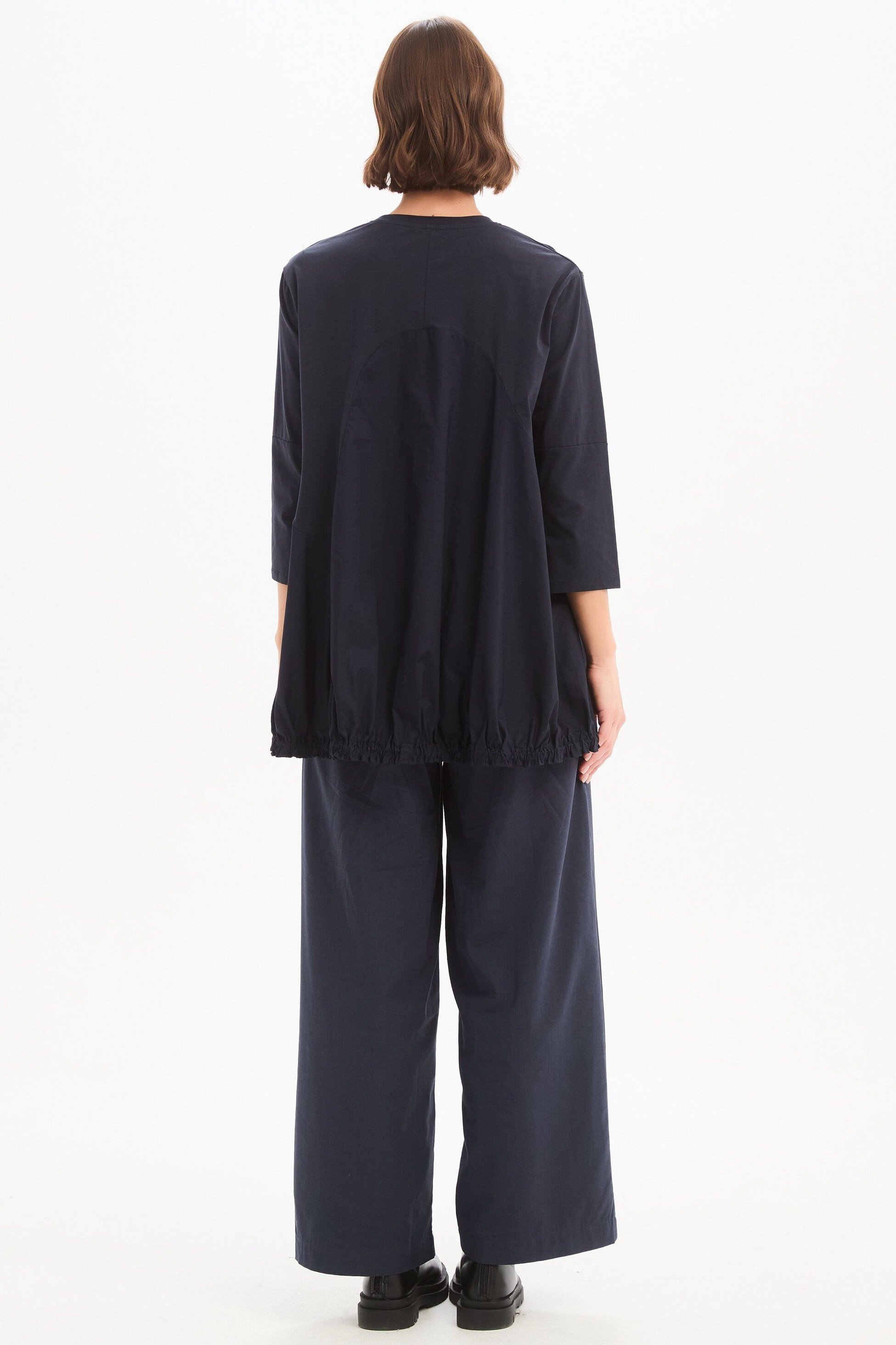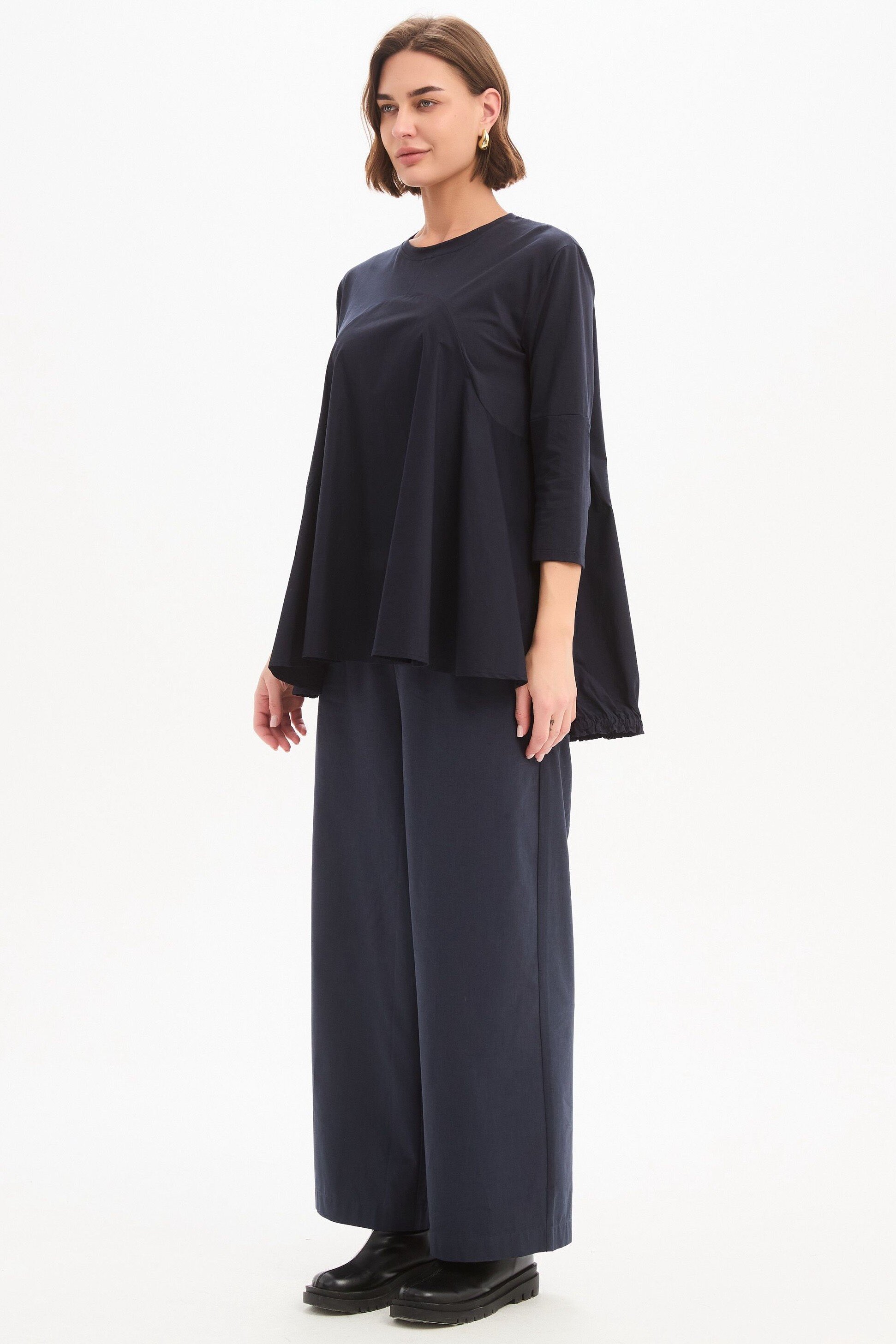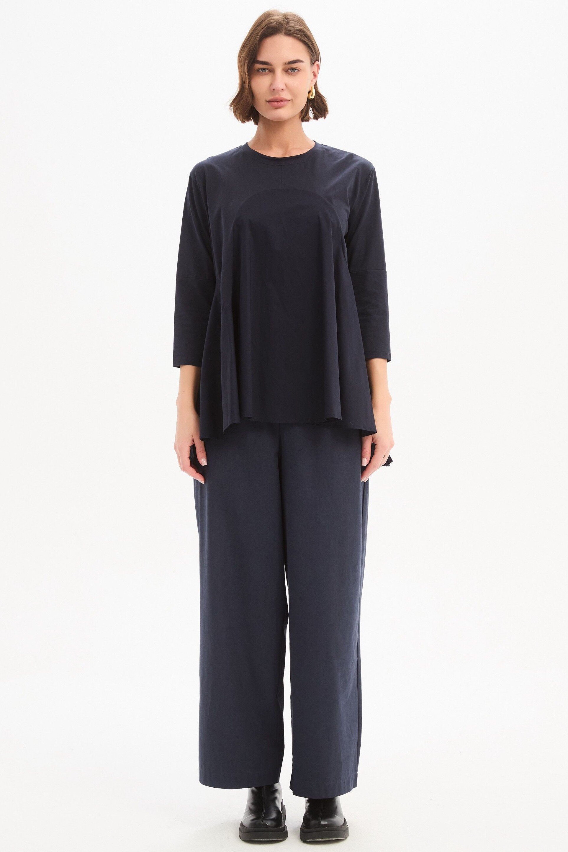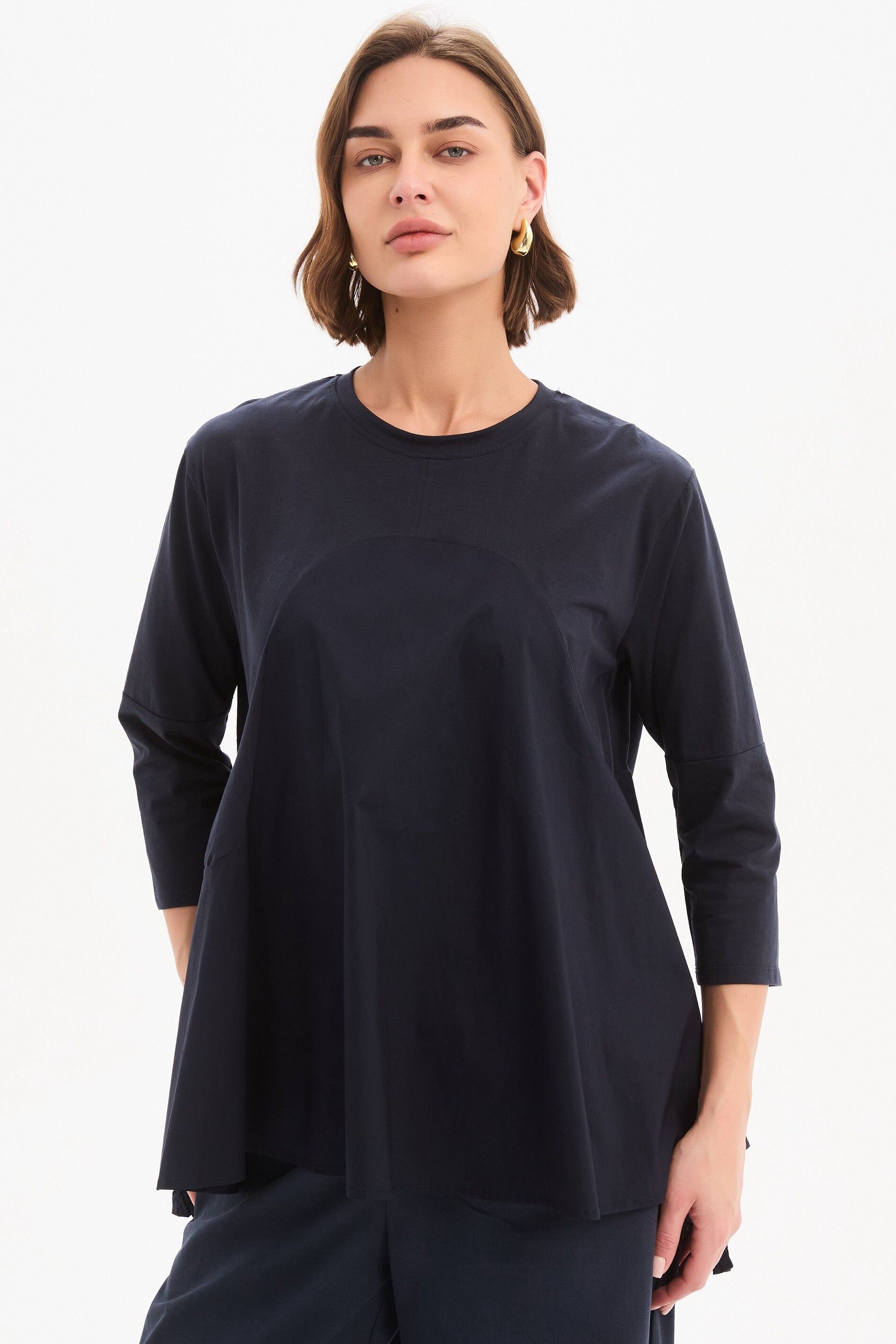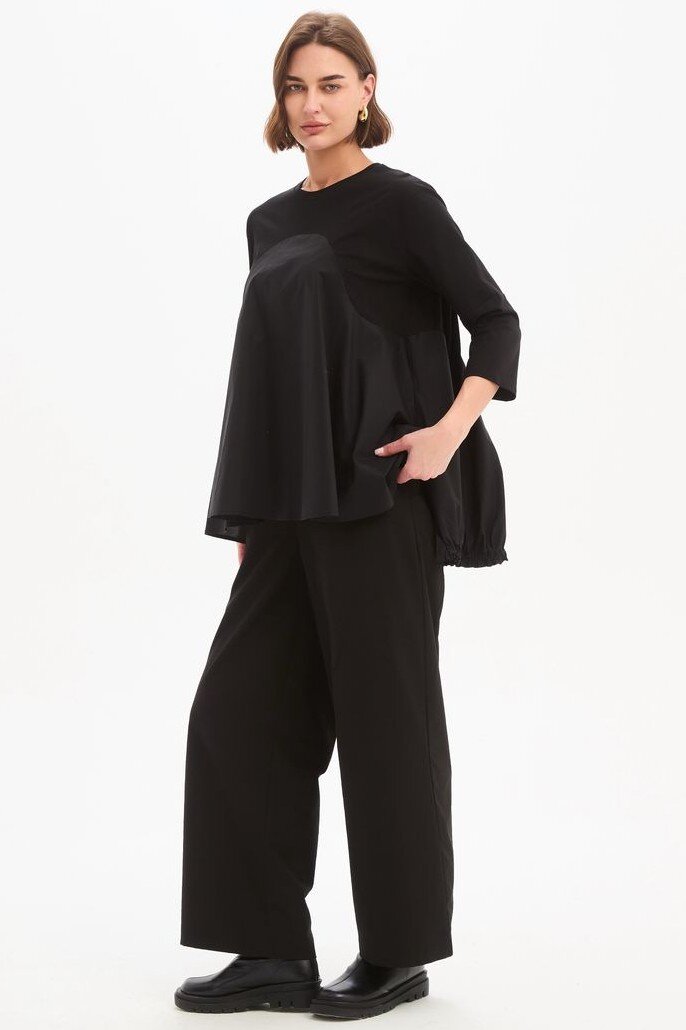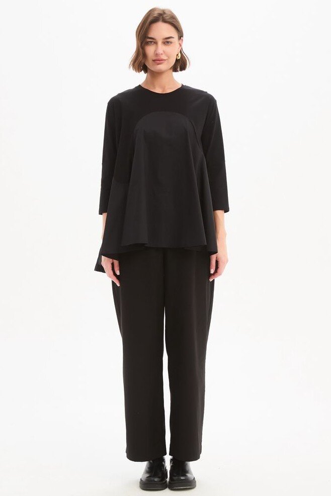 A modern update to everyday dressing, the Arc Seam Combi Top brings together soft structure and thoughtful detail. Crafted from a cotton jersey and poplin combi, it offers a comfortable yet refined feel. The arc seam panel creates a subtle shape through the body, while the ruffle back hem adds gentle movement and a point of difference. Designed with 3/4 sleeves and side splits for ease, this piece is a versatile addition to your wardrobe rotation.
