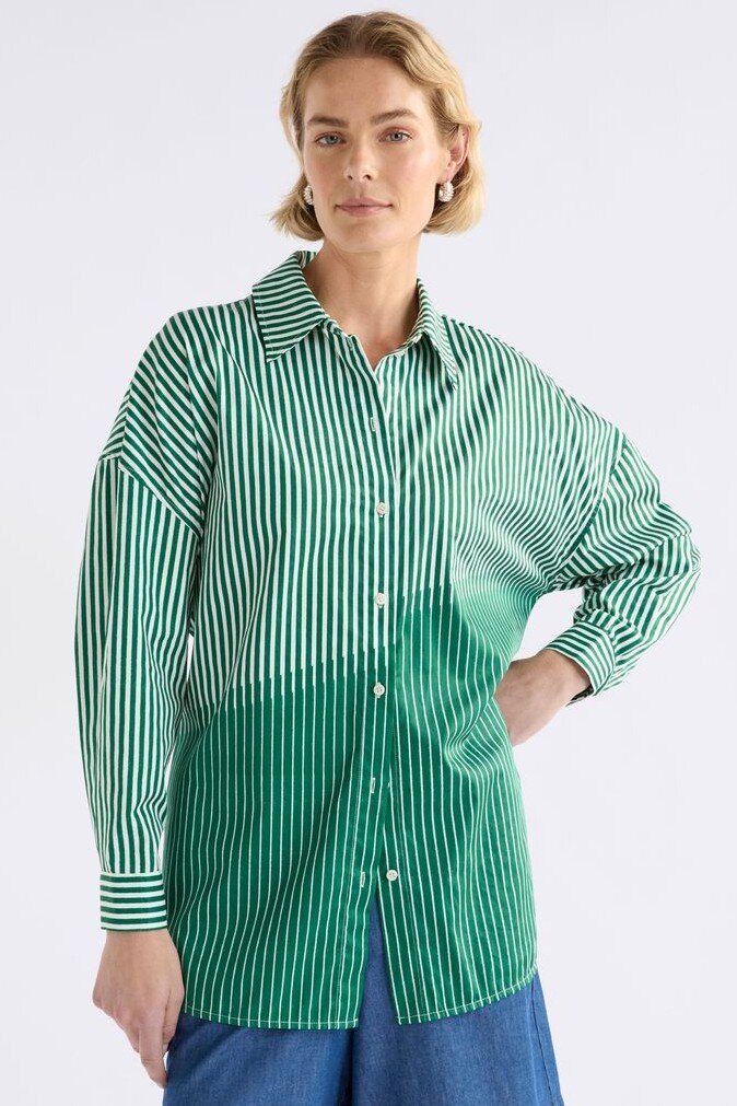 The Artex Shirt brings a unique edge to classic shirting! A classic long sleeve shirt cut with slight dropped shoulders, tie back and a curved, slight high-low hem.