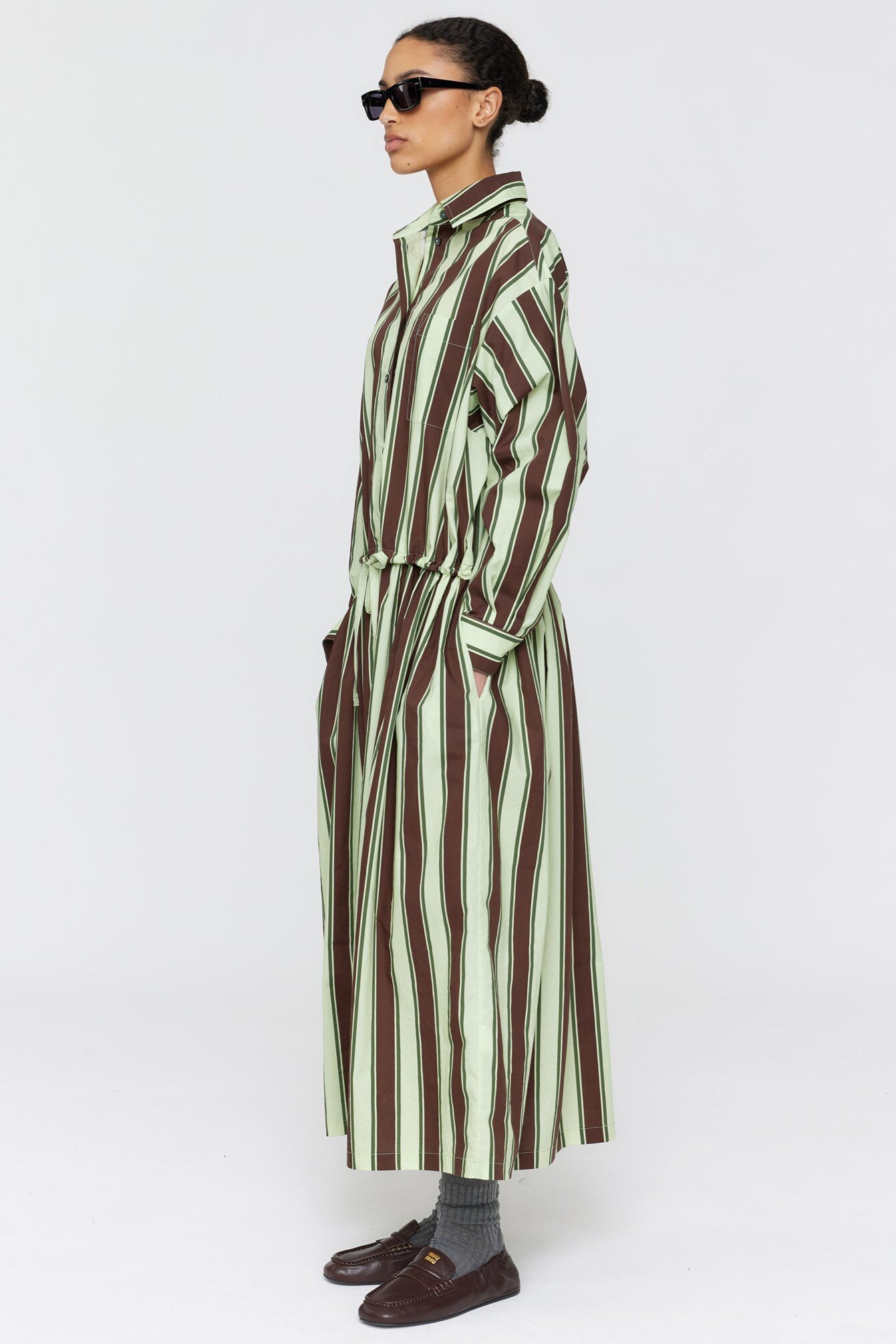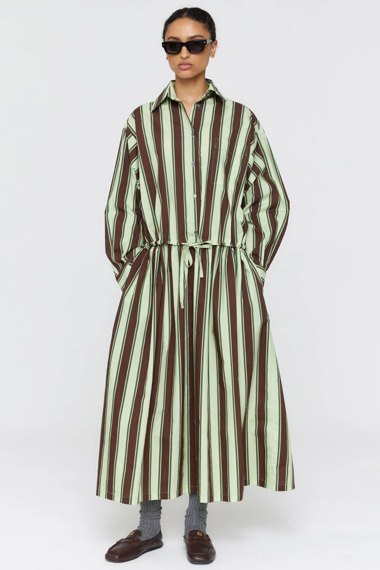 This long-length shirt dress features a crisp collar and structured cuffs that anchor the design, while a button front closure allows for easy layering and adjustment.