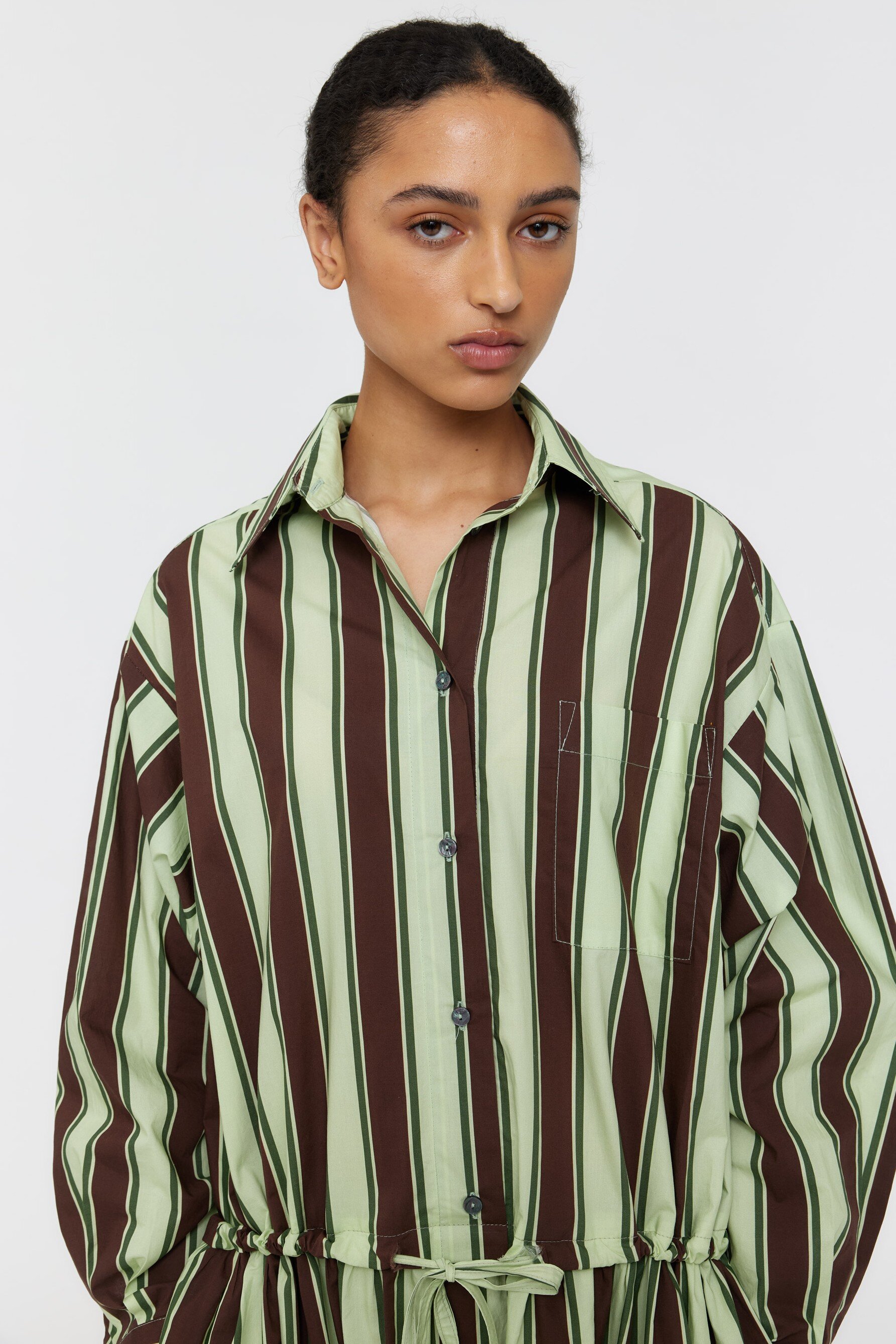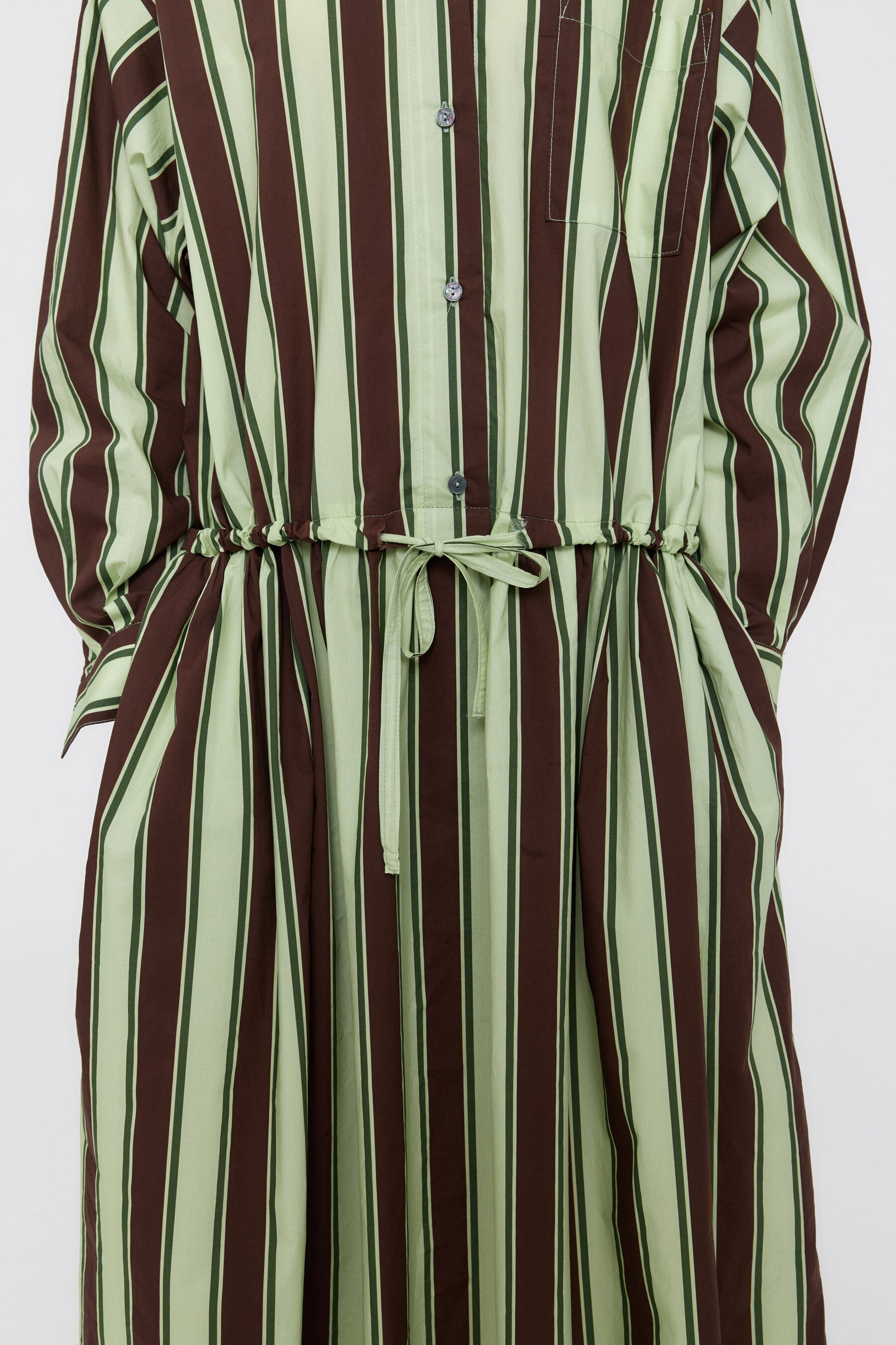 Thin self-tie details at the waist define the silhouette, and the gathered skirt creates movement and dimension.