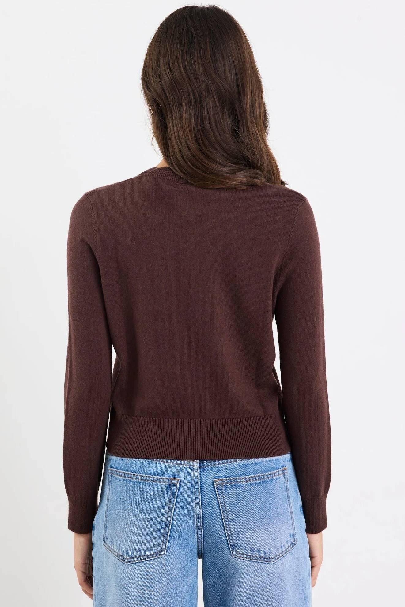 A refined essential for any wardrobe, this soft crewneck cardigan offers a delicate balance of comfort, stretch, and luxury. Perfect for layering or wearing on its own, the chocolate tone adds rich depth to your everyday styling.