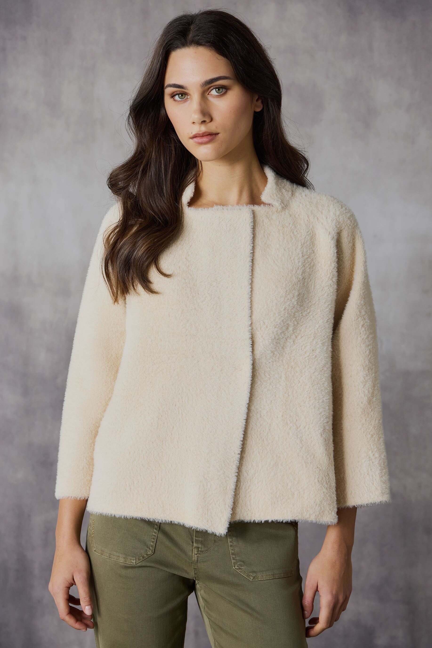 The Axel Jacket; The epitome of cozy sophistication. Crafted in a soft knit and featuring an overlapped front with a hidden snap closure for a sleek finish. It’s cropped length offers versatility allowing you to layer it gracefully over dresses or your favourite pants, making a statement of comfort and style.