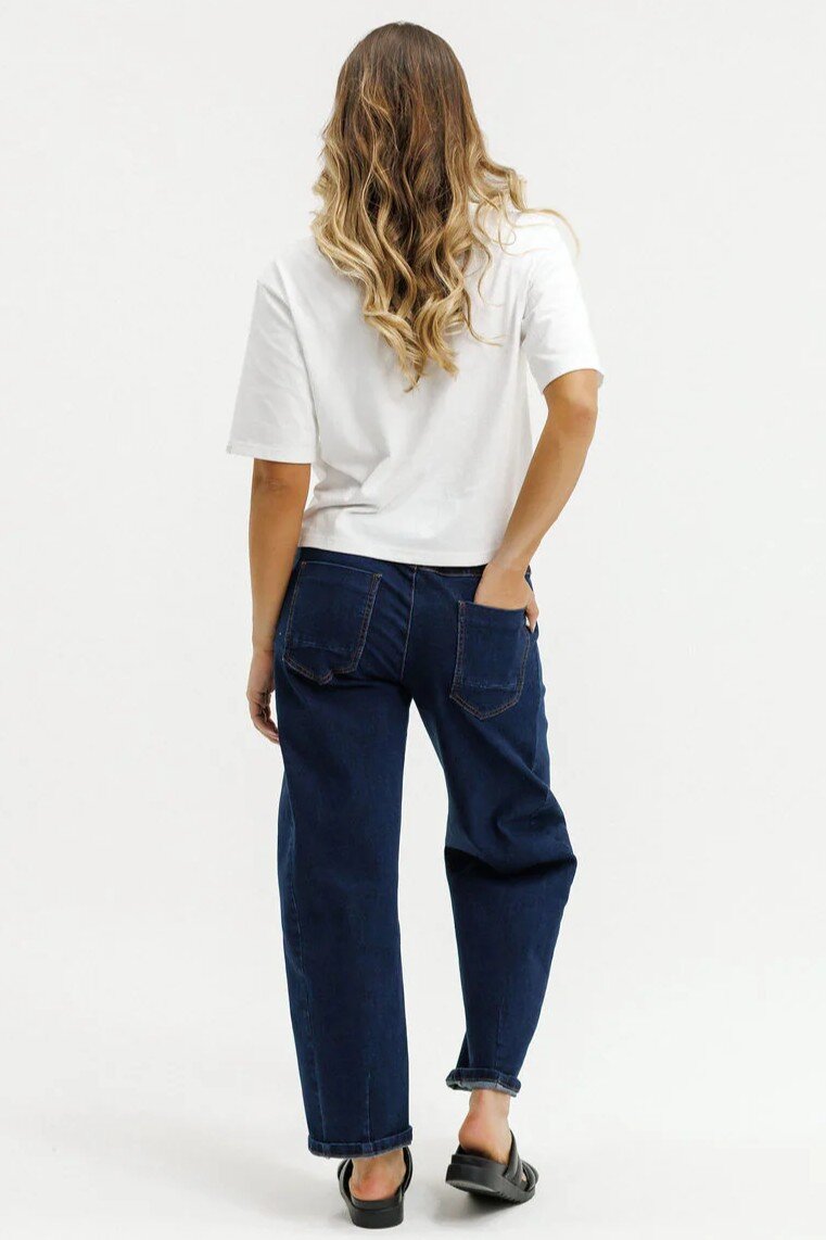 The Barrel Jean is a classic Homelee Denim with a modern twist, in cotton with just a hint of elastane, and an elasticated waistband with drawstring for the comfiest fit. This comfy barrel-leg style with an ankle grazing length, is a must-have for every wardrobe, perfect for effortless, everyday looks that Homelee fans love.