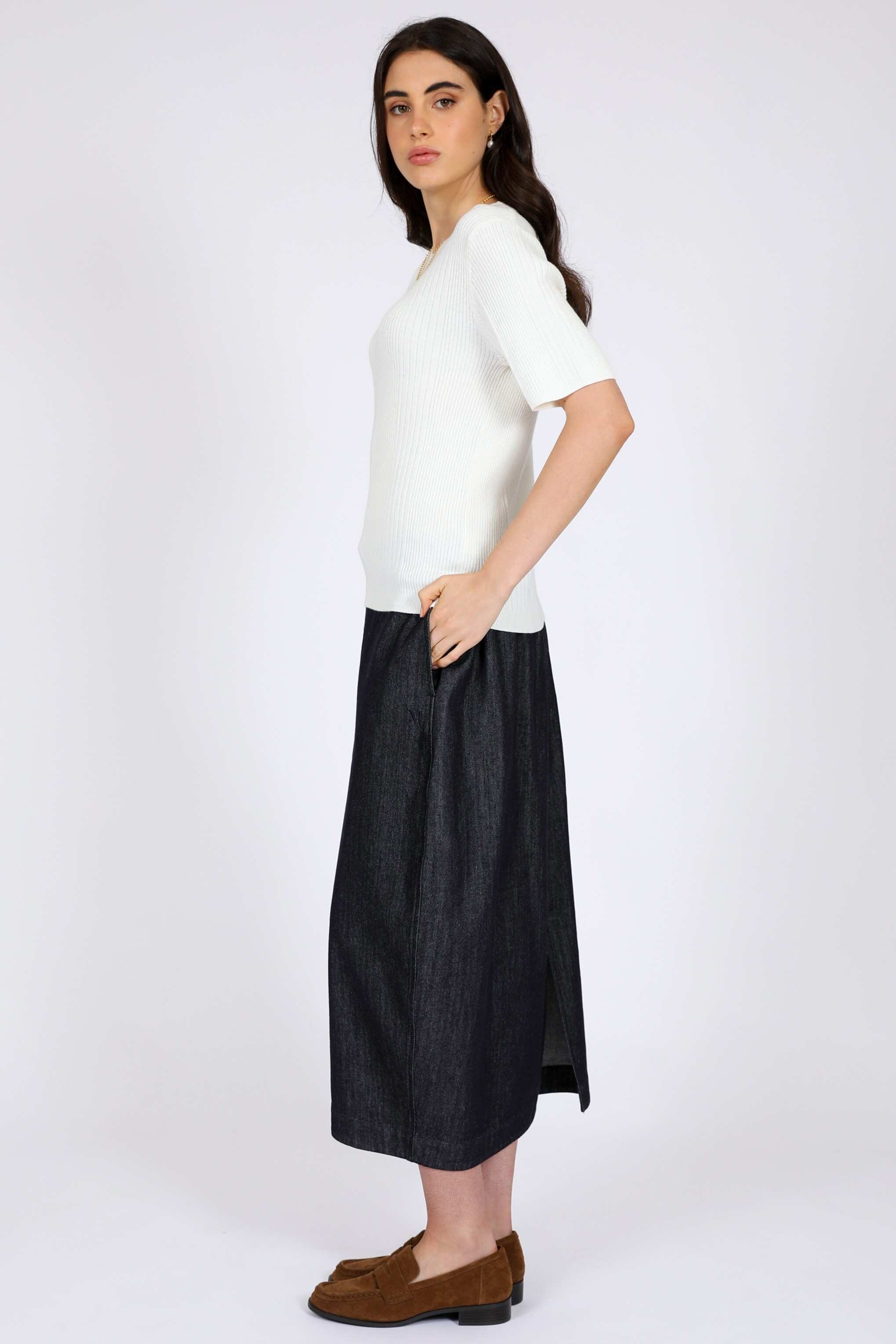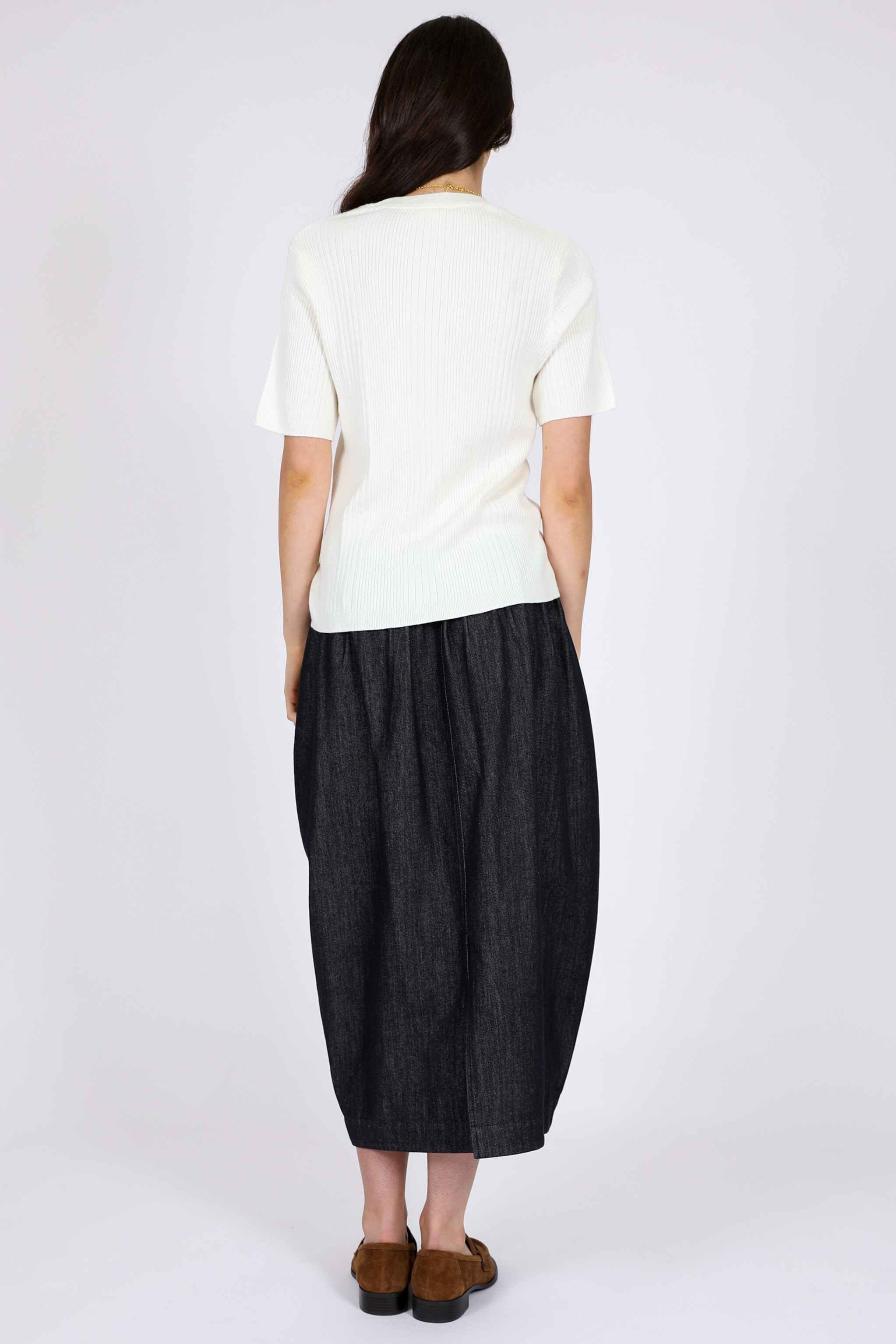 Taking cues from the popular barrel shape, the Beam Barrel Skirt offers a modern silhouette in a versatile dark wash.