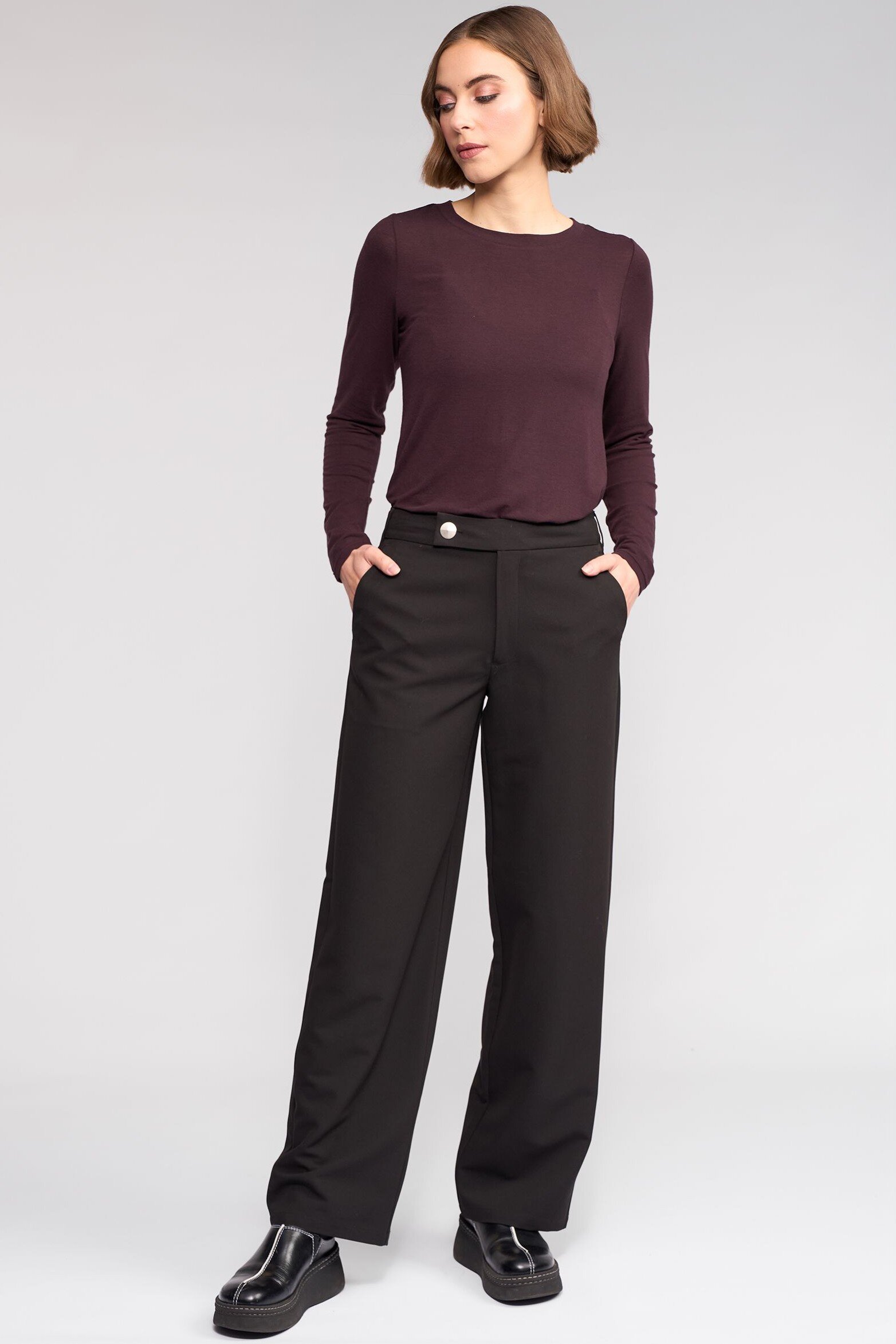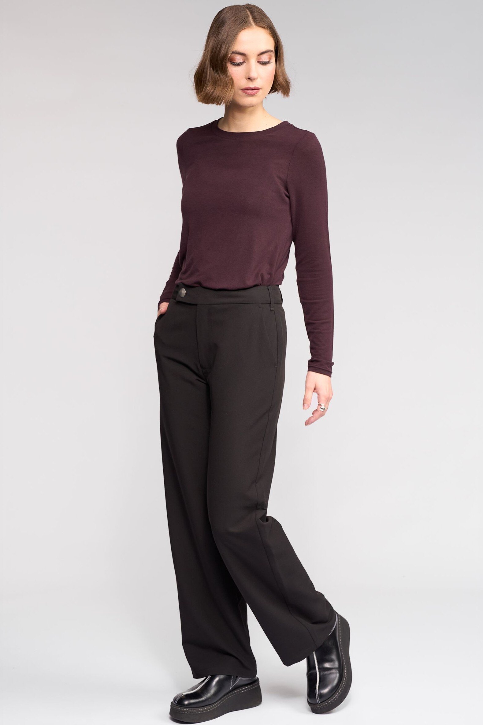Full-length wide-leg pant in black, designed with an off-centre tab closure finished with a silver button. This tailored style offers a clean, formal silhouette with a modern asymmetric waistband detail.