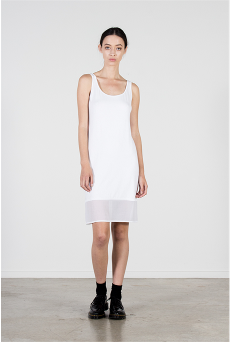 NYNE classic 'Block Dress' - drapey knit slip dress with chiffon hem panel. A staple piece to any NYNE wardrobe. Made in New Zealand.