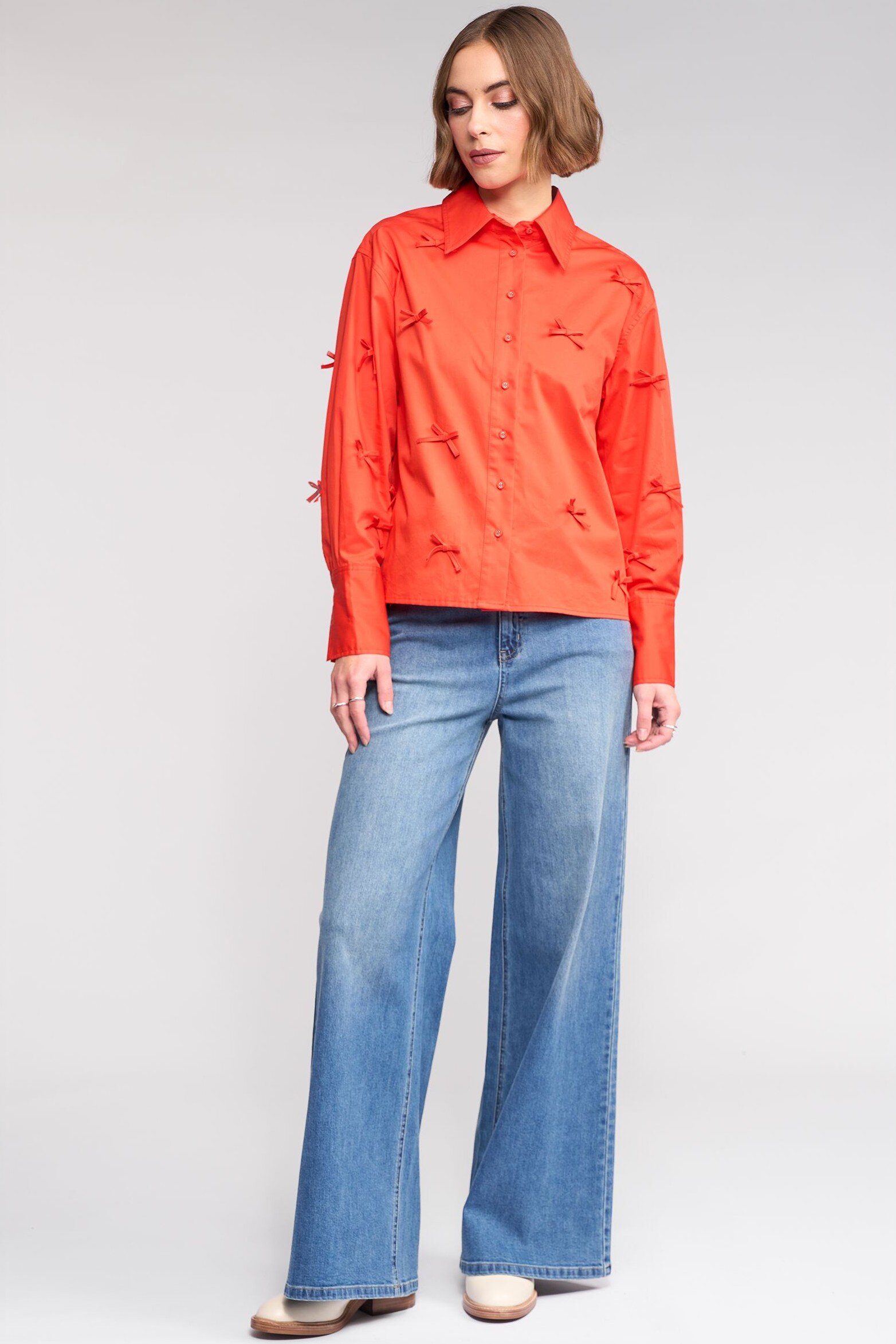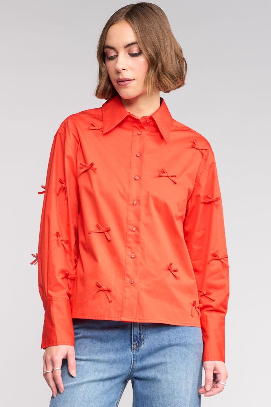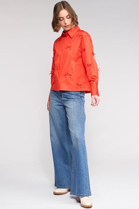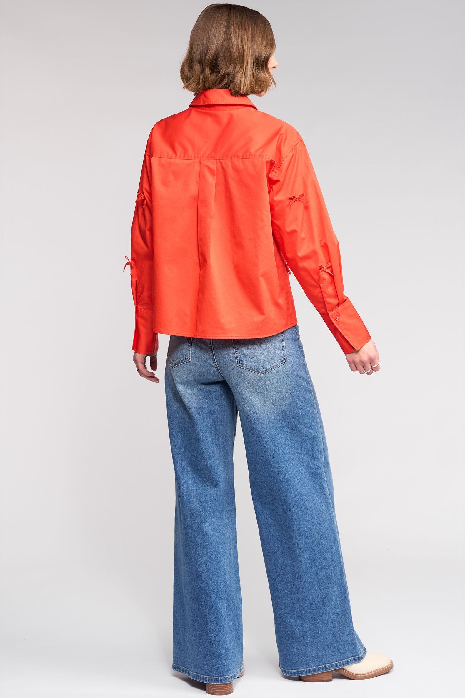 Crisp cotton shirt in Lava, a bold bright orange. Designed with classic shirting details, the front is finished with fabric bow appliqués for a playful twist on a timeless silhouette, while the back remains clean with traditional shirt construction, including a back yoke and centre box pleat.