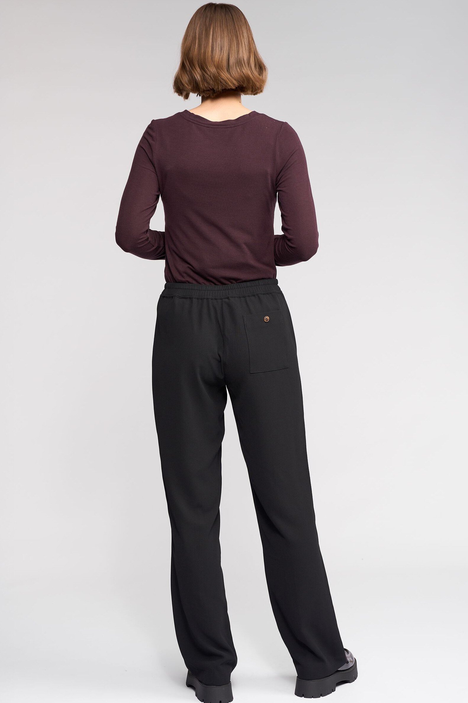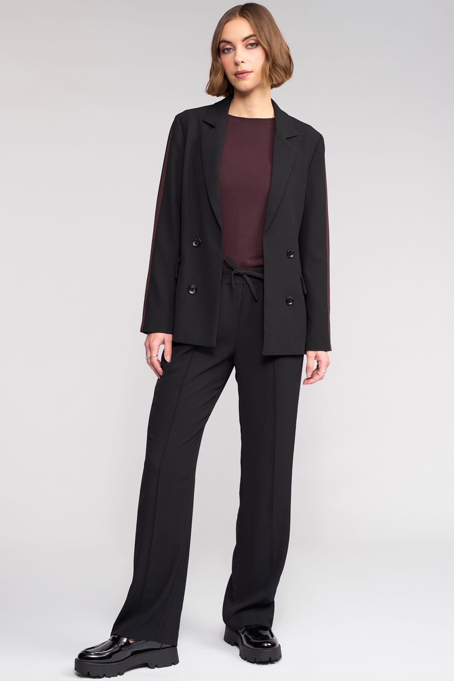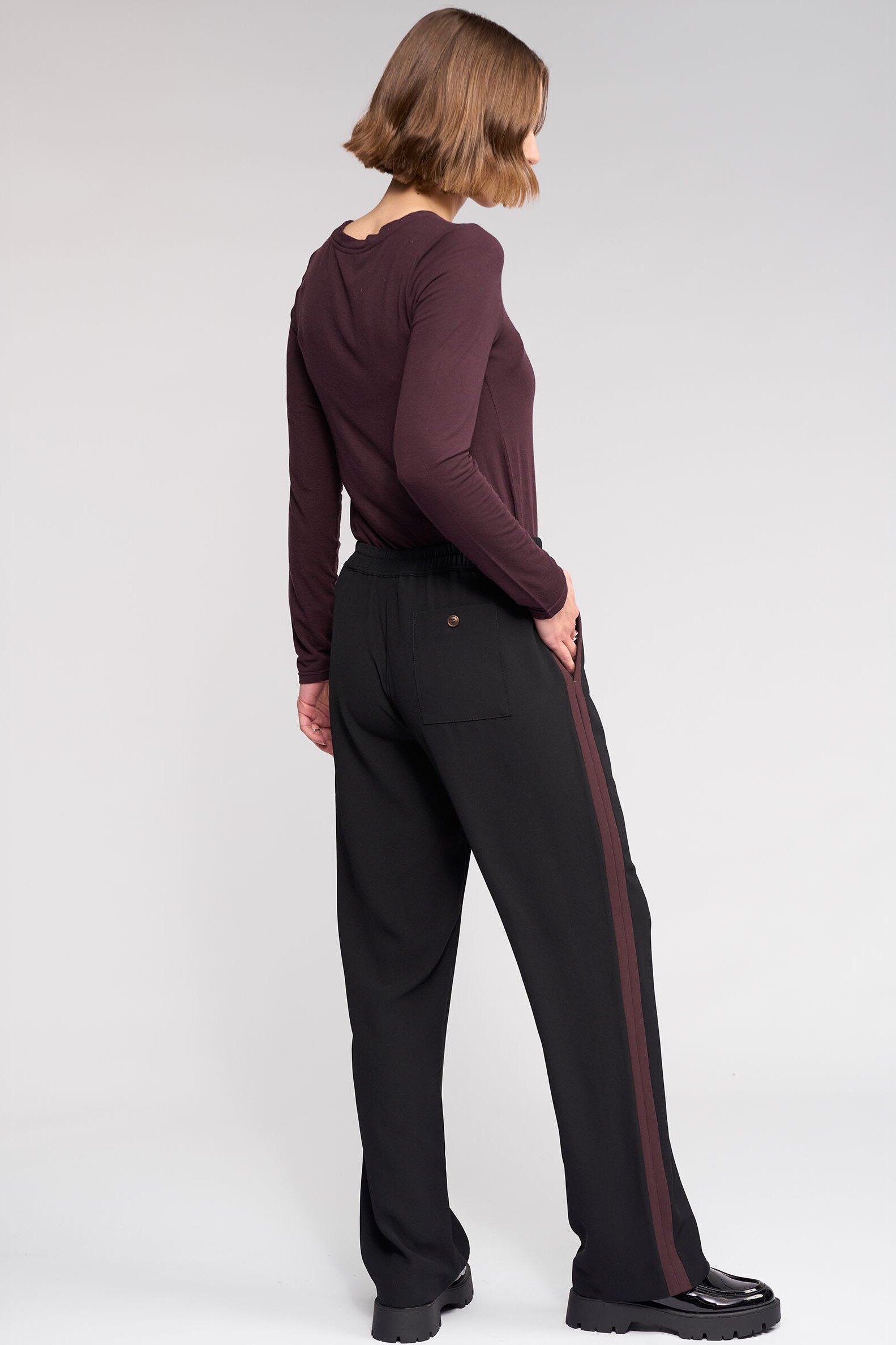 Full-length straight-leg pant in black, featuring contrast Raisin-coloured stripes running down the side seams. Designed in an easy pull-on style with an elasticated waistband and matching drawstrings, this pant offers relaxed comfort with tailored detailing.