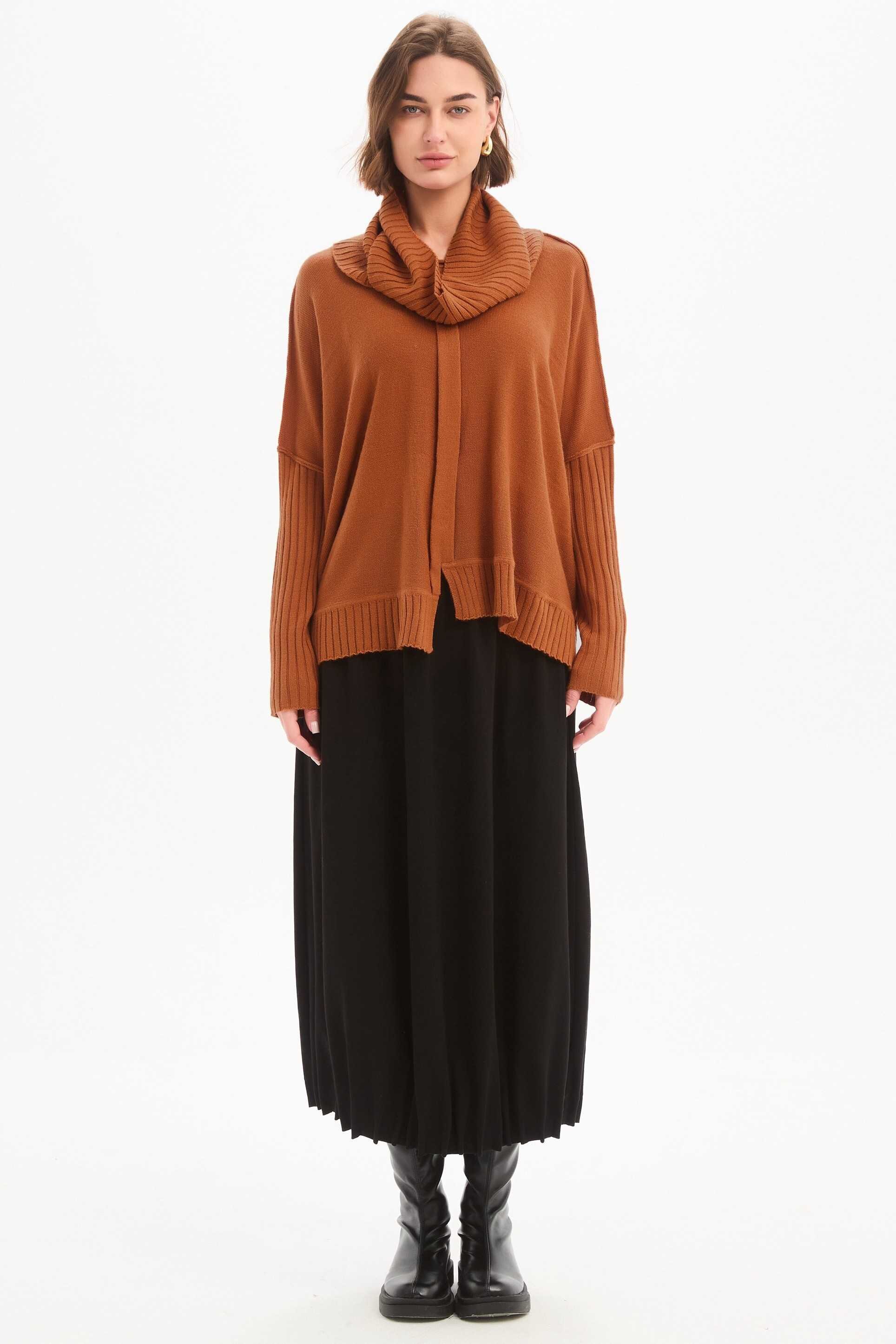 A modern knit designed with versatility in mind, the Boxy Rib Sleeve Knit brings together texture and thoughtful detail. Crafted in a soft knit, the relaxed, boxy silhouette offers an easy fit, while ribbed sleeves and hem add subtle structure. The detachable funnel neck scarf introduces a styling element that can be worn your way, layered or removed as needed. This piece is designed to adapt effortlessly to your day.Detachable Funnel Neck/ScarfStep HemFront, Back & Side SplitsRib Sleeves & HemStripe PanelComposition: 65% Acrylic, 20% Nylon, 15% Merino Wool