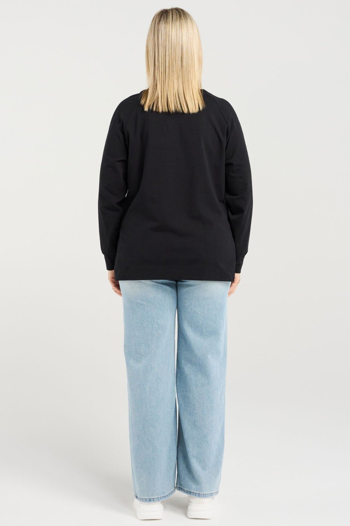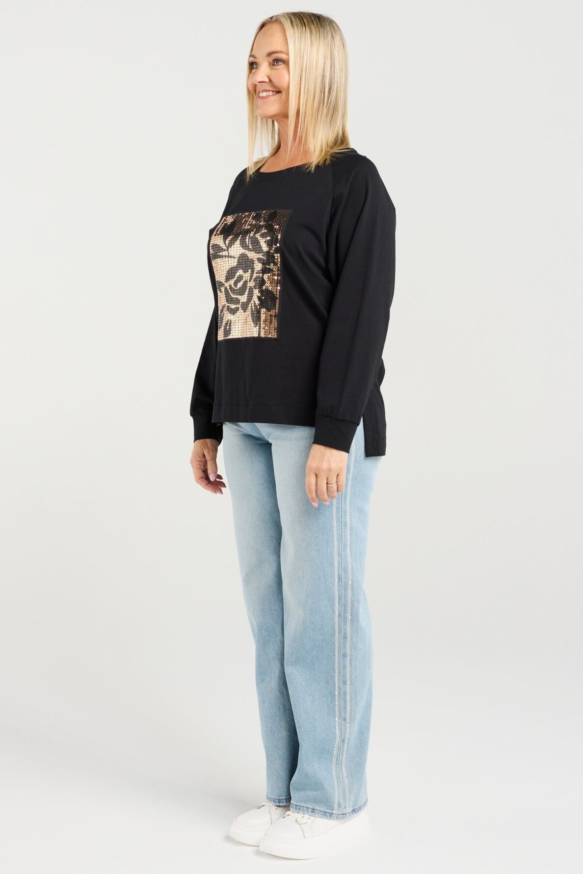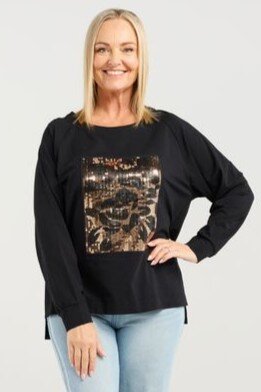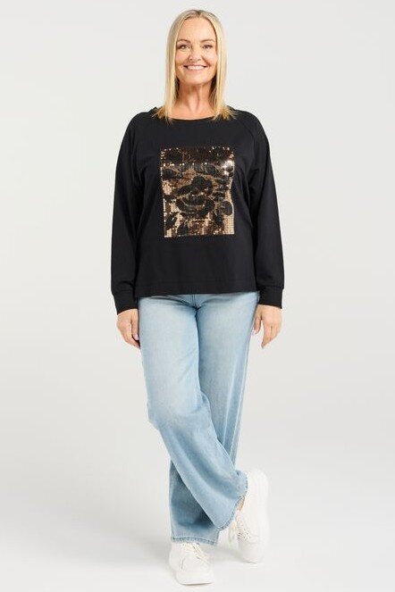 This long-sleeve top features a clean round neckline and a bold square sequin floral print that adds a touch of winter sparkle. Its effortless silhouette makes it easy to style with both casual and dressier looks. A standout piece for the season.