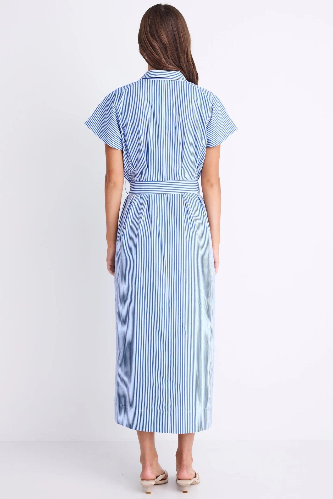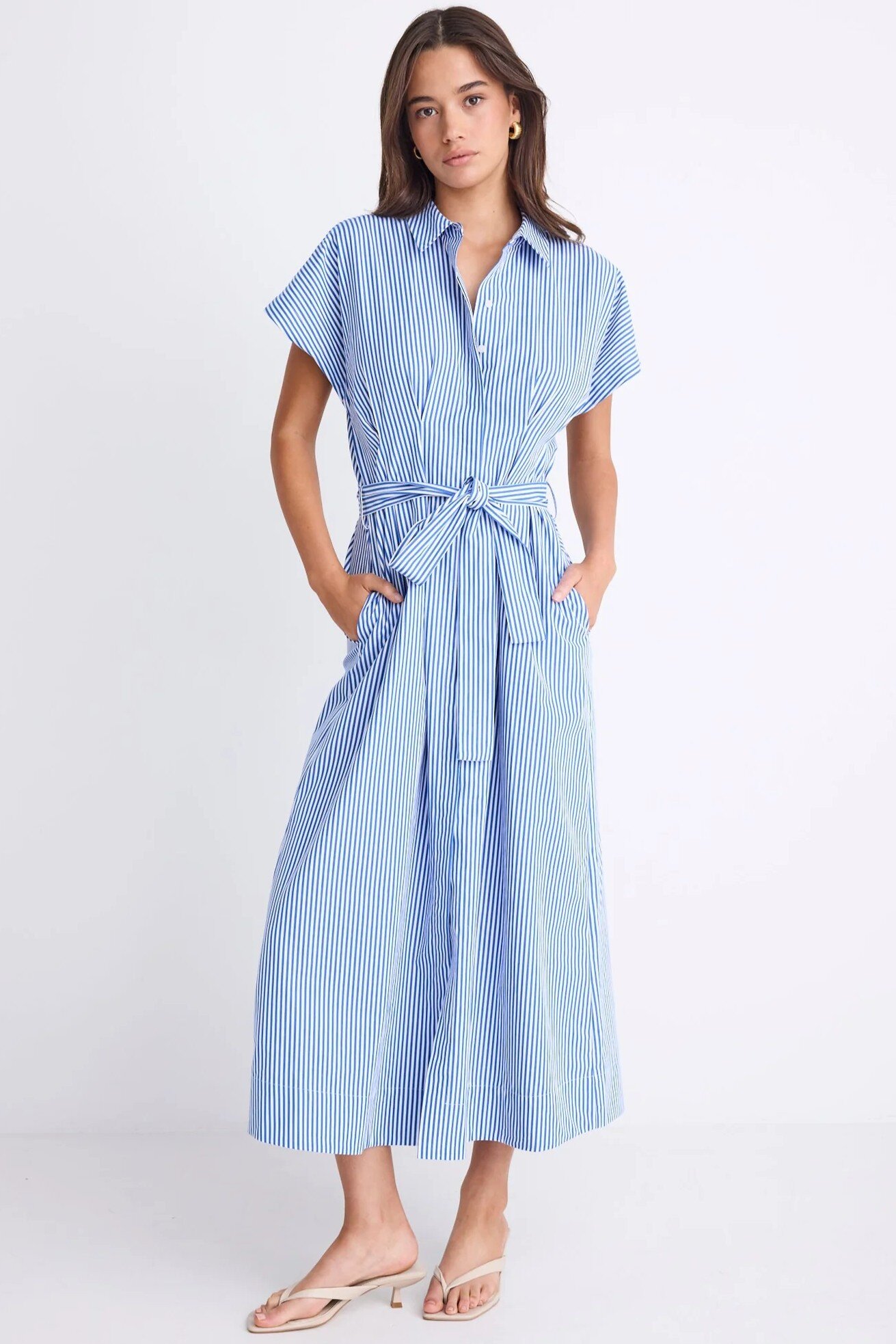 Crisp, clean, and endlessly wearable, the Camden Shirt Dress is a modern twist on a classic. Designed in fresh bright blue stripes, it features a relaxed shirt-style top with a button front and a tie belt to cinch at the waist. The pleated skirt adds movement and polish, while the 100% cotton natural fibre keeps it breathable and easy to wear.