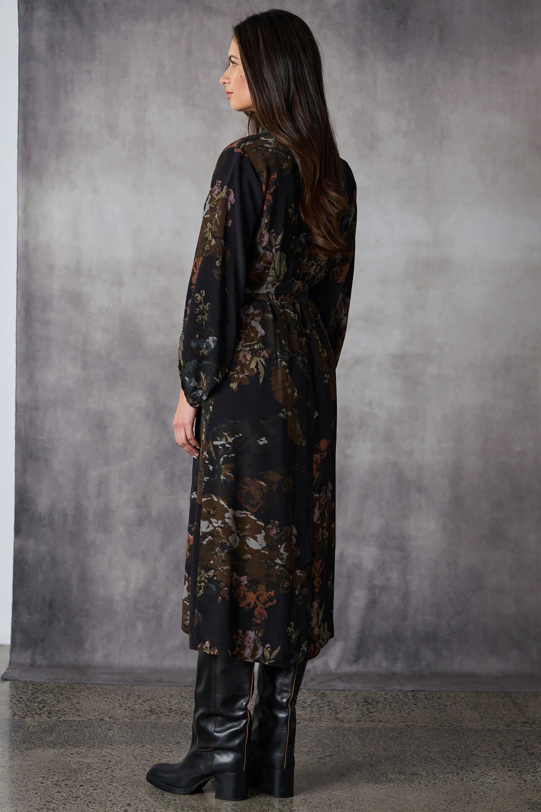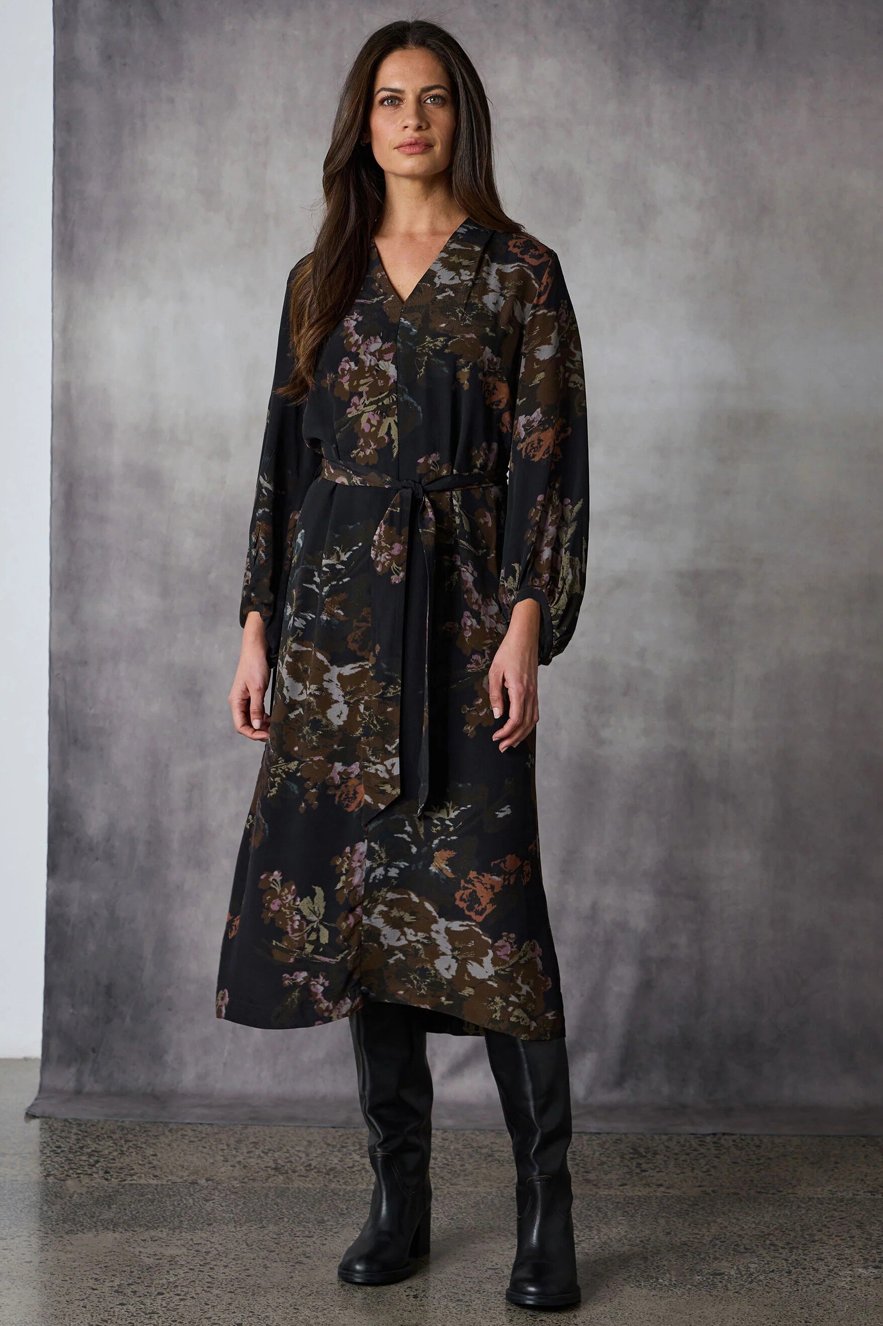 The Cameo Dress is a slimline midi with a flattering bust dart and V-neckline. Featuring softly gathered full-length sleeves with bound cuffs and a tie belt to cinch the waist, this elegant piece transitions seamlessly from day to evening, exuding timeless sophistication and feminine charm.