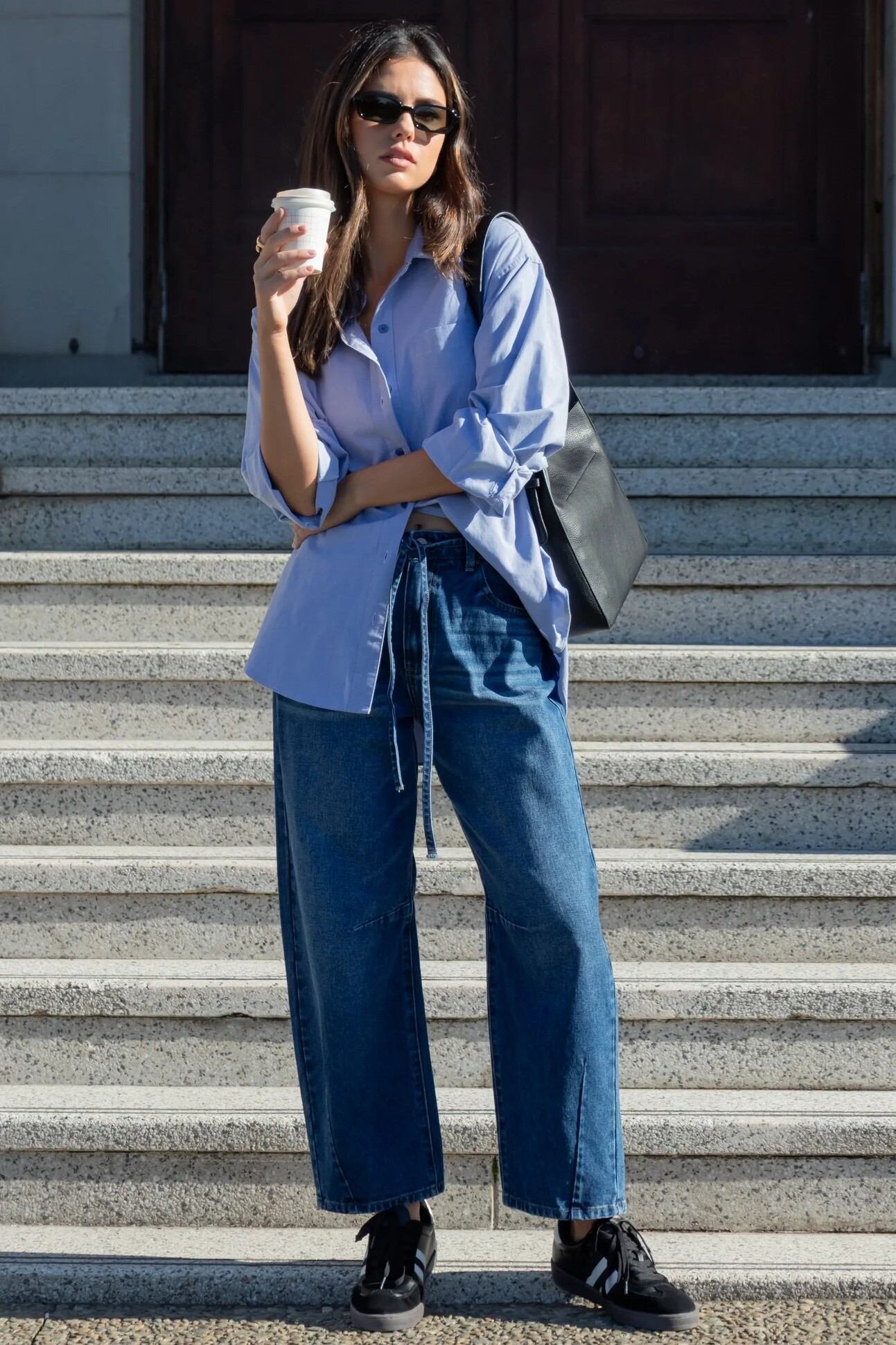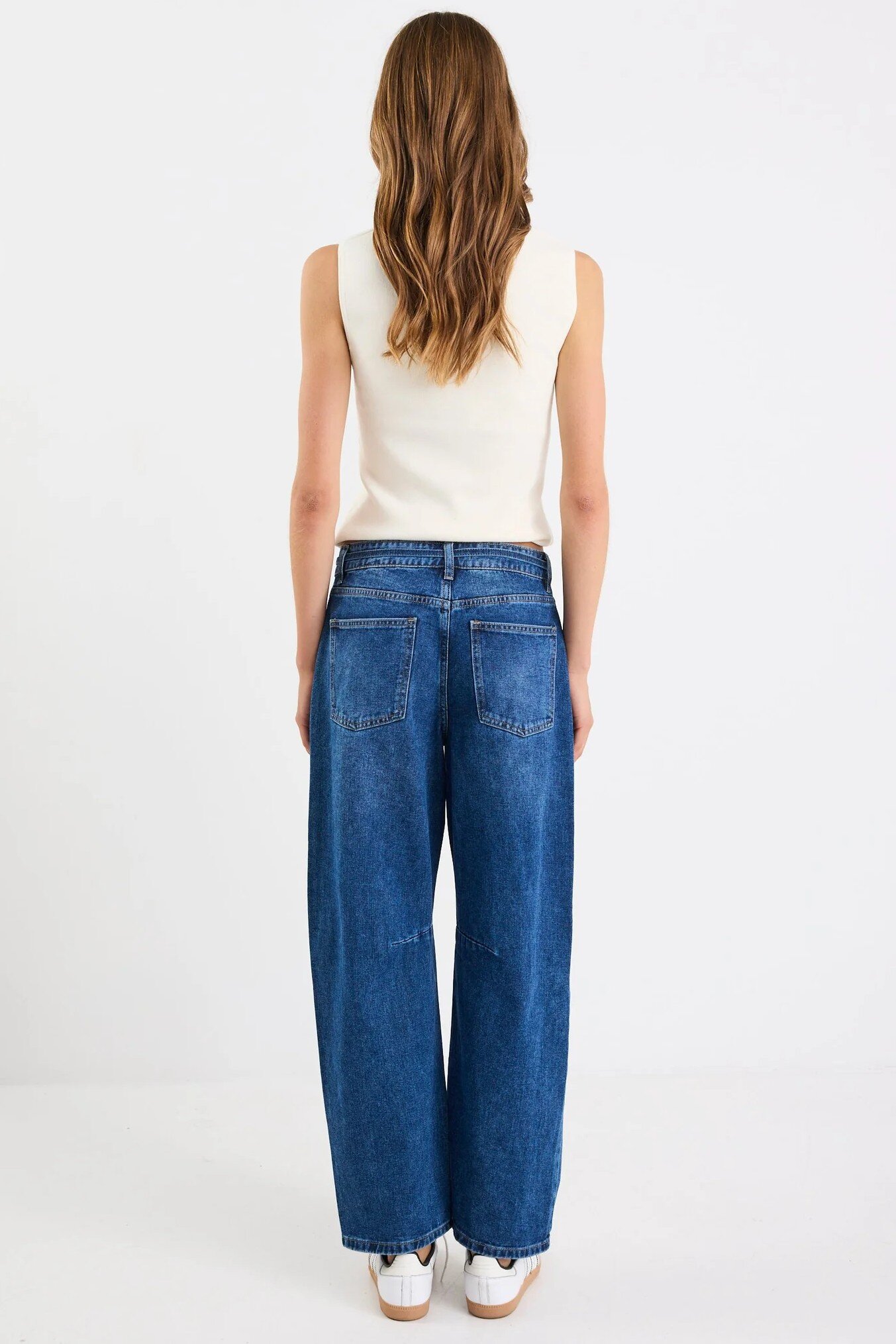 Meet your new off-duty essential high-rise barrel leg jeans! Crafted from 100% cotton for a structured yet comfortable feel. Designed in a rich dark denim, they bring effortless style to your everyday wardrobe. Featuring a relaxed silhouette and self-tie waist, they’re perfect for pairing with everything from tees to tailored shirts.