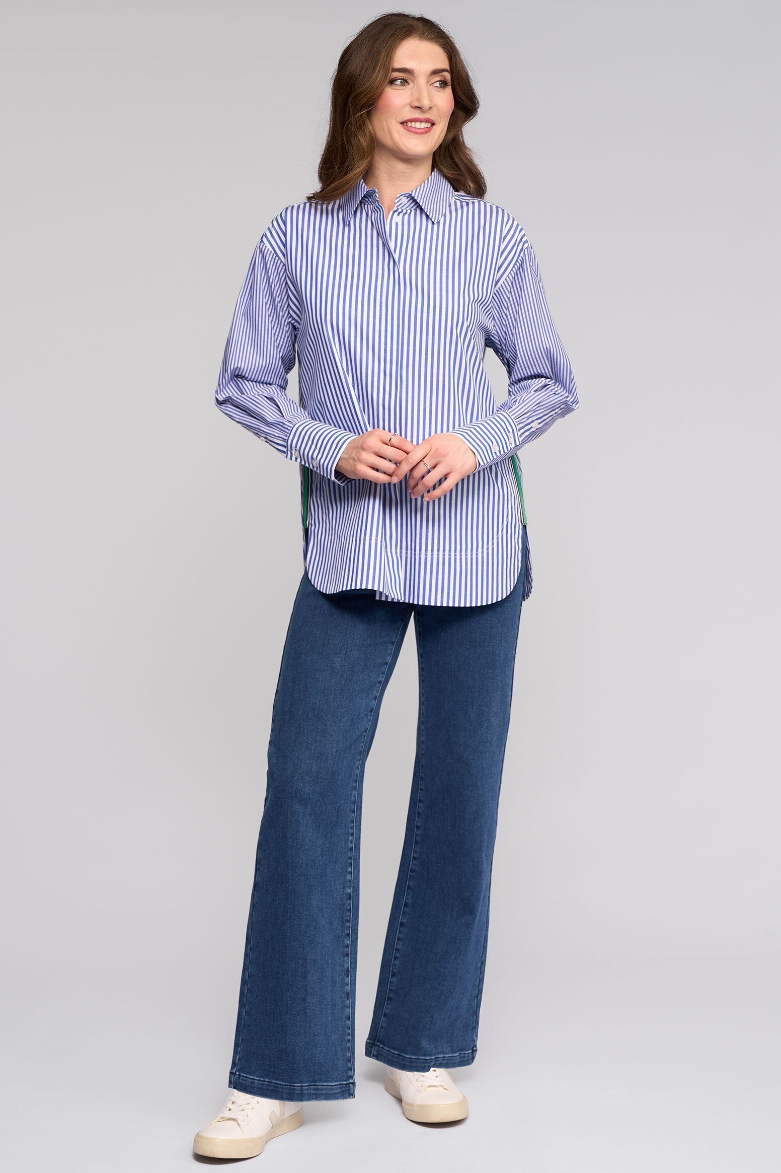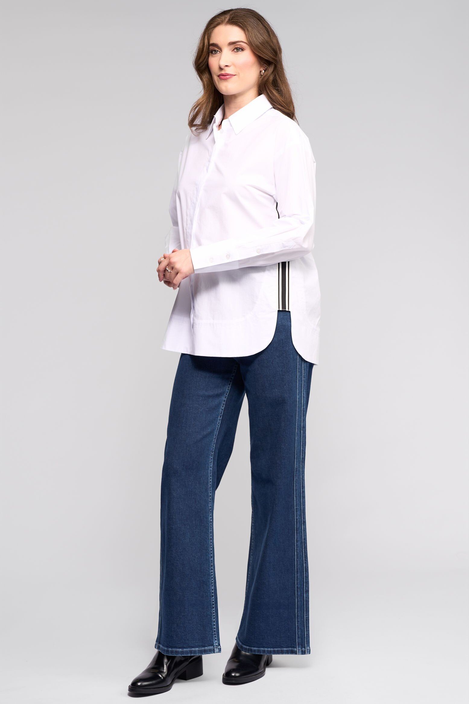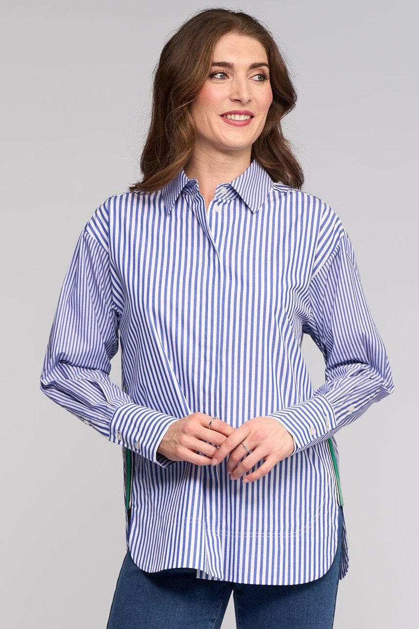 Oversized crisp cotton shirt, designed with a contrast stripe running down the side for a graphic finish. Designed for a relaxed, contemporary fit, this structured cotton style offers a bold yet wearable take on classic shirting.