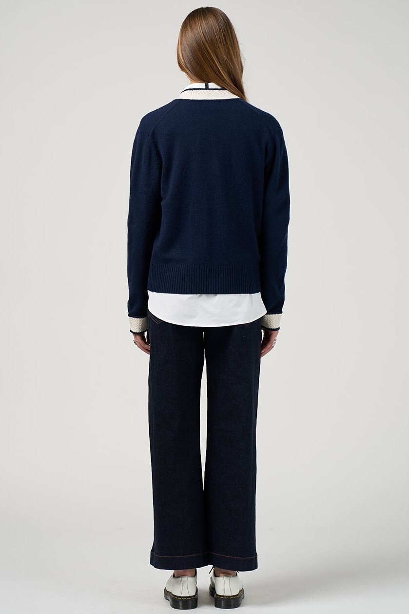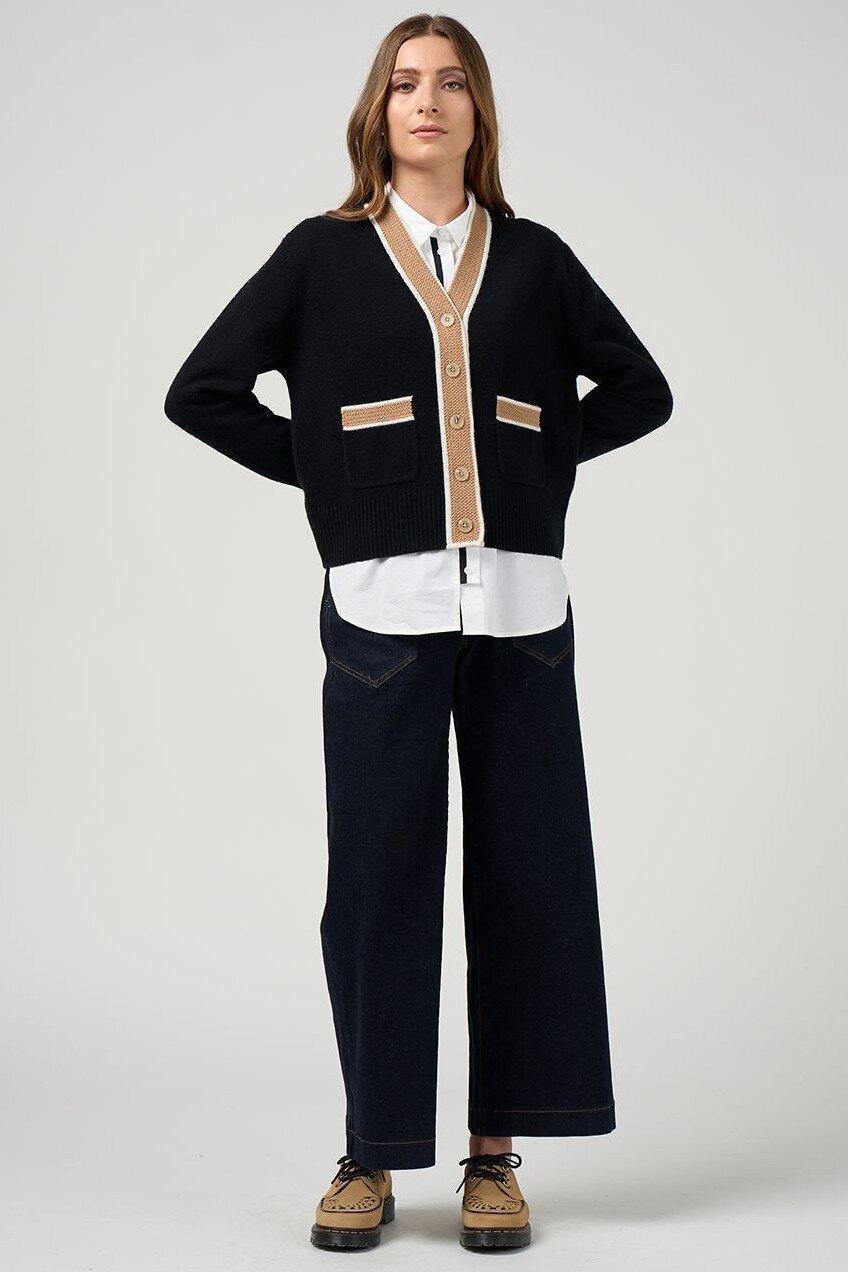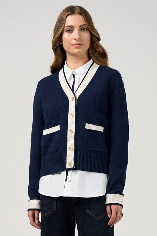 Super soft cardigan in a merino-cotton blend featuring a textured stripe detail on the neckband, centre front button stand, cuffs and pocket trim.