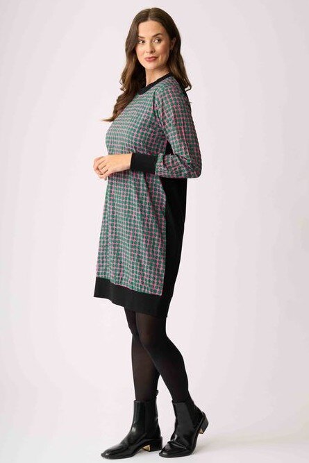 Winter dress featuring a printed woven front fabric and a plain knit fabric at the back