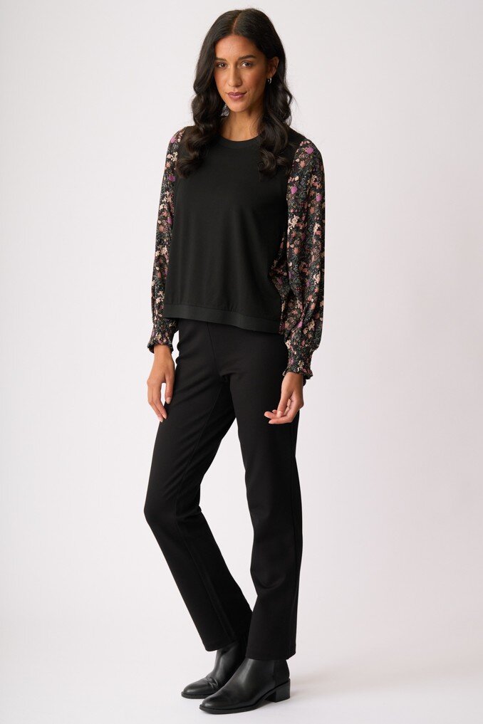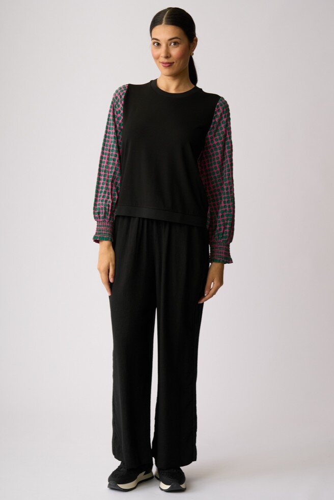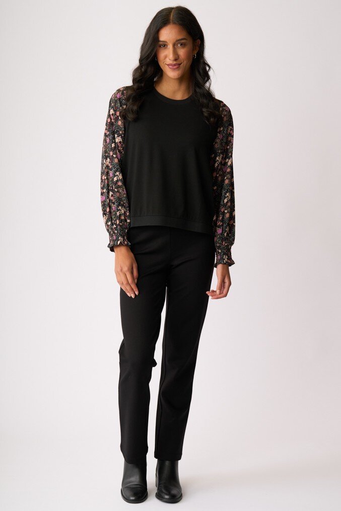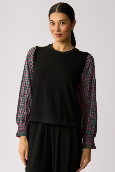 Knit front with a contrast printed woven back body and sleeves
