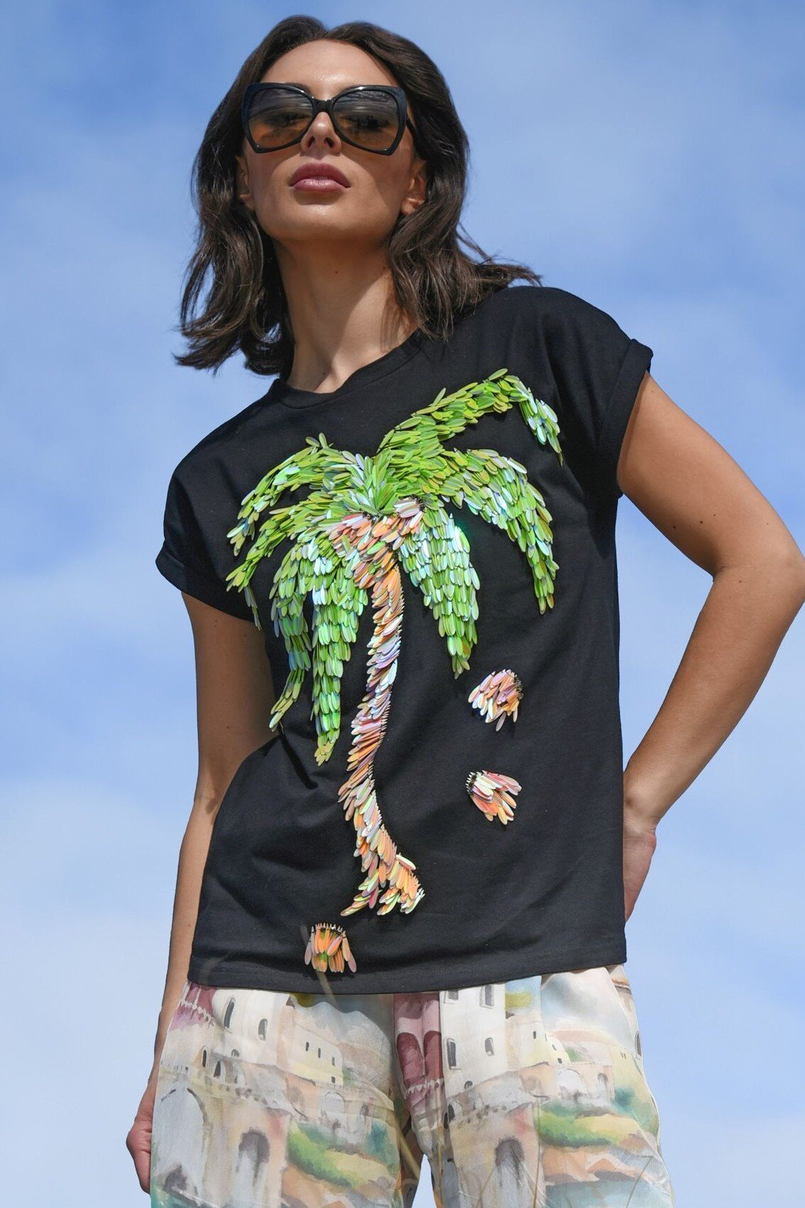 Adorned in eye-catching lustrous sequin and boasting summer with the palm tree motif, the ‘Crown Jewels’ t-shirt is the perfect addition to dress up a casual outfit with ease. Crafted in the ‘Close Knit’ fabrication, this standard fit tee features fixed rolled cuffs and is detailed with gems amongst the sequins. Style from day to night, the bold print elevates your look with ease.