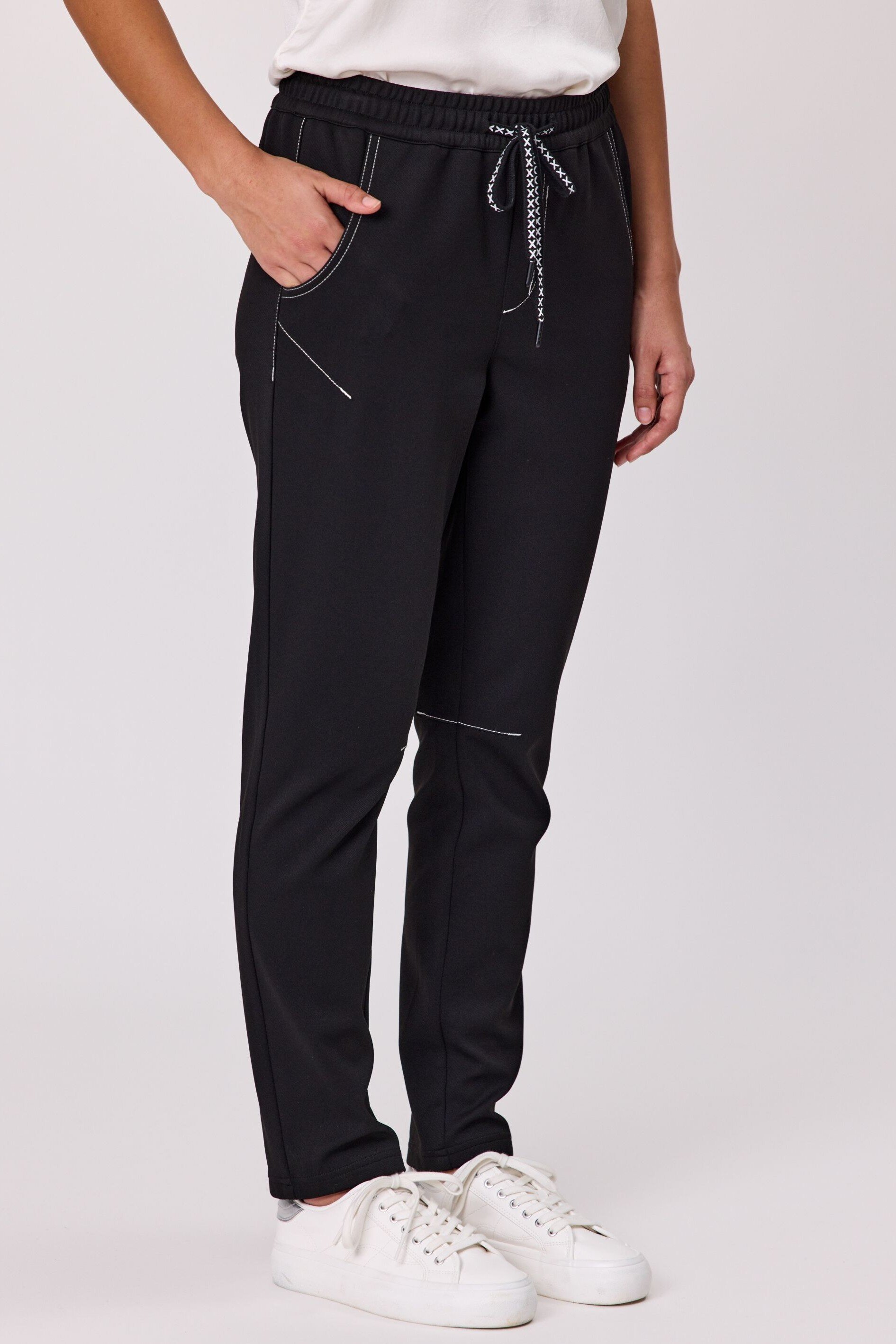 This Darcy Jogger in black is designed for comfort with a stylish twist. Featuring a drawcord waistband for an adjustable fit, contrast stitching for a modern edge, and functional pockets to keep essentials close.