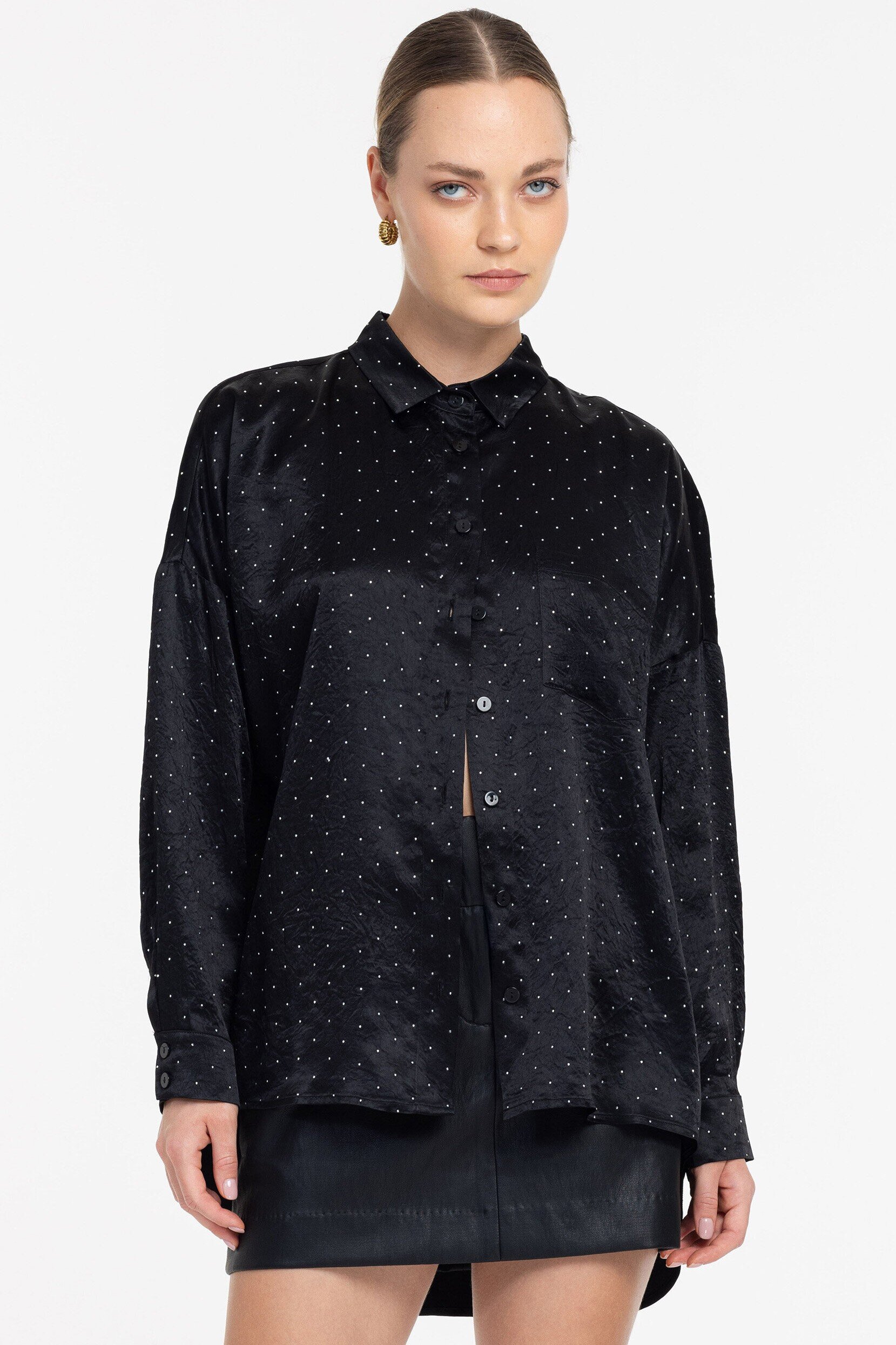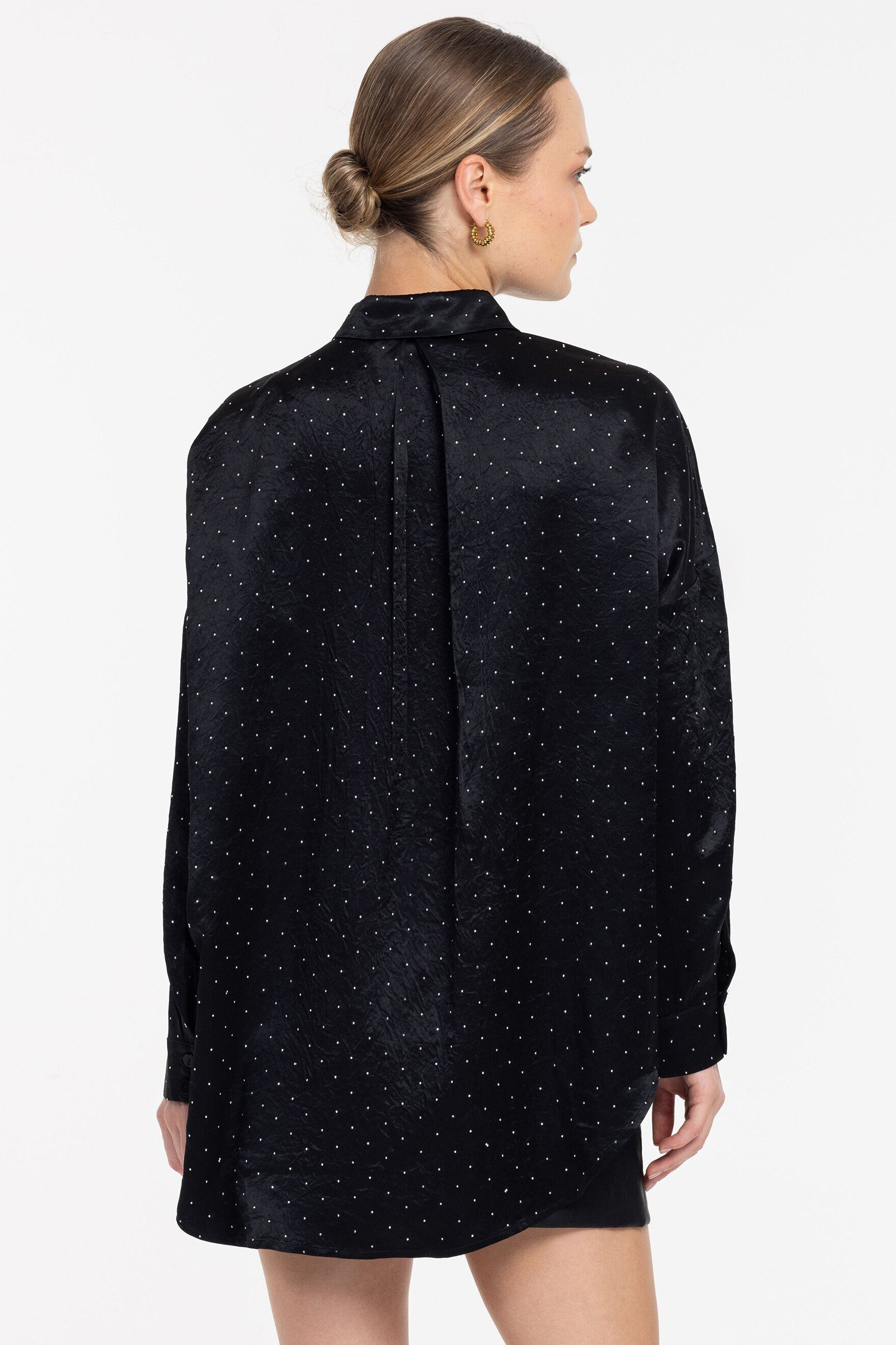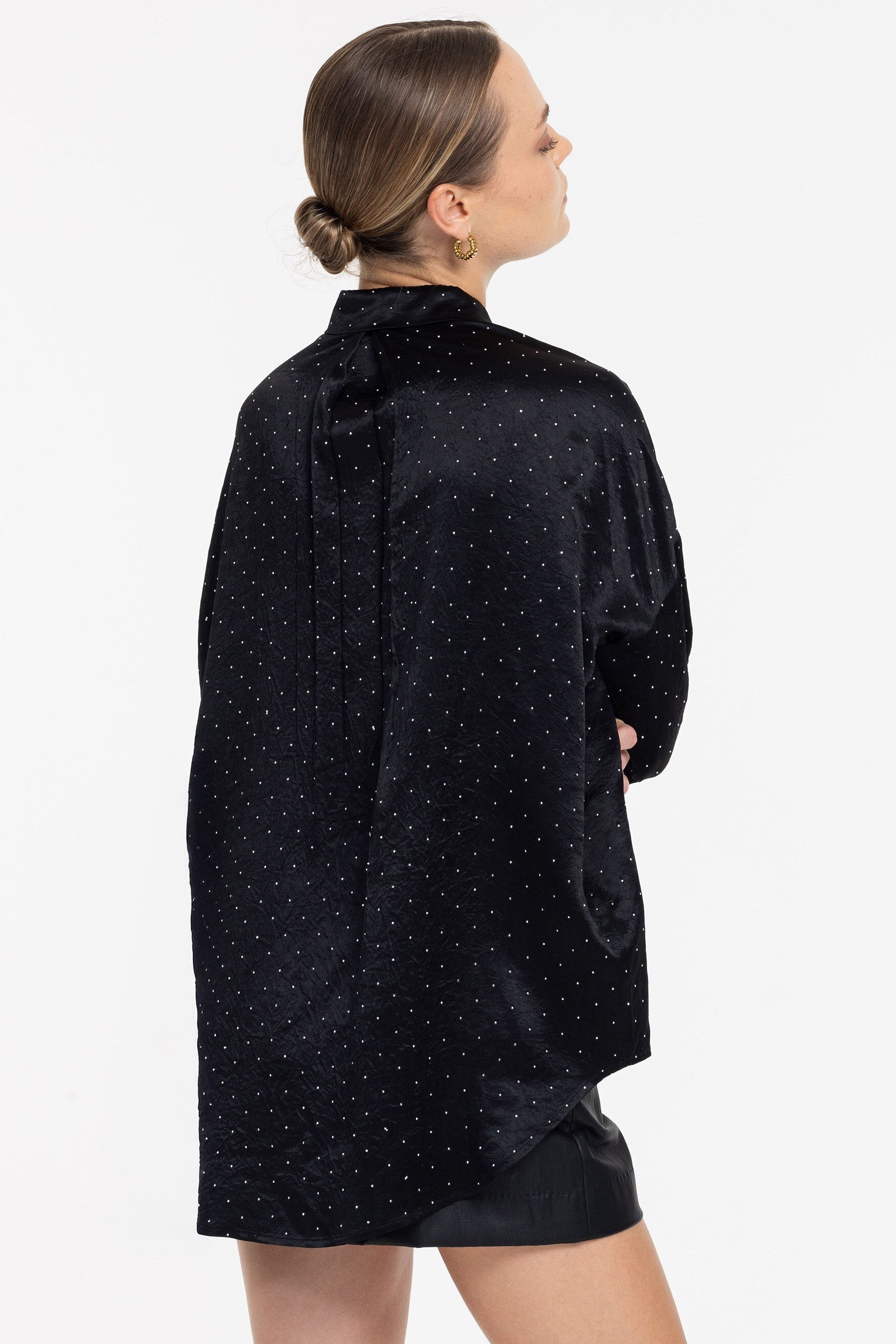A little sparkle, a lot of edge. Defiant is that perfect in-between piece - polished enough for dinner, bold enough for late nights. The glossy black satin is dusted with tiny silver diamantés for a luxe, light-catching finish, while the relaxed shirt silhouette keeps it effortless and cool. Style it with leather, denim, or go tonal with black-on-black.