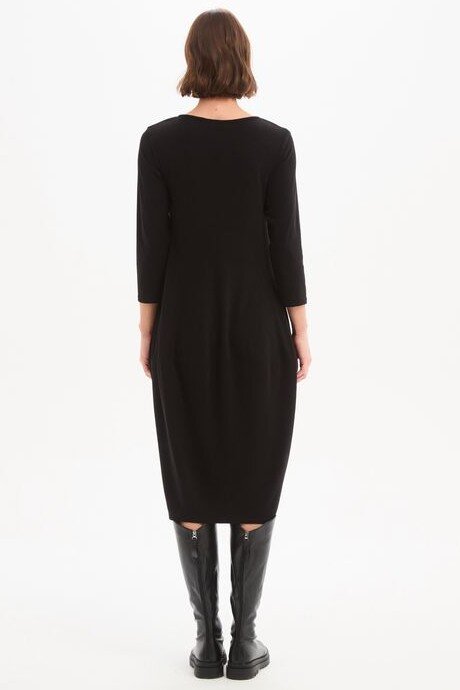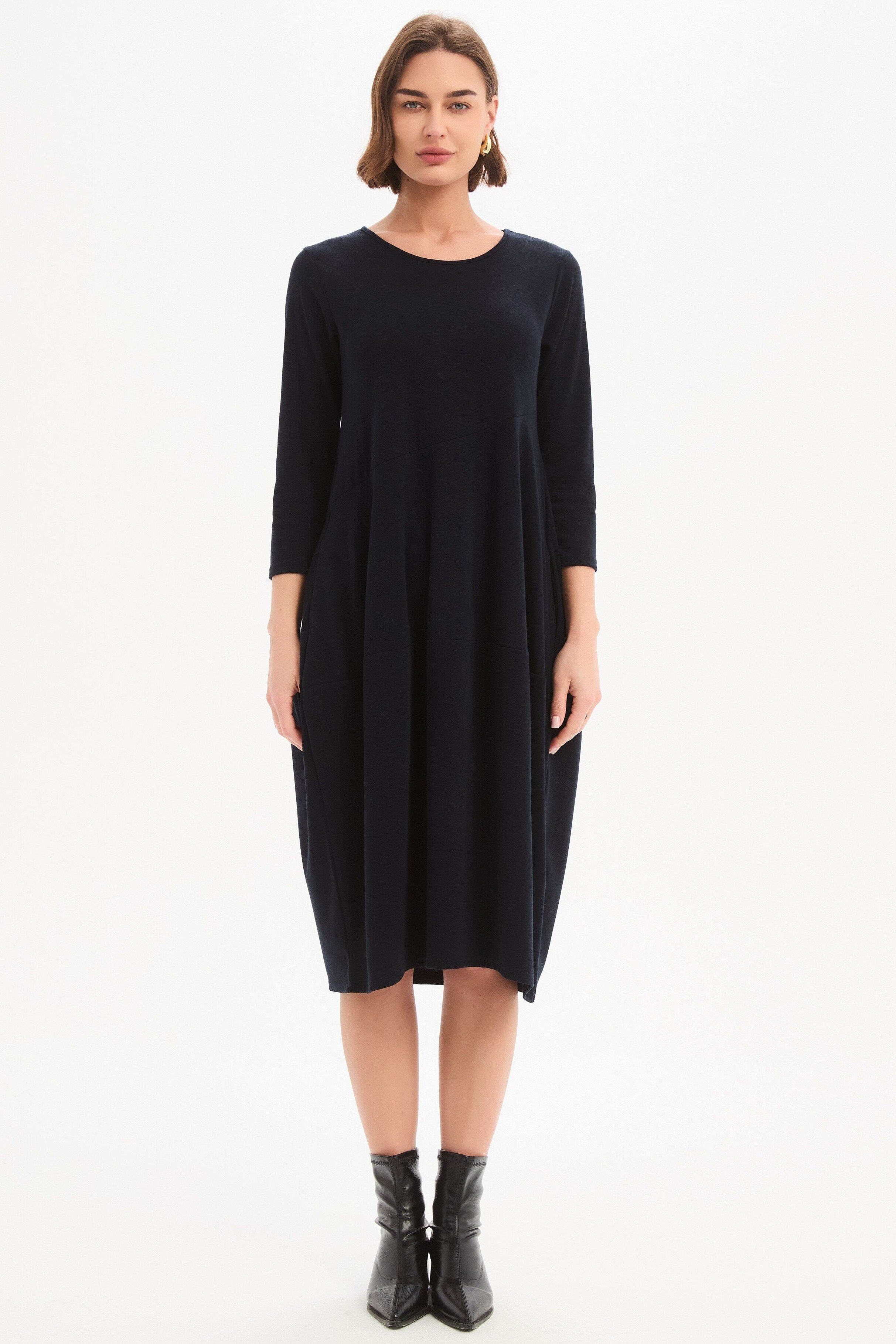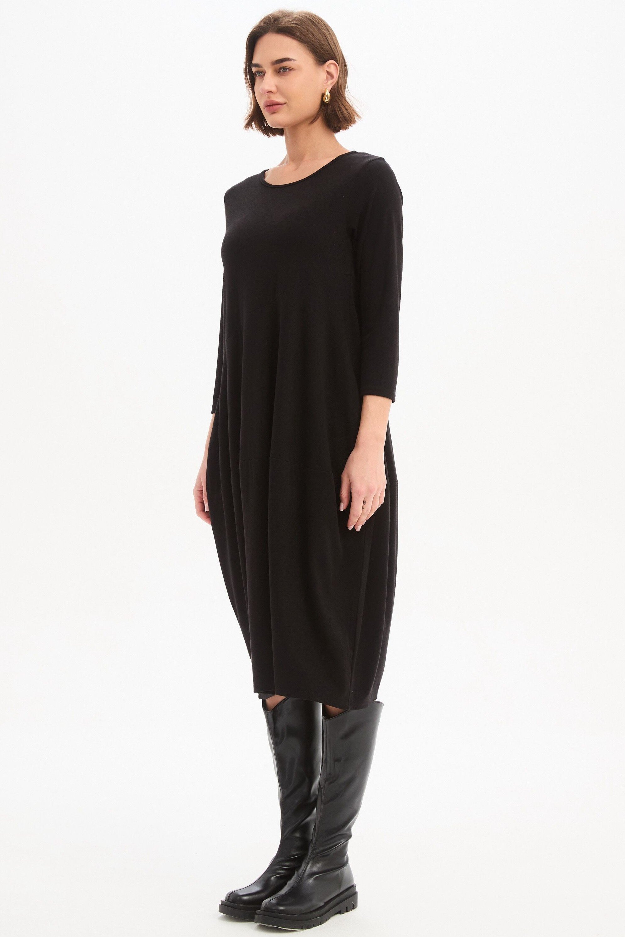 Designed for cooler weather, this midi dress features 3/4 sleeves and a flattering balloon skirt, complete with convenient side pockets for practicality.