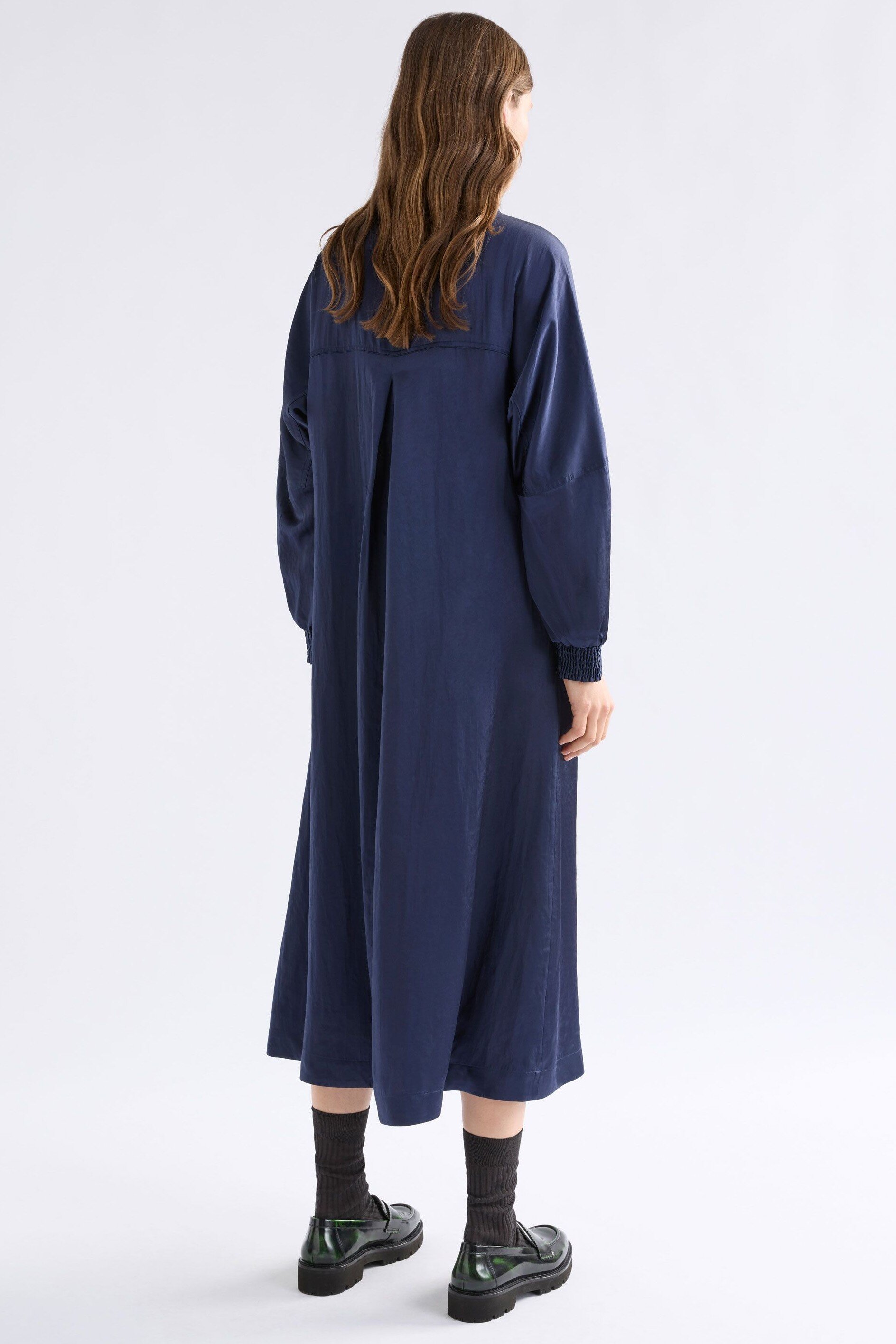 The Dree Dress is a refined, elegant shirt dress with a relaxed appeal. This is a midi-length dress is crafted from a silky, lustrous finish satin-like, ELK preferred fibre, NAIA acetate with a fluid drape and subtle sheen. A regular fit cut with a mandarin collar, button-through front placket, and long sleeves with ruched elasticated half cuffs. The shaped seam detailing through the body with removable self-fabric waist tie creates a flattering silhouette. Finished with side-seam pockets, back yoke, and centre back box pleat. This timeless dress is the perfect understated evening piece. Pair with metallic gold or silver jewels to elevate to the next level.