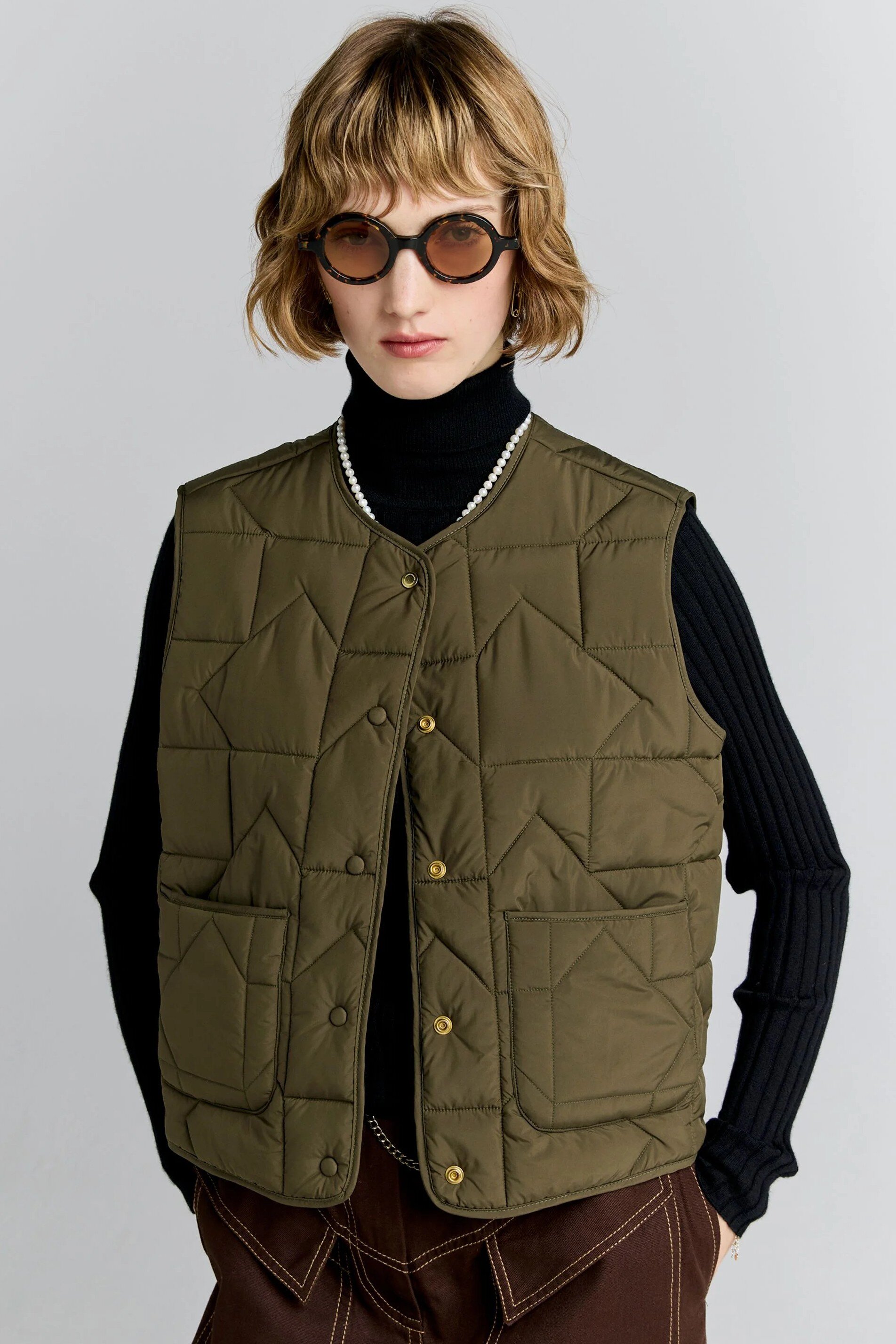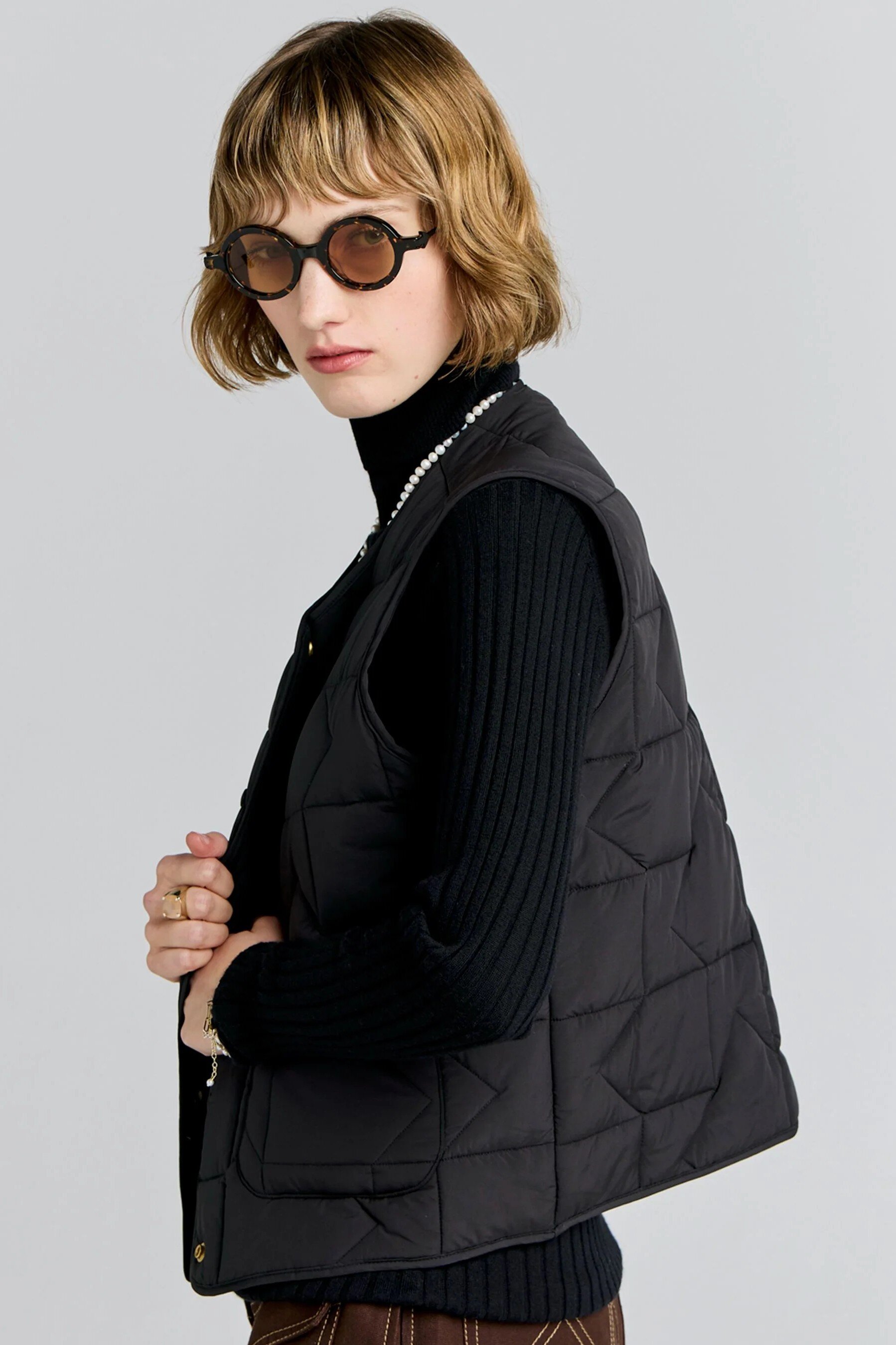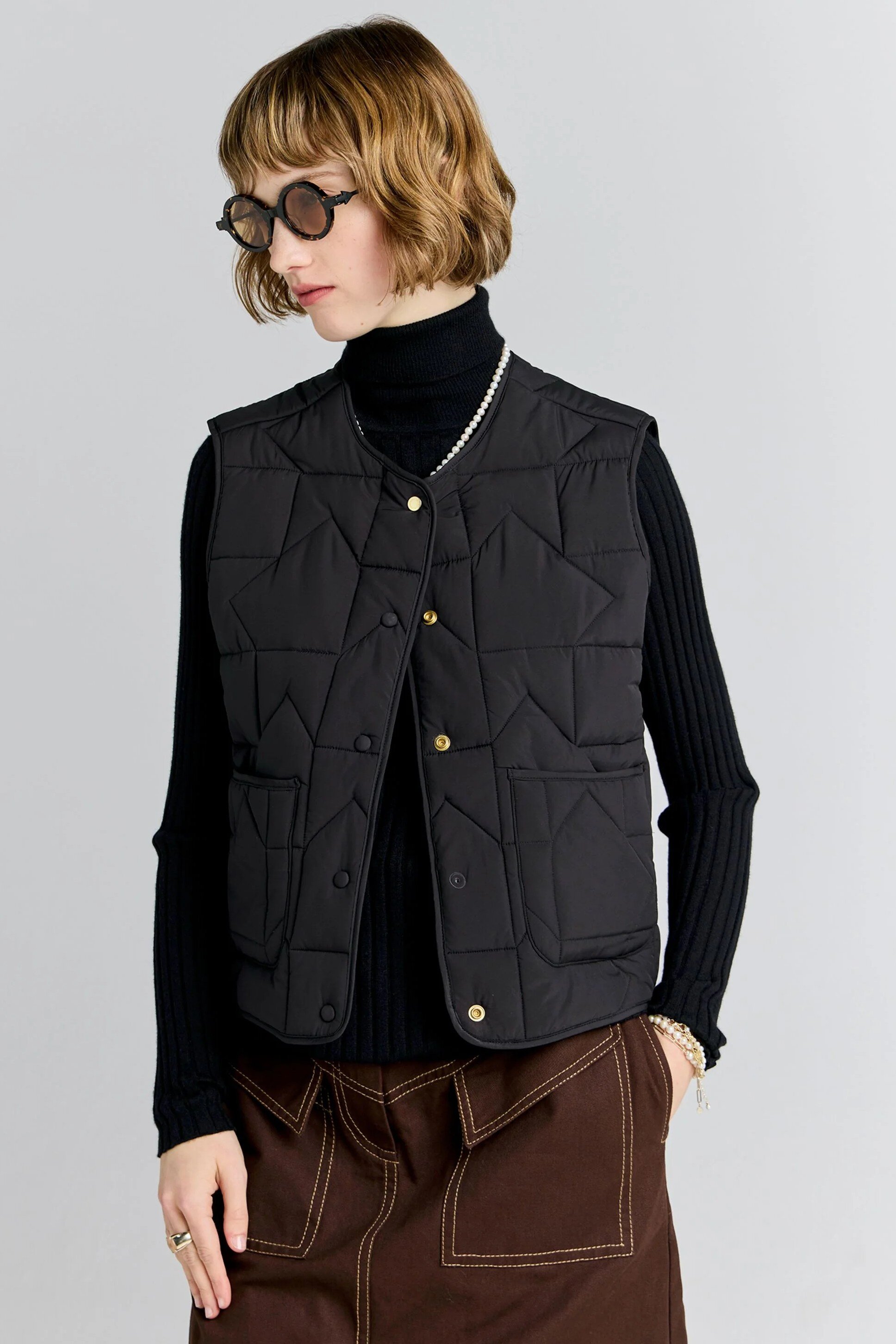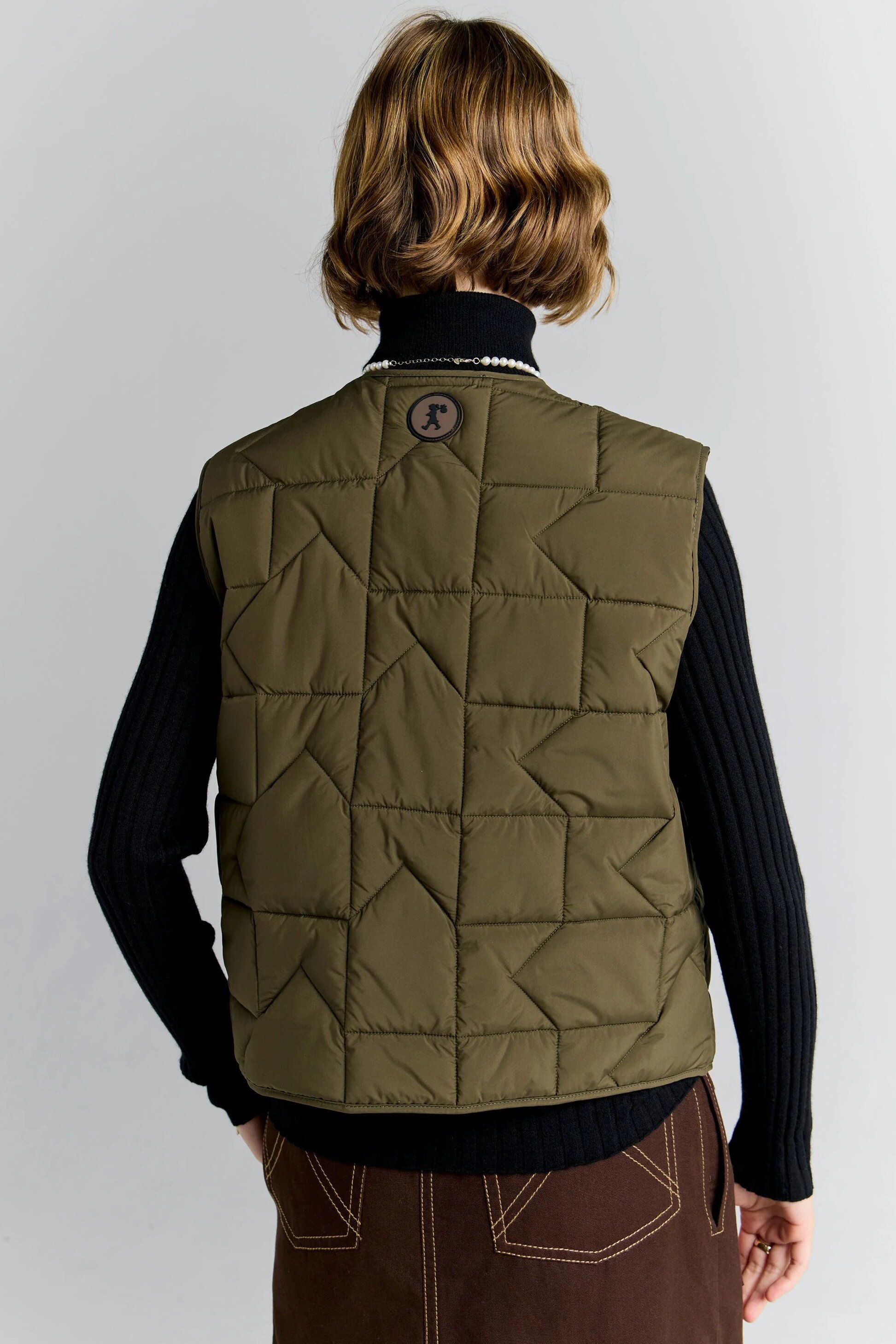 The Quilted Drift Vest offers a refined update on a classic layering piece. Designed with a lightweight padded fill, it delivers warmth without bulk in an easy, sleeveless silhouette. Subtle quilting traced with the KW monogram adds considered detail, while the clean, boxy shape allows for effortless layering over shirts and knitwear. Finished with a snap-button front closure and front patch pockets, this vest balances practicality with a polished, modern feel.