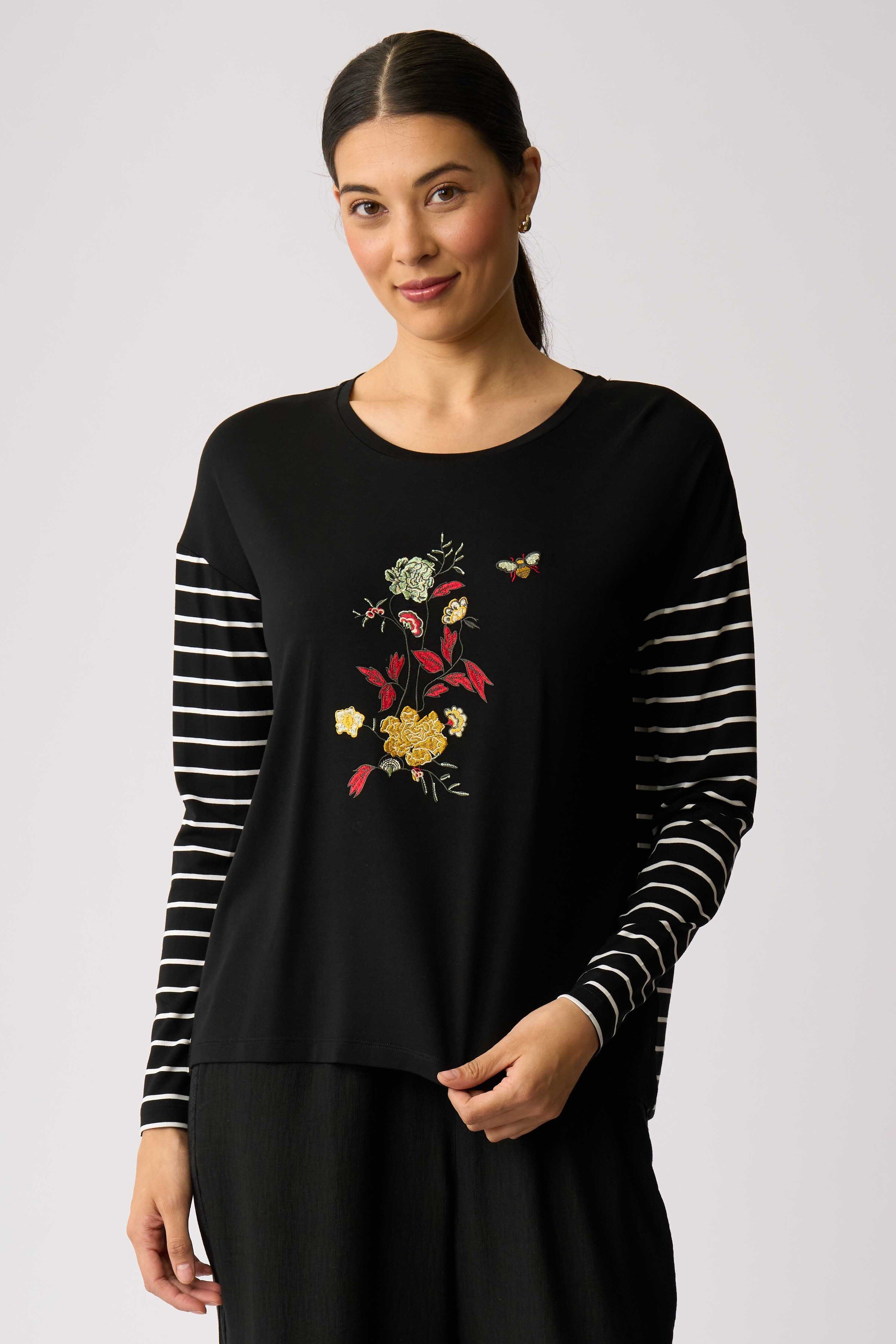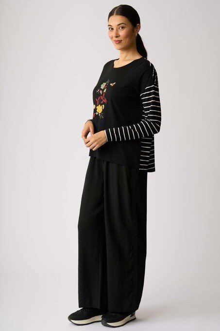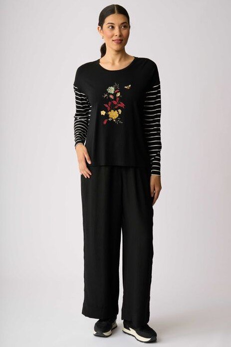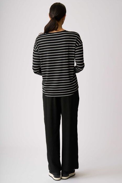 Knit top with contrast stripe sleeves and back.Contrasting plain with stripe and placement print.Drop shoulder.Scoop neck.Long sleeves.Composition: 95% Viscose, 5% Elastane