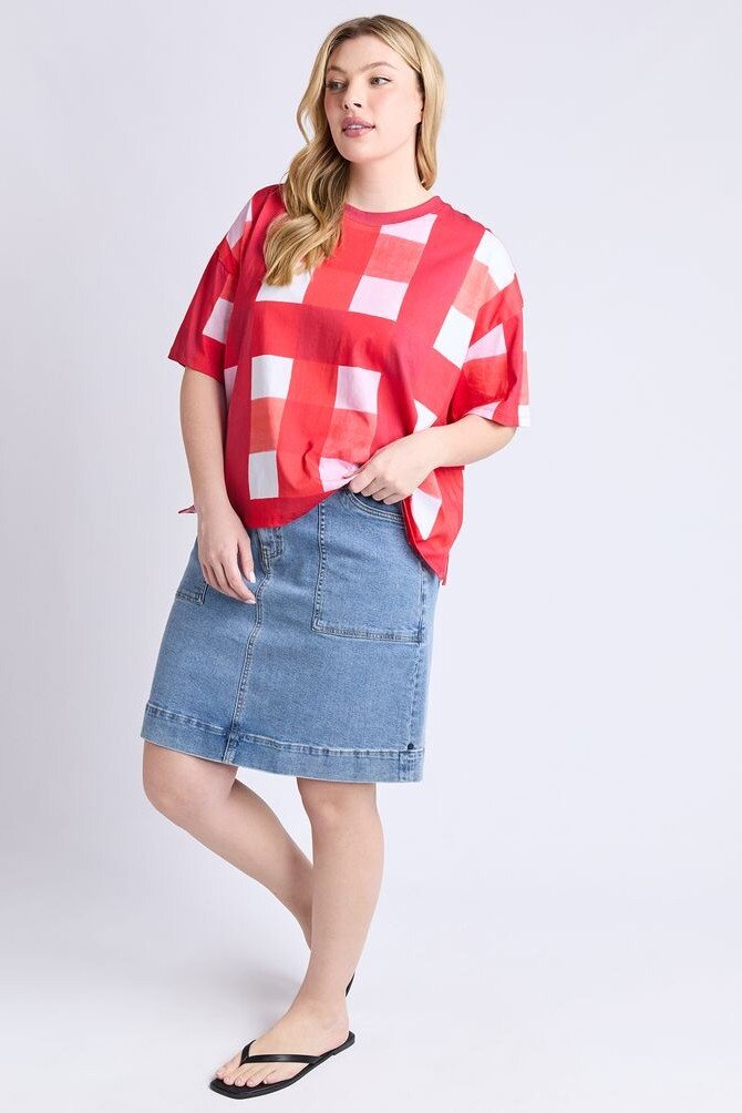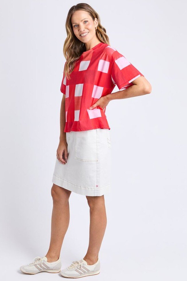 Featuring the exclusive Christmas Poppy Check the Edin Tee bring the fun of the party to any outfit with the colour and comfort of a 100% cotton tee.