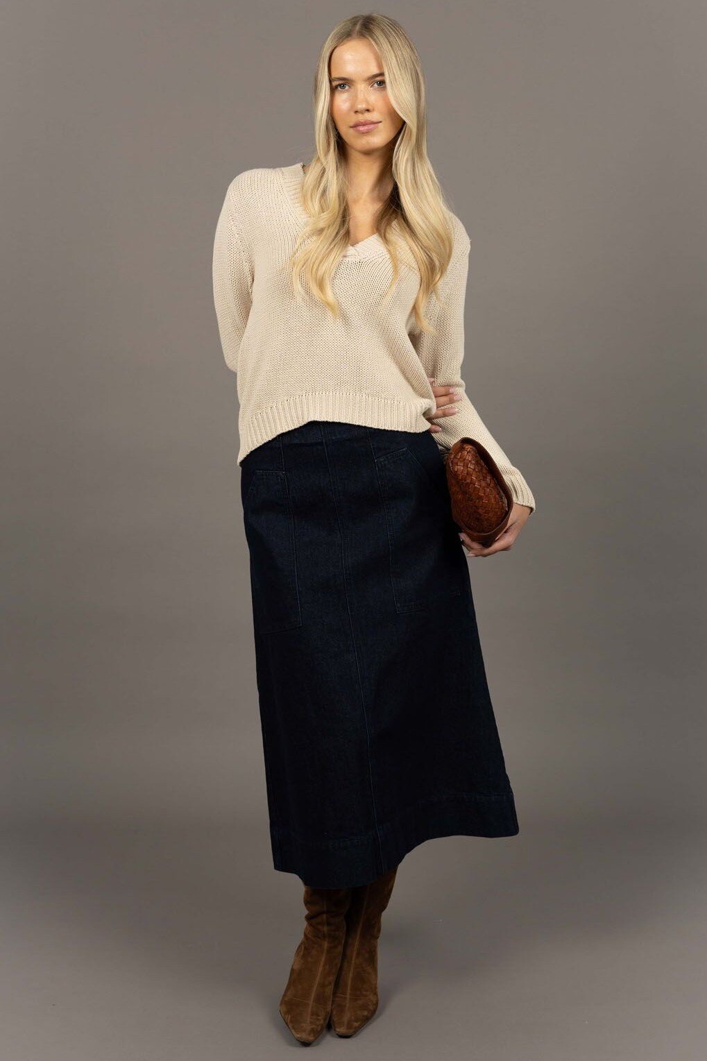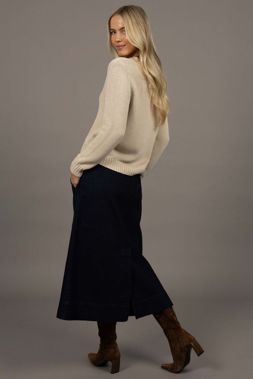 The Edit Denim Skirt is your elevated denim go-to. Designed with A-line silhouette, it offers a structured yet easy fit. The patch pockets add a practical edge, while subtle stitch details keep the look refined. Layer with cozy knits now and switch to fresh cotton tops as the seasons change.