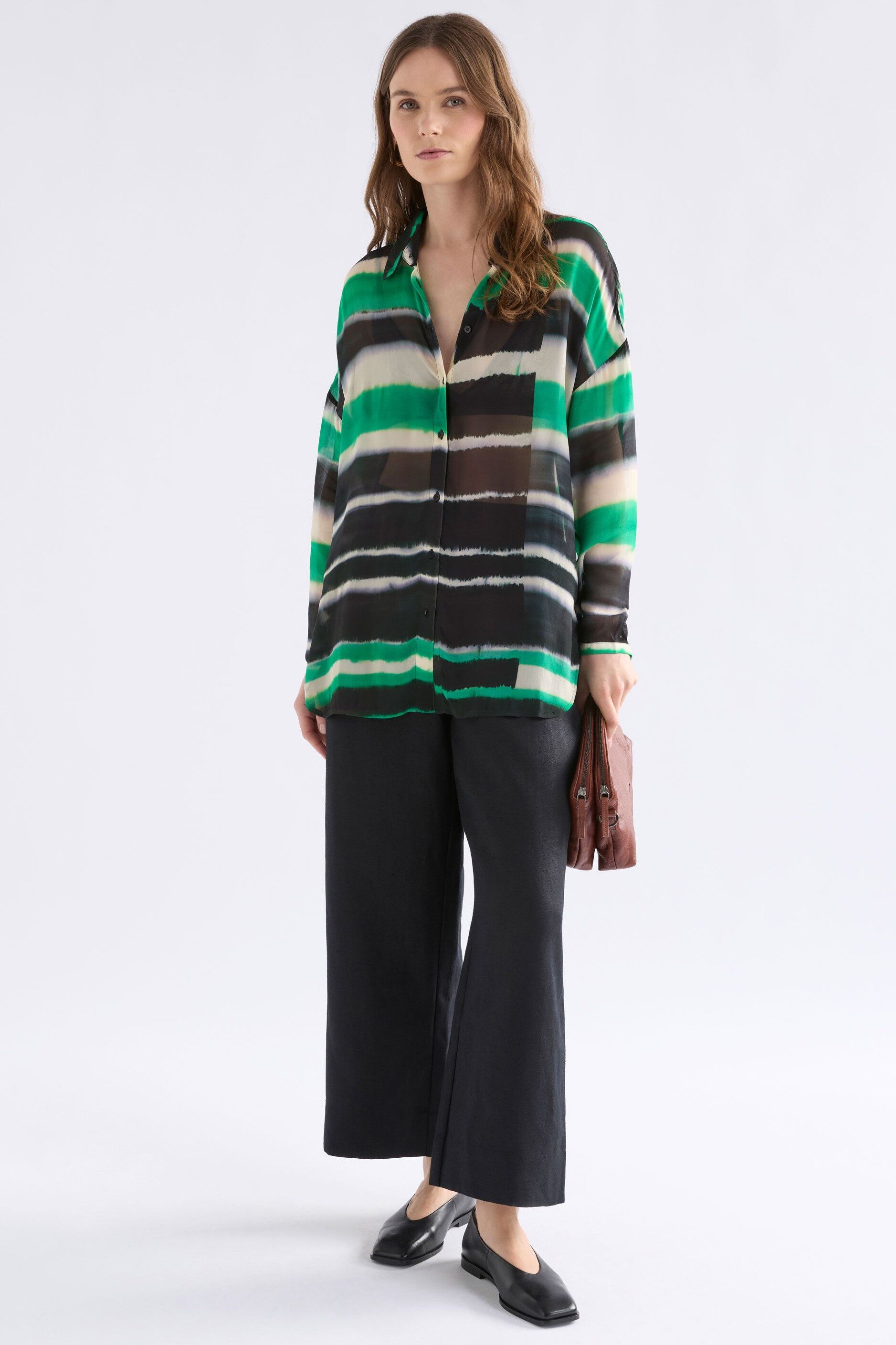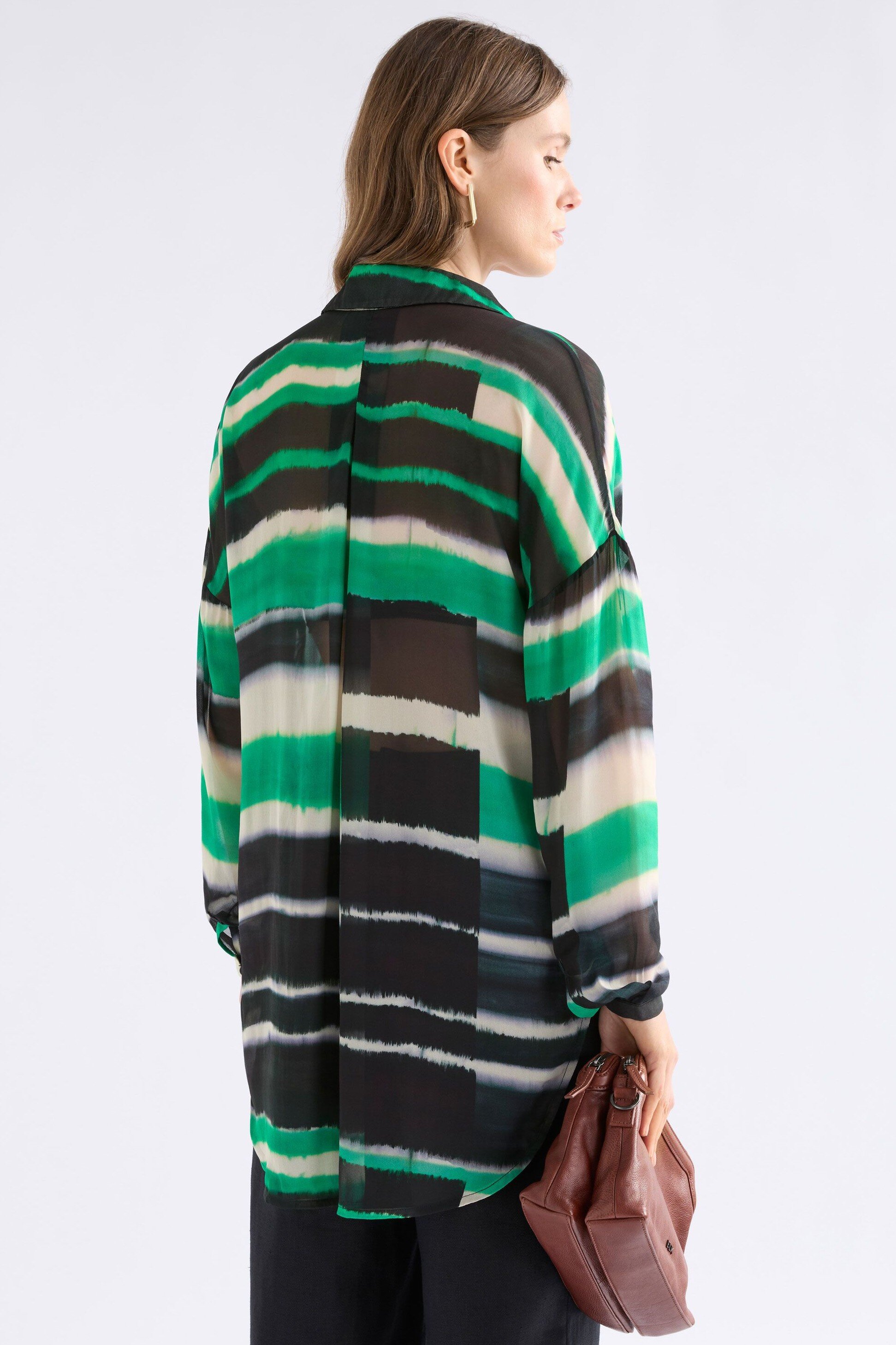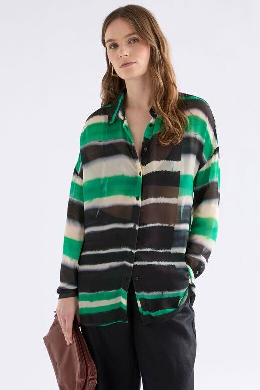 The Eir Sheer Shirt is an ELK classic, long-sleeved style crafted from a semi-sheer viscose with a soft drape and crepe-like feel. Featuring the vibrant and striking, tie-dye-look Saillte Print of ink and verdant green. This shirt is cut with a regular fit, classic collar, dropped shoulders, exposed button placket and finished with natural Corozo nut buttons. The subtle high-low, curved hem gives a modern silhouette and makes it perfect for layering over camisoles or singlets or tucking into tailored trousers.