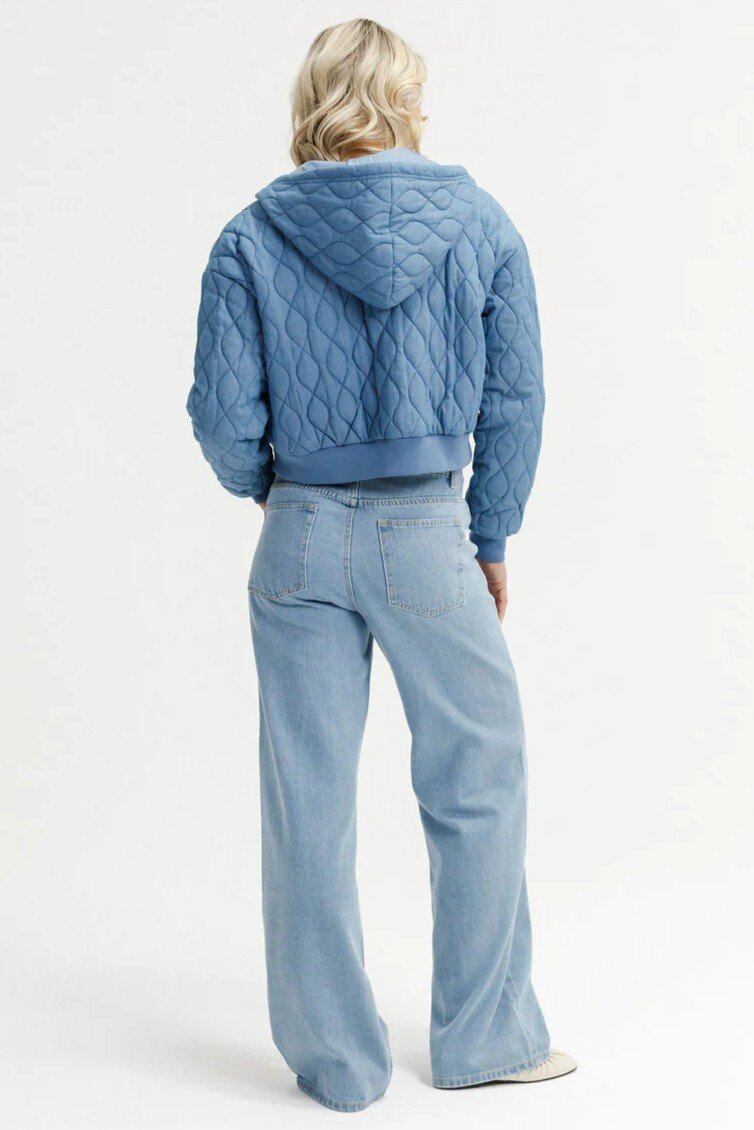 The Emily Jacket in Sapphire is your new go-to for laid-back, stylish layering. This slightly cropped bomber jacket is designed to pair perfectly with high-waisted pants, offering a flattering silhouette with just the right amount of edge. Featuring a zip-up front and a practical hood, it’s as functional as it is chic, with cozy pockets to complete the look. Made in a soft cotton, it is quilted with a polyfill for just the right amount of warmth and style.