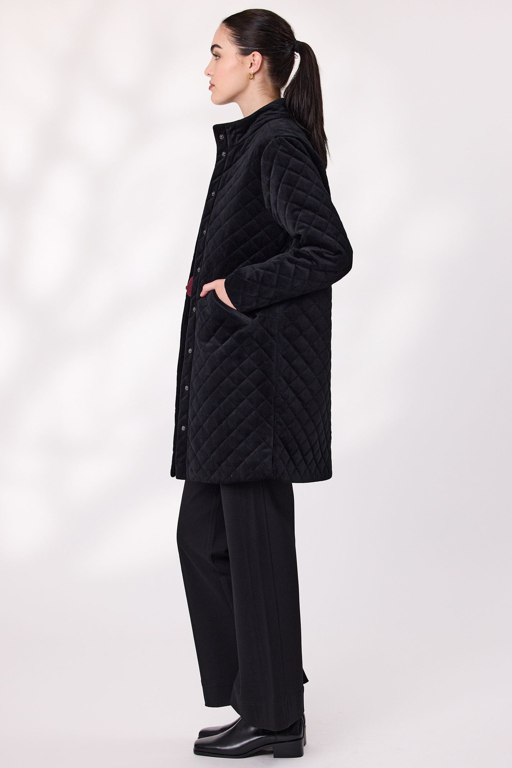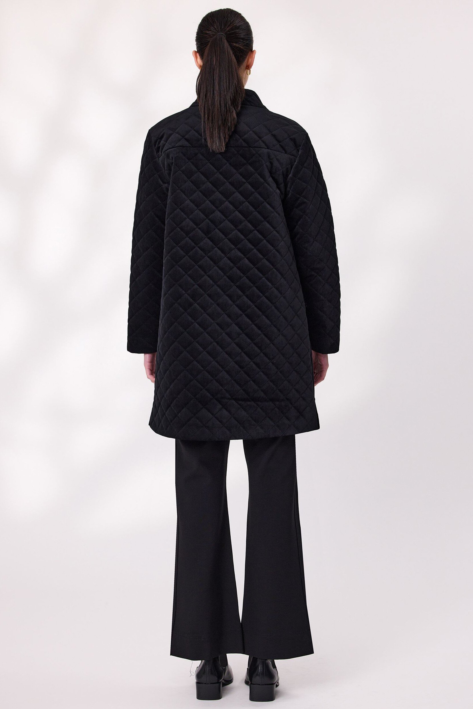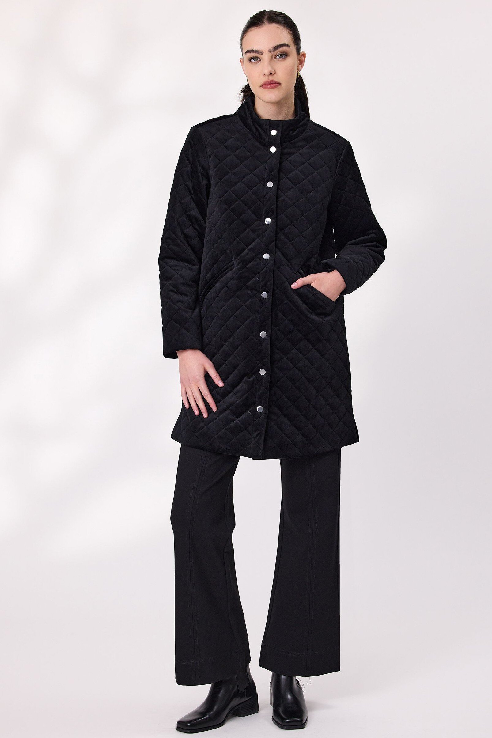 Step into effortless elegance with this long quilted velvet coat. It features a diamond-quilted texture that adds depth and sophistication. The full-length silhouette offers extra coverage, while the soft lining ensures comfort in cooler weather. A button-down front provides a classic finish and hip-level pockets.