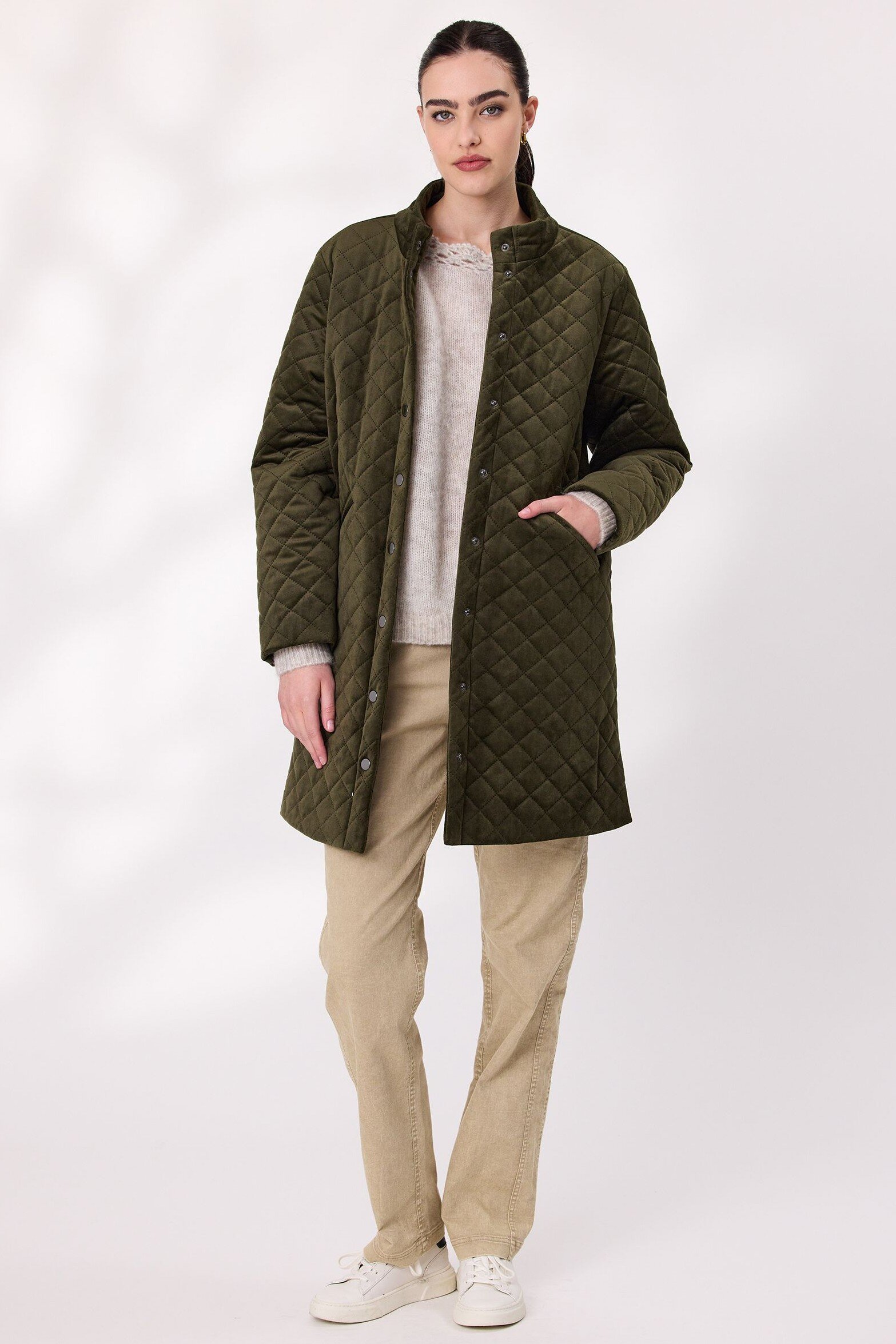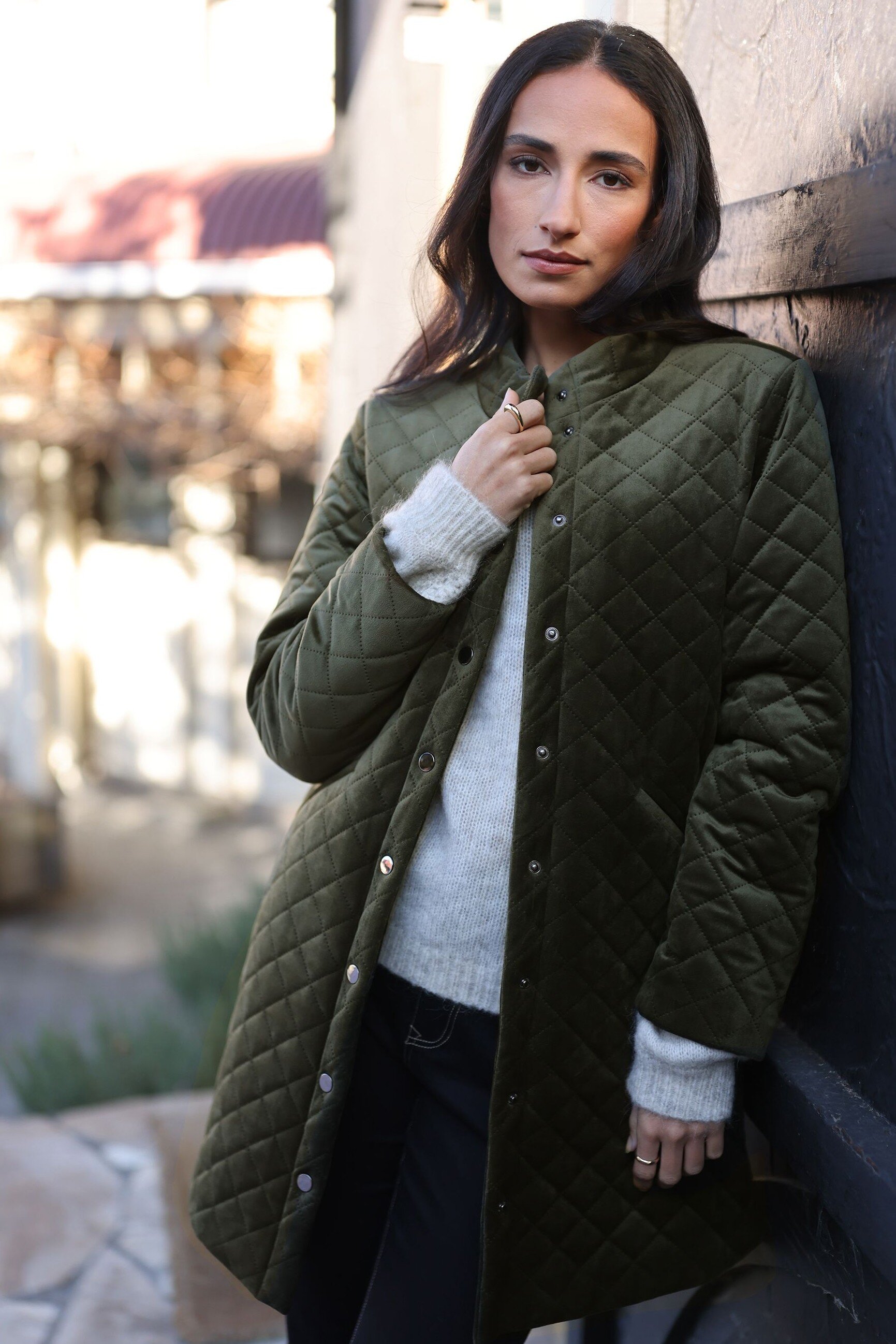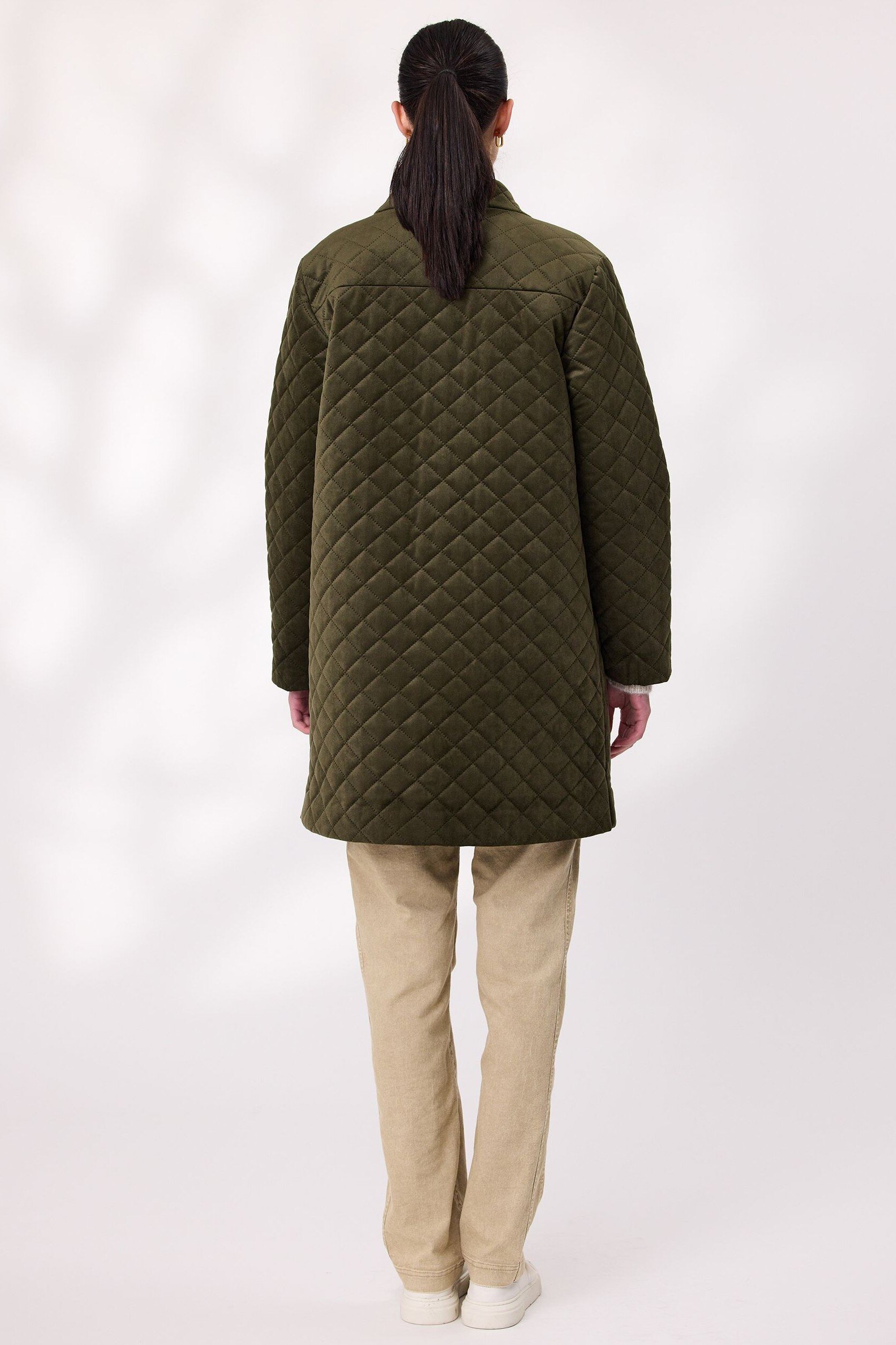 Step into effortless elegance with this long quilted velvet coat. It features a diamond-quilted texture that adds depth and sophistication. The full-length silhouette offers extra coverage, while the soft lining ensures comfort in cooler weather. A button-down front provides a classic finish and hip-level pockets.