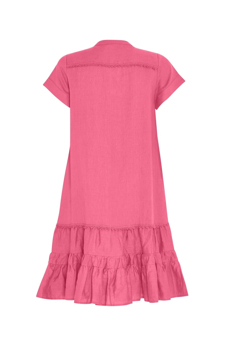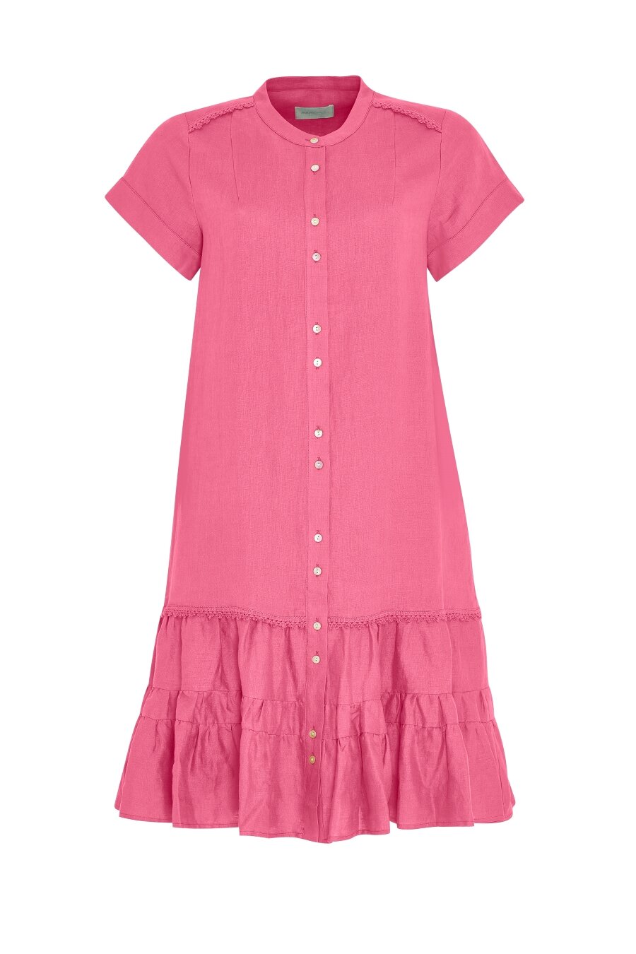 Button-through linen dress with short sleeves and a lower tiered panel. Featuring functional side pockets. Also comes in the colour Sea Green and Navy.