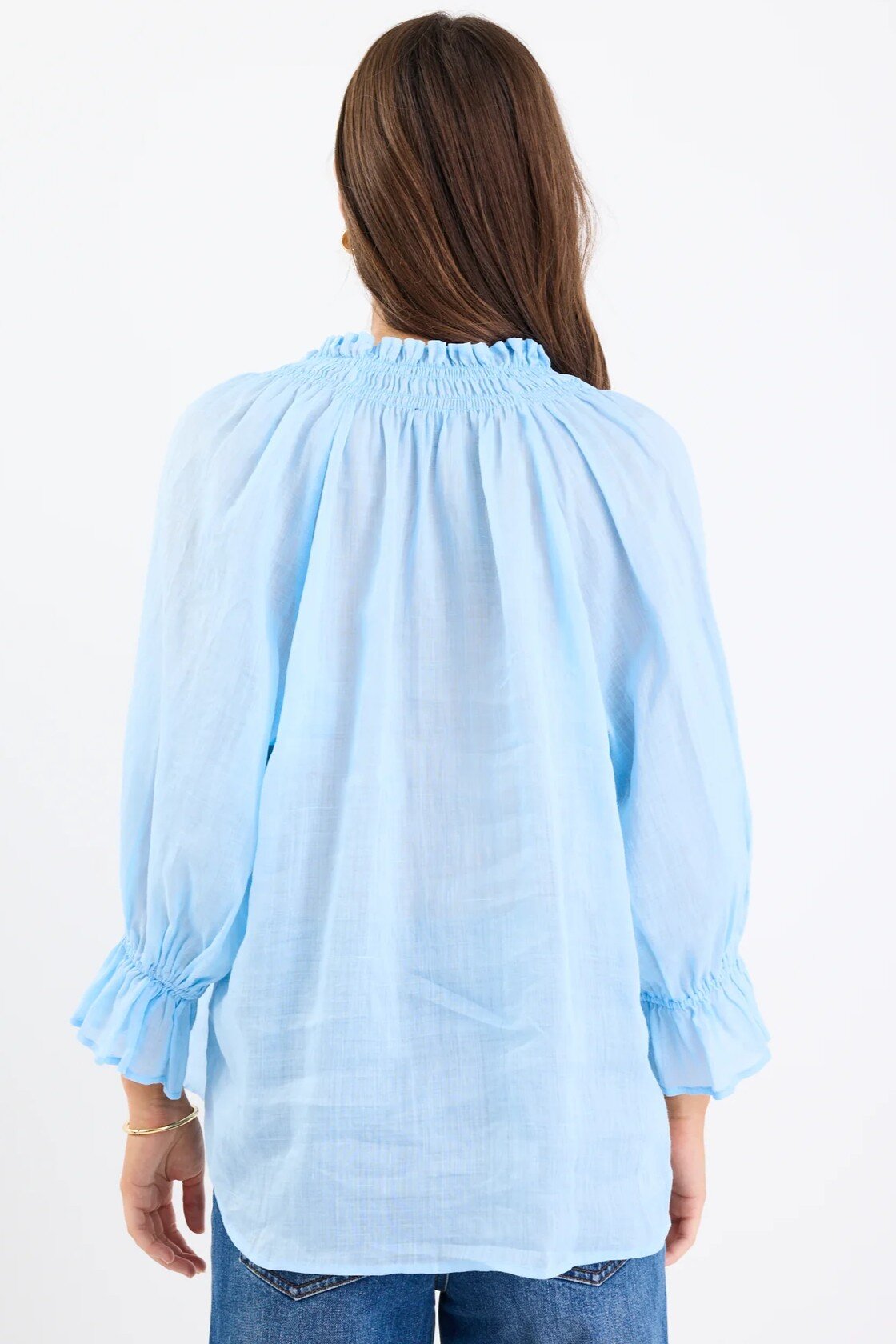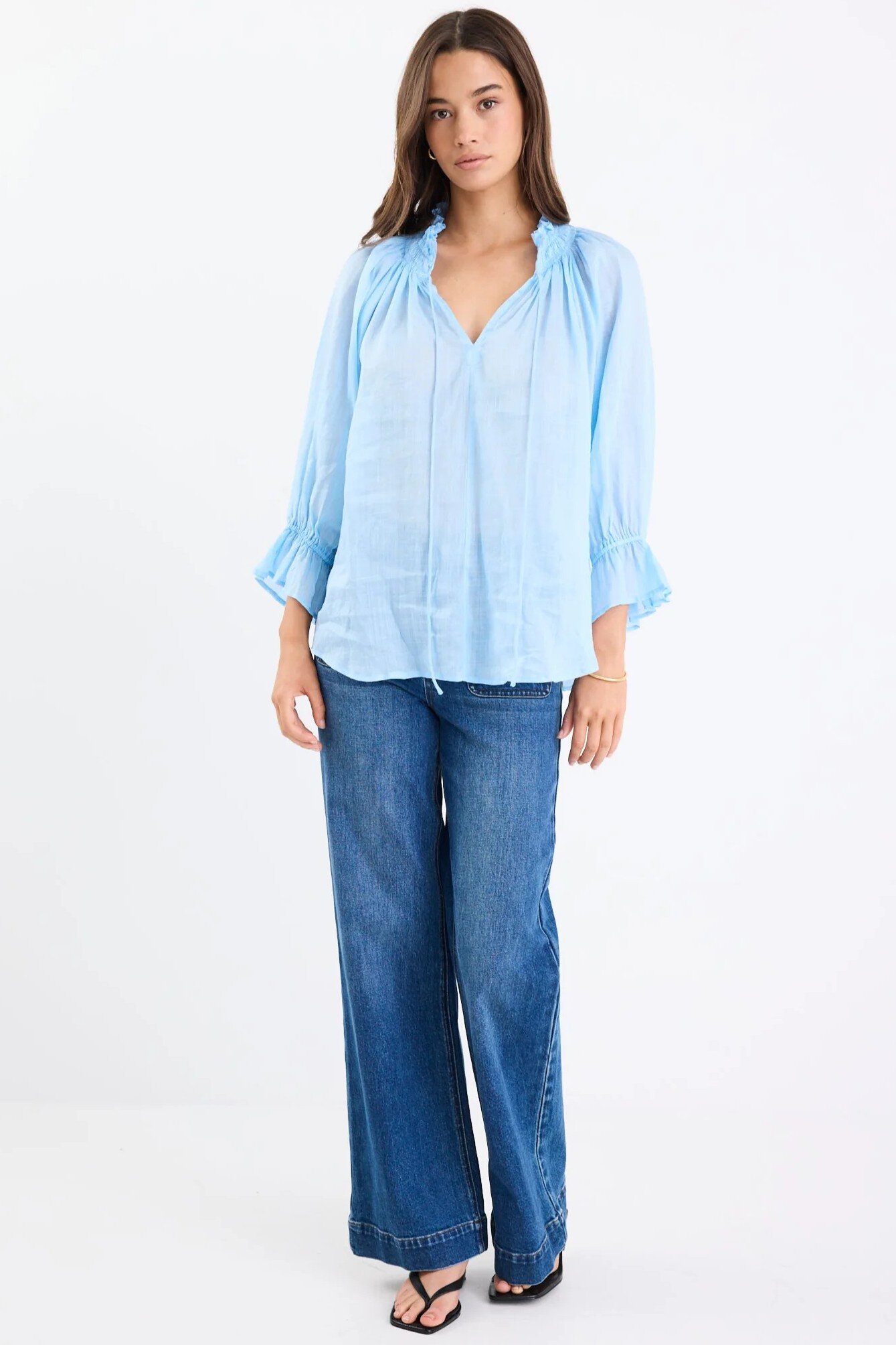 Light and breezy, the Expedition Ice Blue Top is an effortless staple for any wardrobe. The soft, fabric drapes beautifully, while delicate ruffle cuffs and tie detailing at the neckline add a feminine touch. This top transitions seamlessly from casual days to elevated evenings. Pair it with a mini skirt and sneakers for an easy daytime look or tuck it into tailored pants for a chic, polished finish.