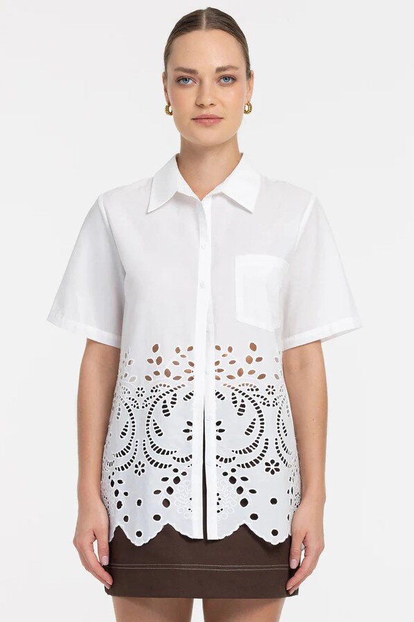 Fresh, feminine, and beautifully detailed, the Felix Shirt elevates classic cotton shirting with intricate anglaise embroidery. The crisp white upper meets a statement scalloped hem, enriched with ornate cutwork that feels both modern and romantic. Its relaxed, easy silhouette creates effortless movement, making it the perfect piece to dress up or down - from long lunches to balmy summer evenings. A truly special addition to any warm-weather wardrobe.