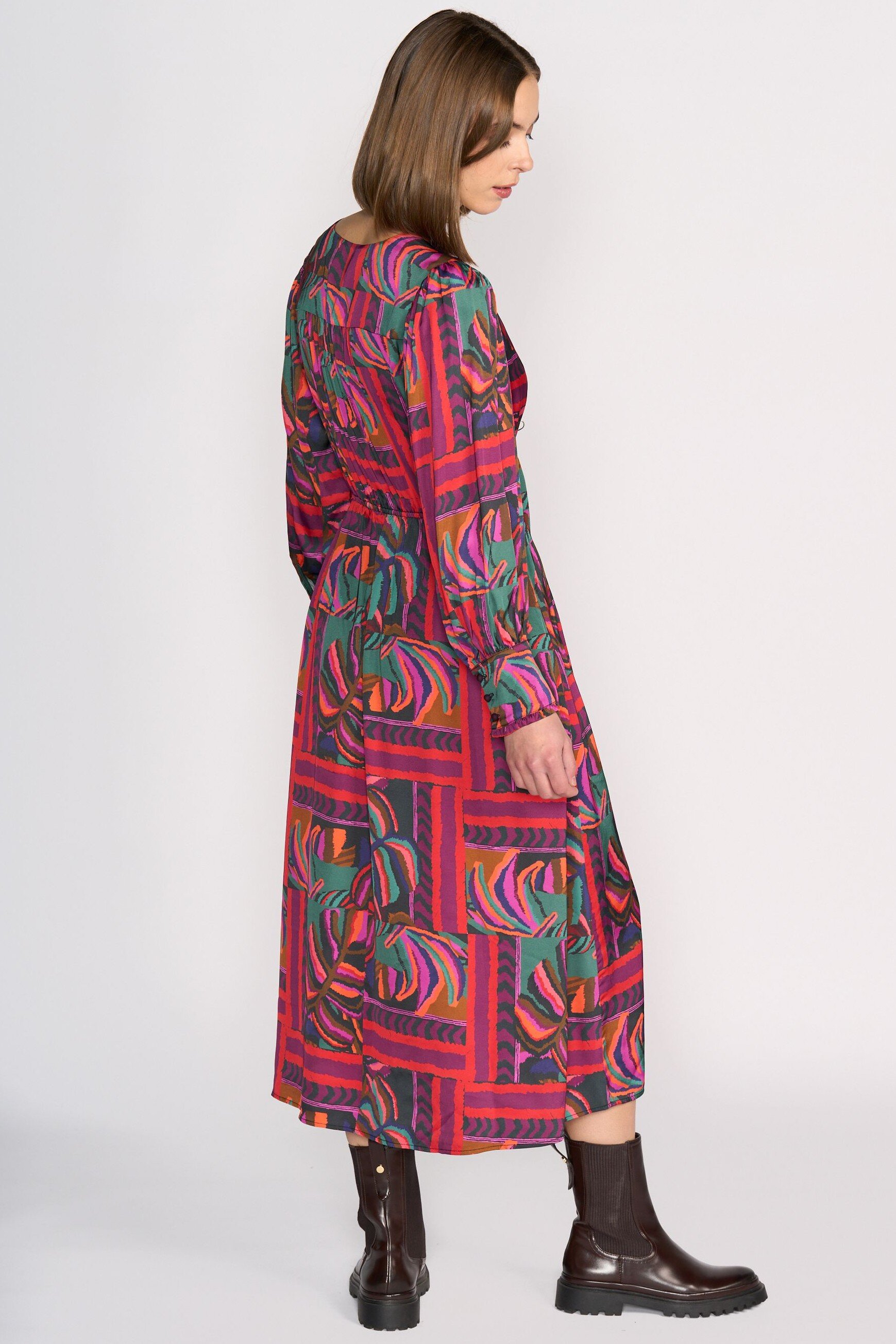 Long sleeve winter dress made from a fluid, silky viscose-rayon blend, featuring the Sunset print in bold pink-red, mauve, orange, green and deep blue tones. Designed with a relaxed silhouette, V-neckline and softly shaped waist seam.