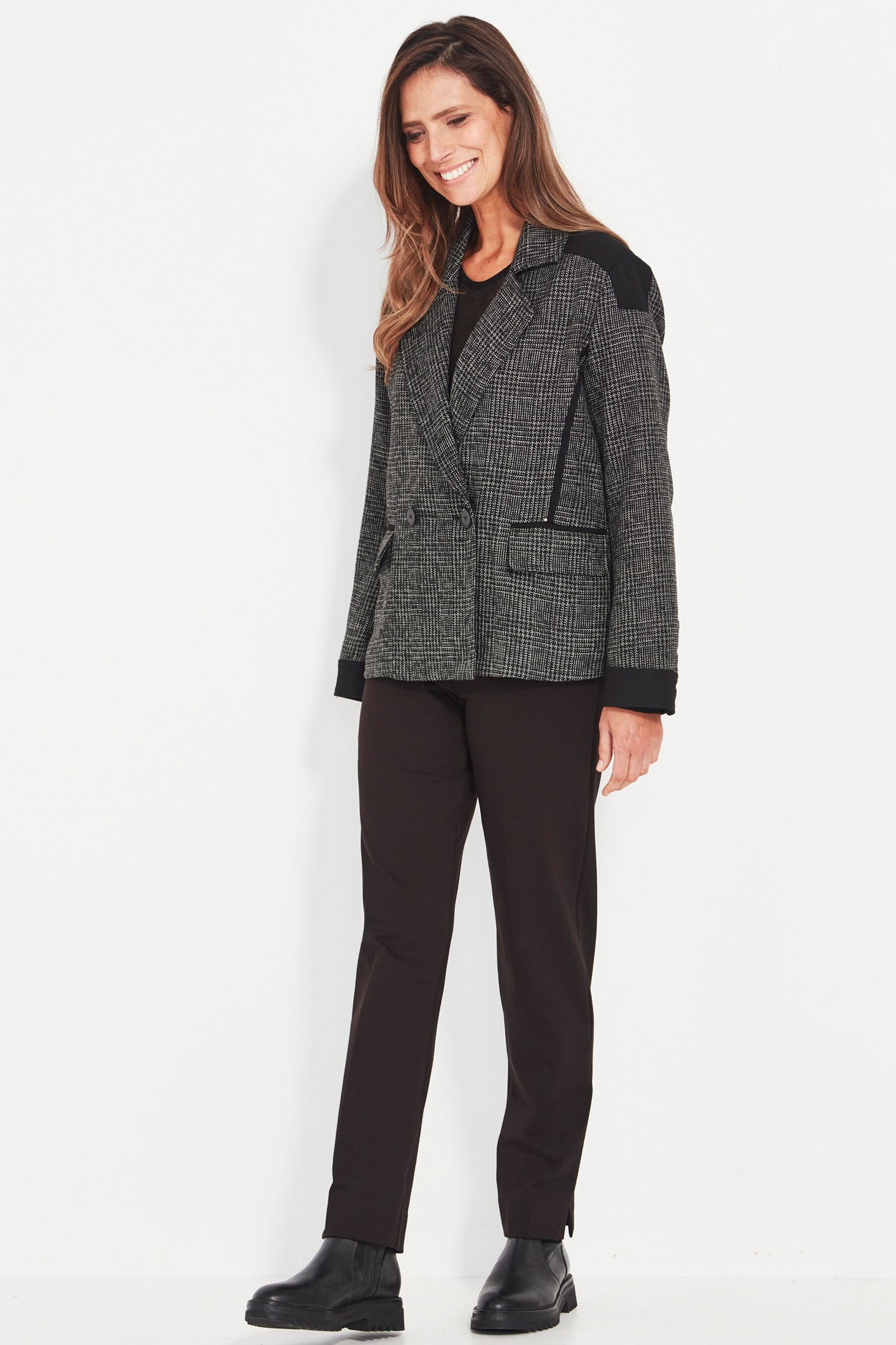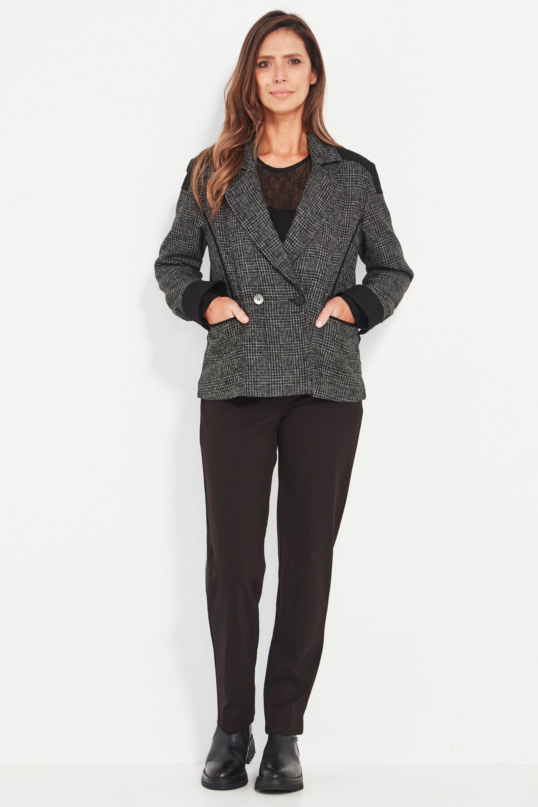 The Flo jacket features a refined checked pattern, elevated with black contrast detailing for a sleek, modern finish. The double-breasted front brings a tailored edge, while the fully lined interior ensures comfort, structure, and a smooth fit.