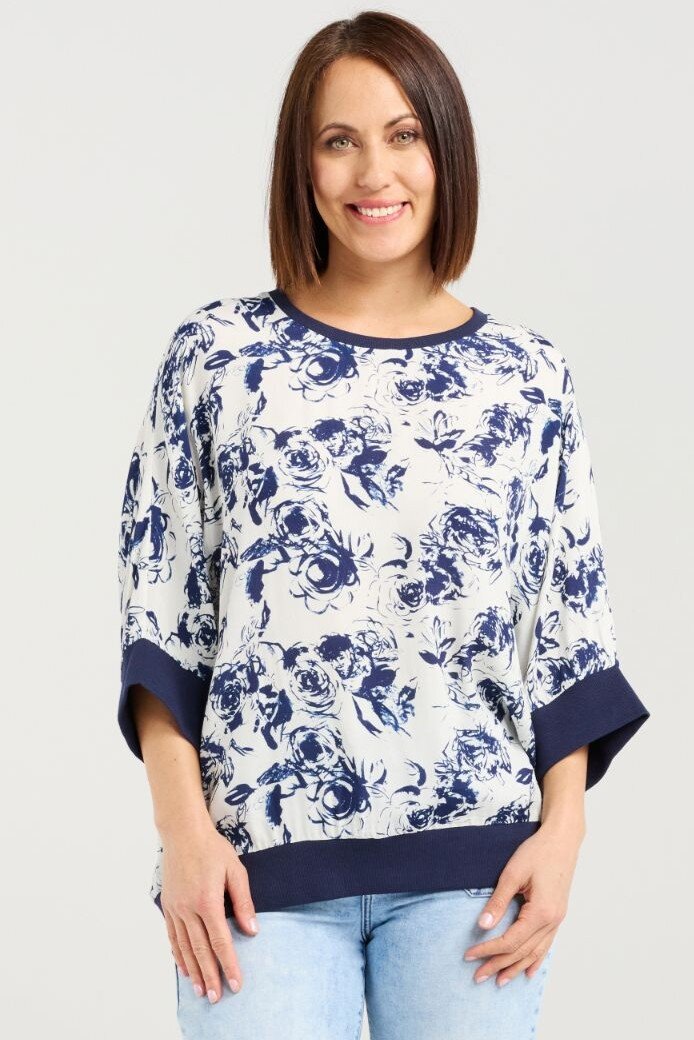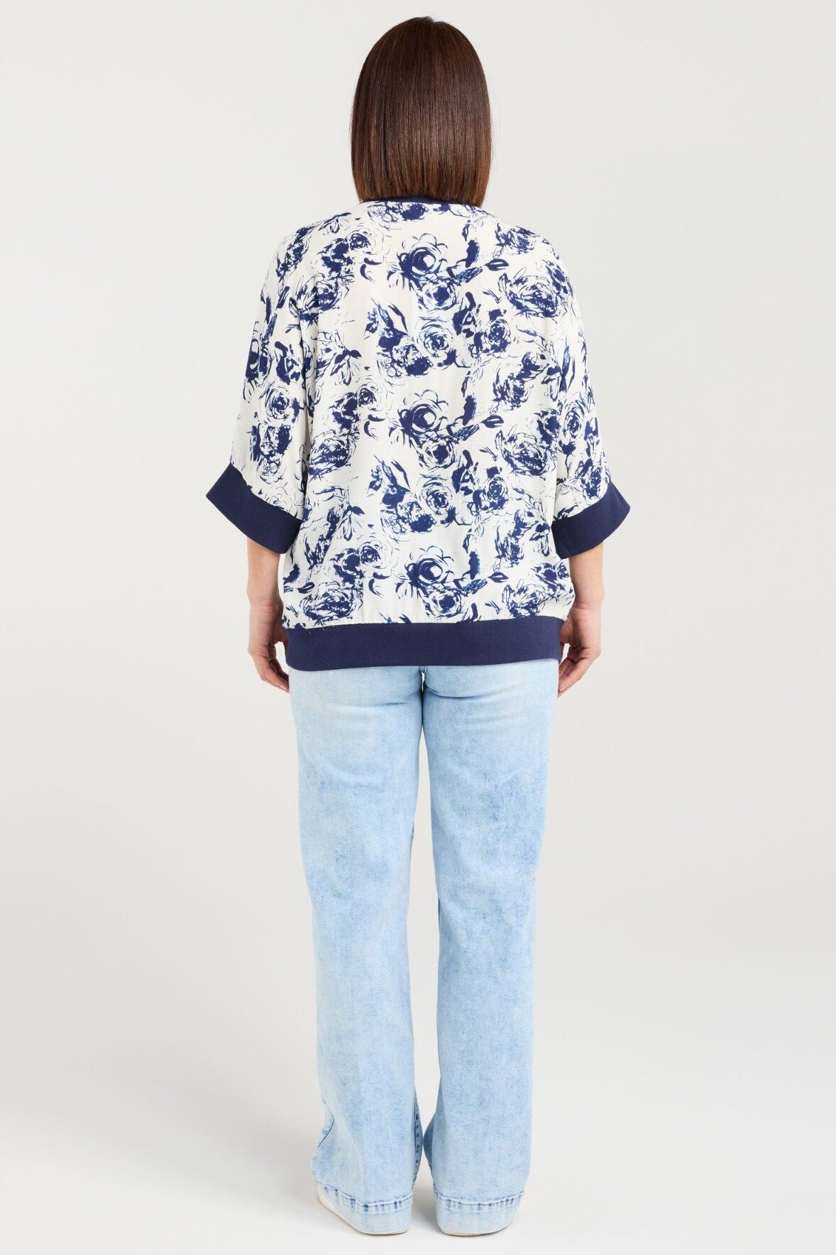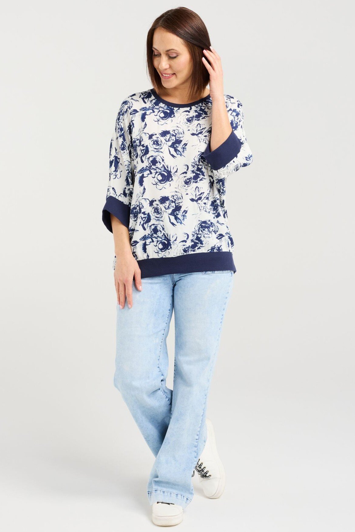 This relaxed-fit top features below-elbow sleeves finished with wide blue elasticated cuffs and a matching hem for a polished, comfortable fit. Crafted in a fresh blue and white floral fabric, it brings a light, cheerful touch to winter layering while keeping an effortless silhouette.
